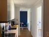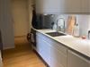In der angrenzenden Küche gibt es einen Herd und einen Backofen, einen Kühlschrank und einen Geschirrspüler.