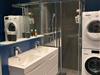 Das Badezimmer verfügt über eine gute Dusche, zwei Waschbecken, eine Toilette und Regale, eine neue Miele-Waschmaschine und einen Trockner.