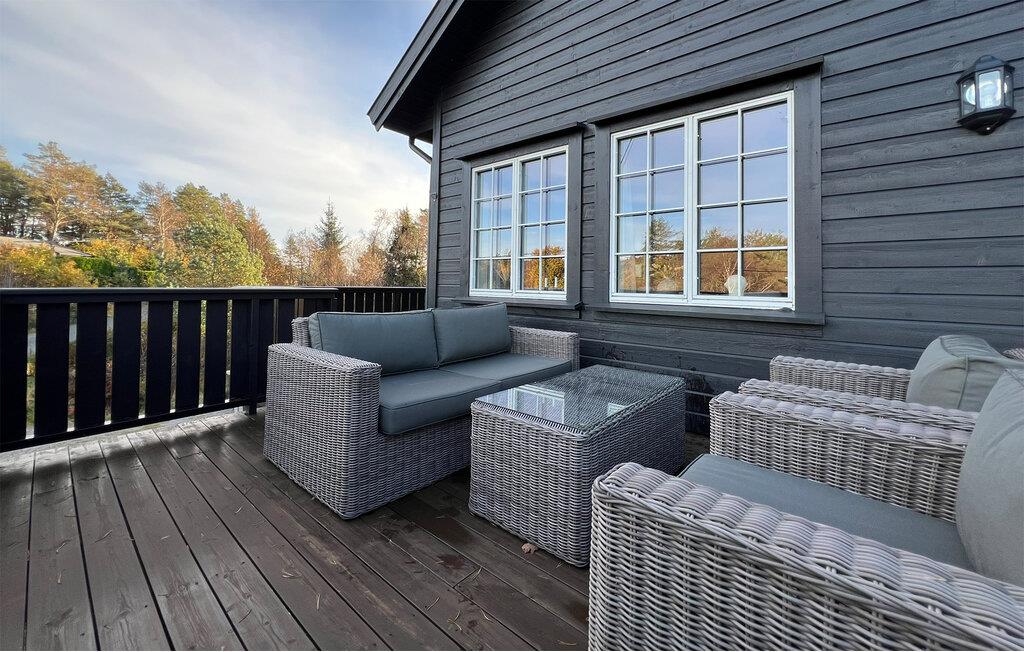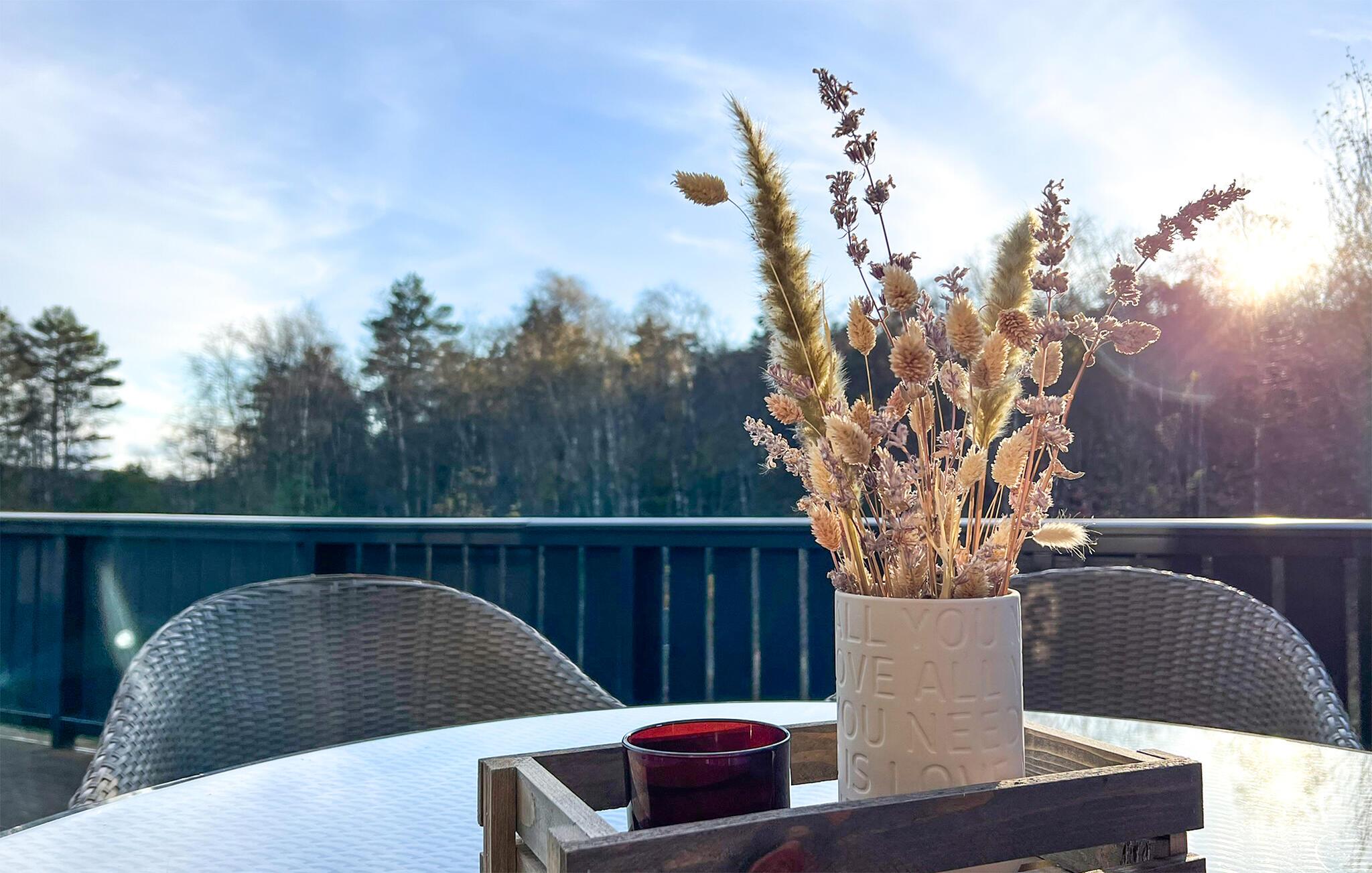 Ihr Ferienhaus bietet zwei schöne Terrassen, die es Ihnen ermöglichen, das Leben im Freien in vollen Zügen zu genießen. Die ostseitige Terrasse ist ideal, um den Tag mit einer Tasse Kaffee zu beginnen, während Sie den Sonnenaufgang über der Landschaft beobachten. Genießen Sie hier Ihr Frühstück und lauschen Sie dem Vogelgesang. Die westseitige Terrasse ist ideal für Nachmittage und Abende, an denen Sie entspannte Stunden mit der Familie oder mit Ihren Freunden verbringen können.