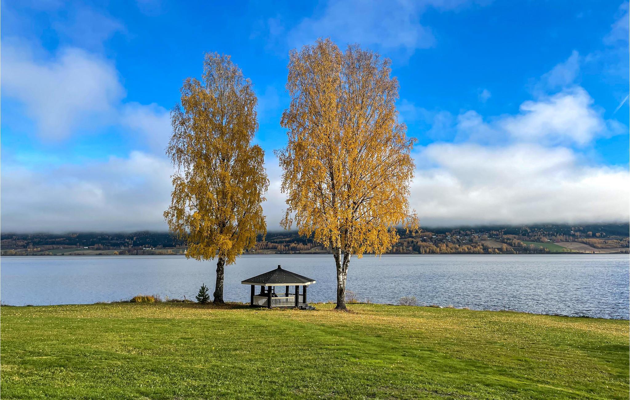 Auch draußen auf der Terrasse können Sie die Aussicht in vollen Zügen genießen. Das Haus hat einen eigenen Badesteg und Schwimmbereich, so dass Sie sich an warmen Tagen jederzeit abkühlen können, der Besitzer verleiht auch Kanus für Paddeltouren auf dem Randsfjorden.
