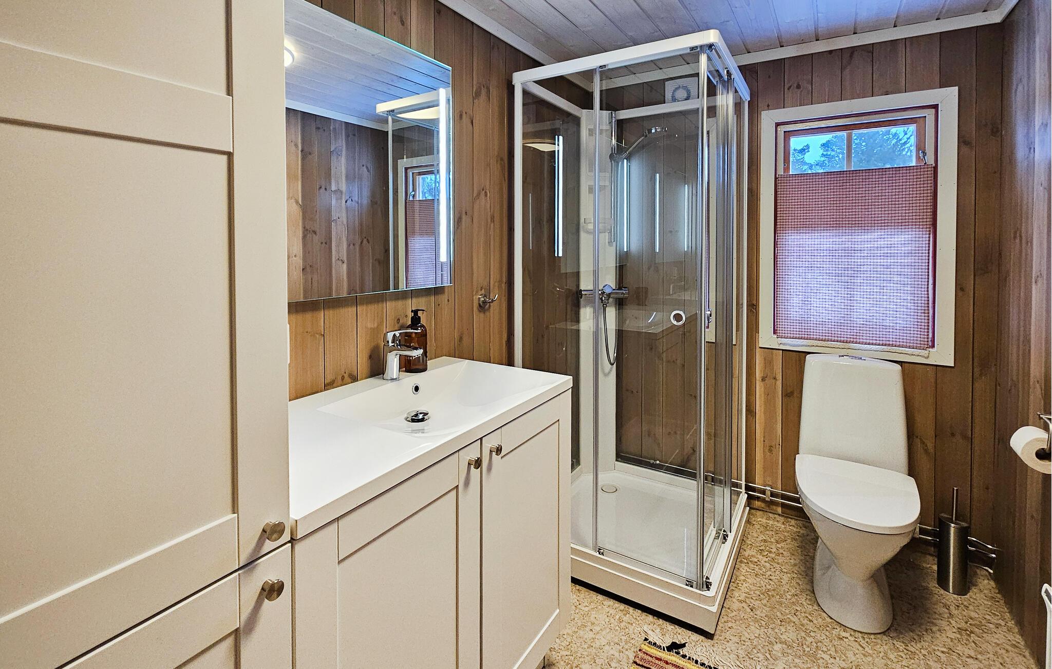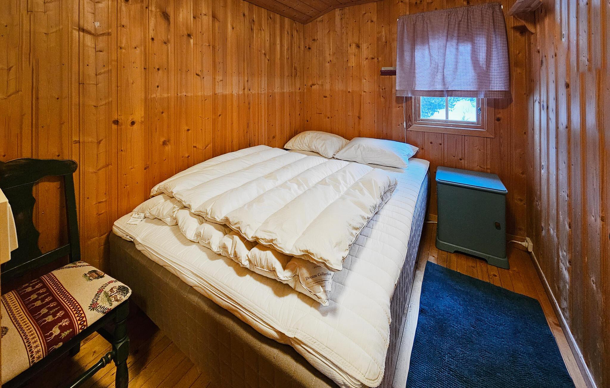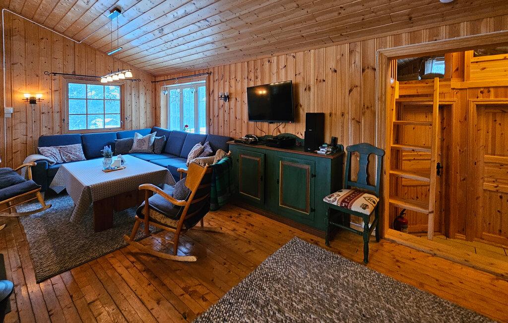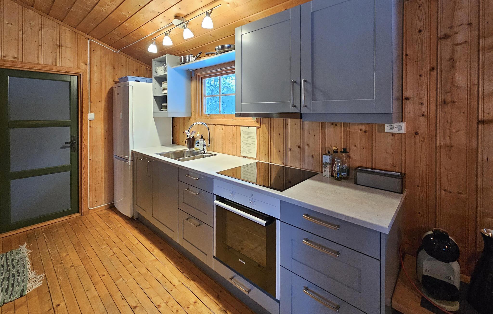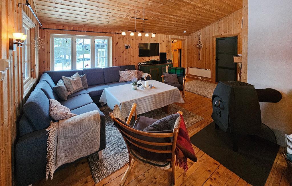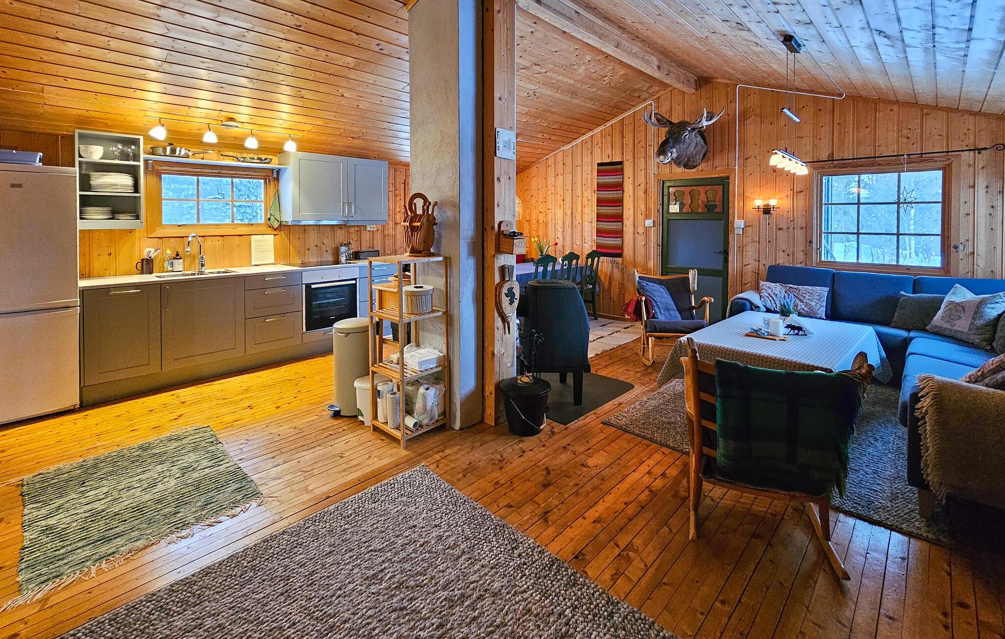 Dieses komfortable Ferienhaus liegt eingebettet in eine malerische Naturlandschaft und bietet neben viel Ruhe eine gemütliche Wohlfühlatmosphäre in seinen holzgetäfelten Räumlichkeiten. Schwingen Sie den Kochlöffel in der offenen, gut ausgestatteten Küche und genießen Sie Ihre Mahlzeiten in der behaglichen Essecke. Entfachen Sie den Kamin und machen Sie es sich auf der großen Sofalandschaft bequem.