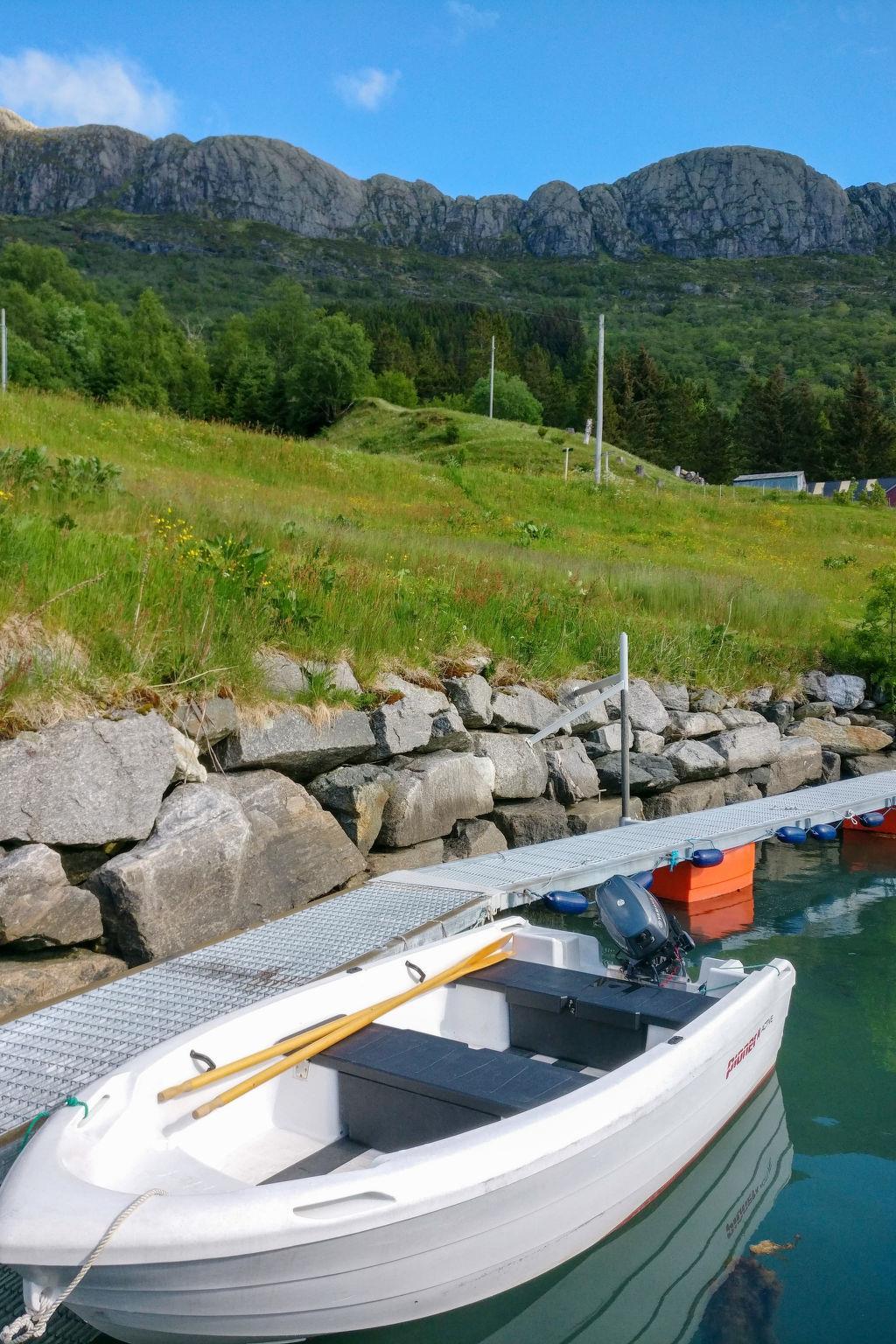 "Idun", 4-Zimmer-Haus 60 m2 auf 2 Stockwerken. Gemütlich und mit viel Holz eingerichtet: Wohn-/Esszimmer mit Schwedenofen, Esstisch, Sat-TV, Internationale TV-Sender und DVD. 2 Zimmer, jedes Zimmer mit 1 Doppelbett. Offene Küche (4 Kochplatten, Backofen, Geschirrspüler, Tiefkühler, elektrische Kaffeemaschine). Dusche/WC. Obergeschoss: (steile Treppe) abgeschrägte, offene Galerie mit 2 Betten (75 cm). E-Heizung, Fussbodenheizung. Terrasse teilweise überdacht. Terrassenmöbel, Gartengrill. Sicht auf das Meer und fjord. Zur Verfügung: Waschmaschine. Internet (WLAN, gratis). Bitte beachten: Rauchmelder, Feuerlöscher. Gefriertruhe ca. 210 l. Anstelle eines abgeschlossenen Schlafzimmers befinden sich manche Schlafplätze in einem offenen Bereich (Galerie, Nische etc.). 924531169