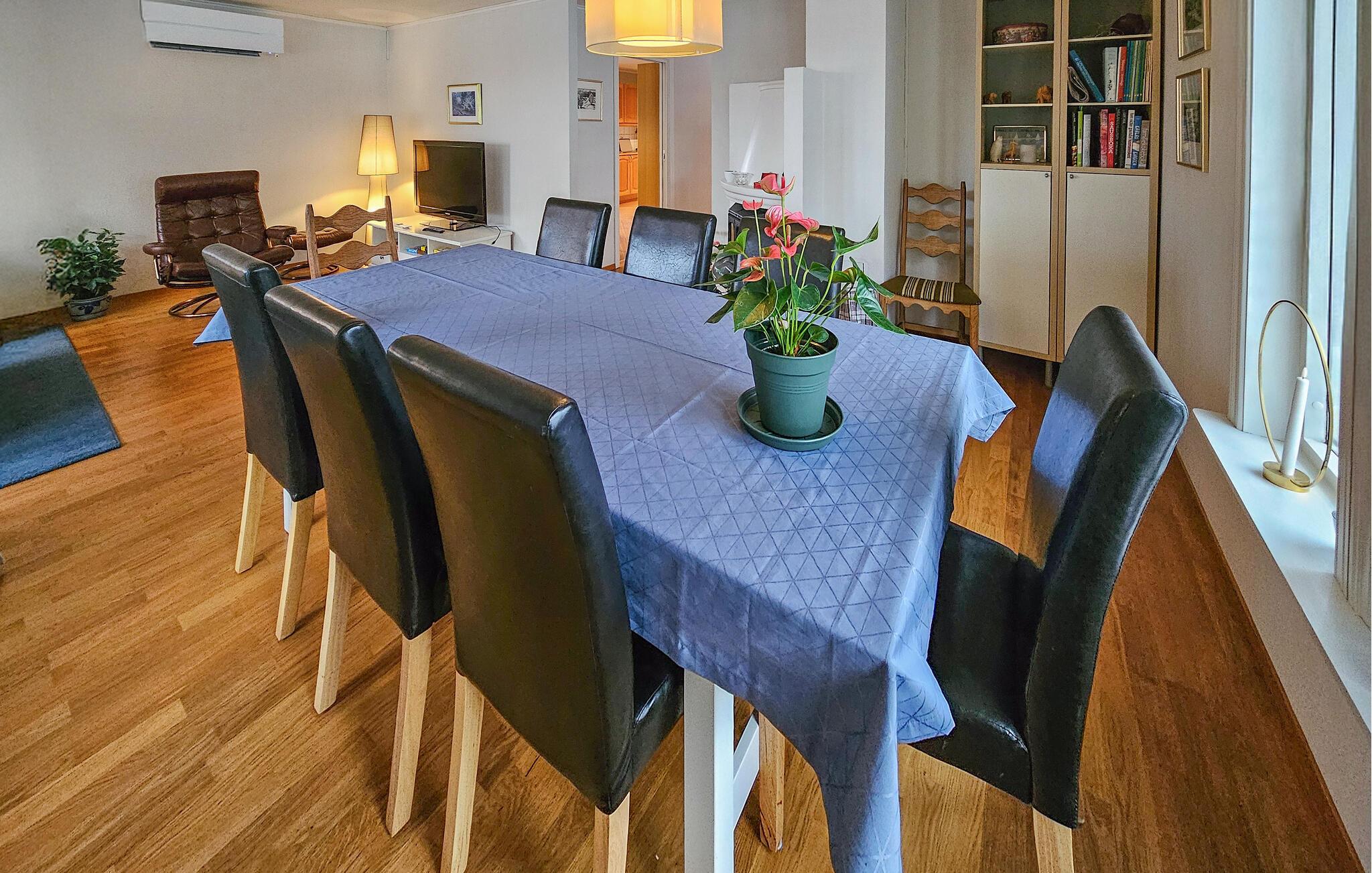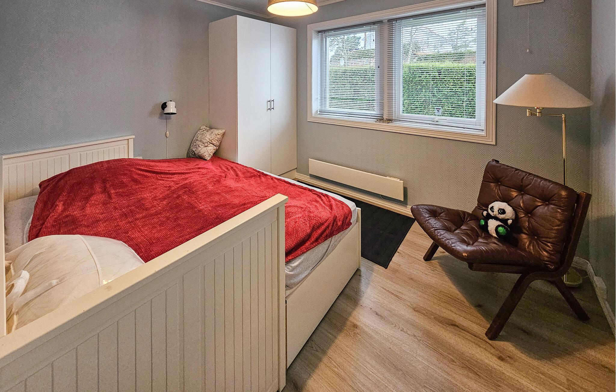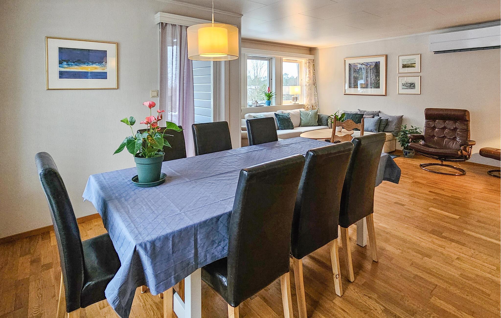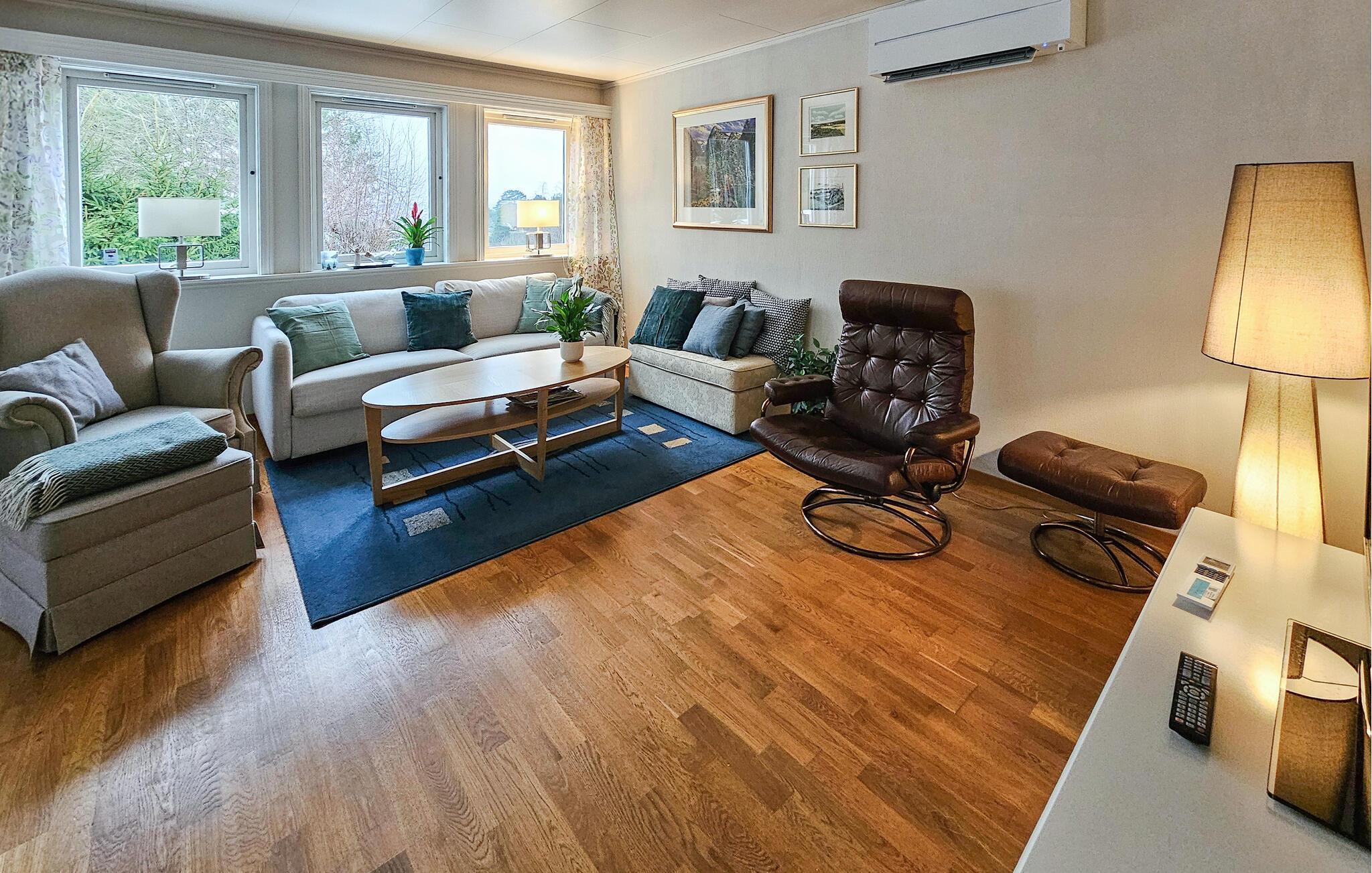Dieses charmante Ferienhaus, etwas südlich von Sandefjord gelegen, bietet Ihnen eine ideale Mischung aus Komfort, Natur und Erholung. Egal ob Sie einen Badeurlaub planen, die Küstenlandschaft erkunden oder einfach nur entspannen möchten, hier sind Sie genau richtig. Das Innere des Hauses ist gemütlich und stilvoll eingerichtet. Der helle Wohnbereich lädt mit komfortablen Sofas, einem großen Fernseher und liebevollen Details zum Verweilen ein. Genießen Sie die warme Atmosphäre des Kaminofens im Essbereich und verbringen Sie gesellige Abende mit der Familie oder Freunden. Die gut ausgestattete Küche mit einer großzügigen Arbeitsfläche bietet Ihnen alles, was Sie für die Zubereitung köstlicher Mahlzeiten benötigen. Ein geräumiges Esszimmer sorgt für ausreichend Platz für gemeinsame Mahlzeiten.