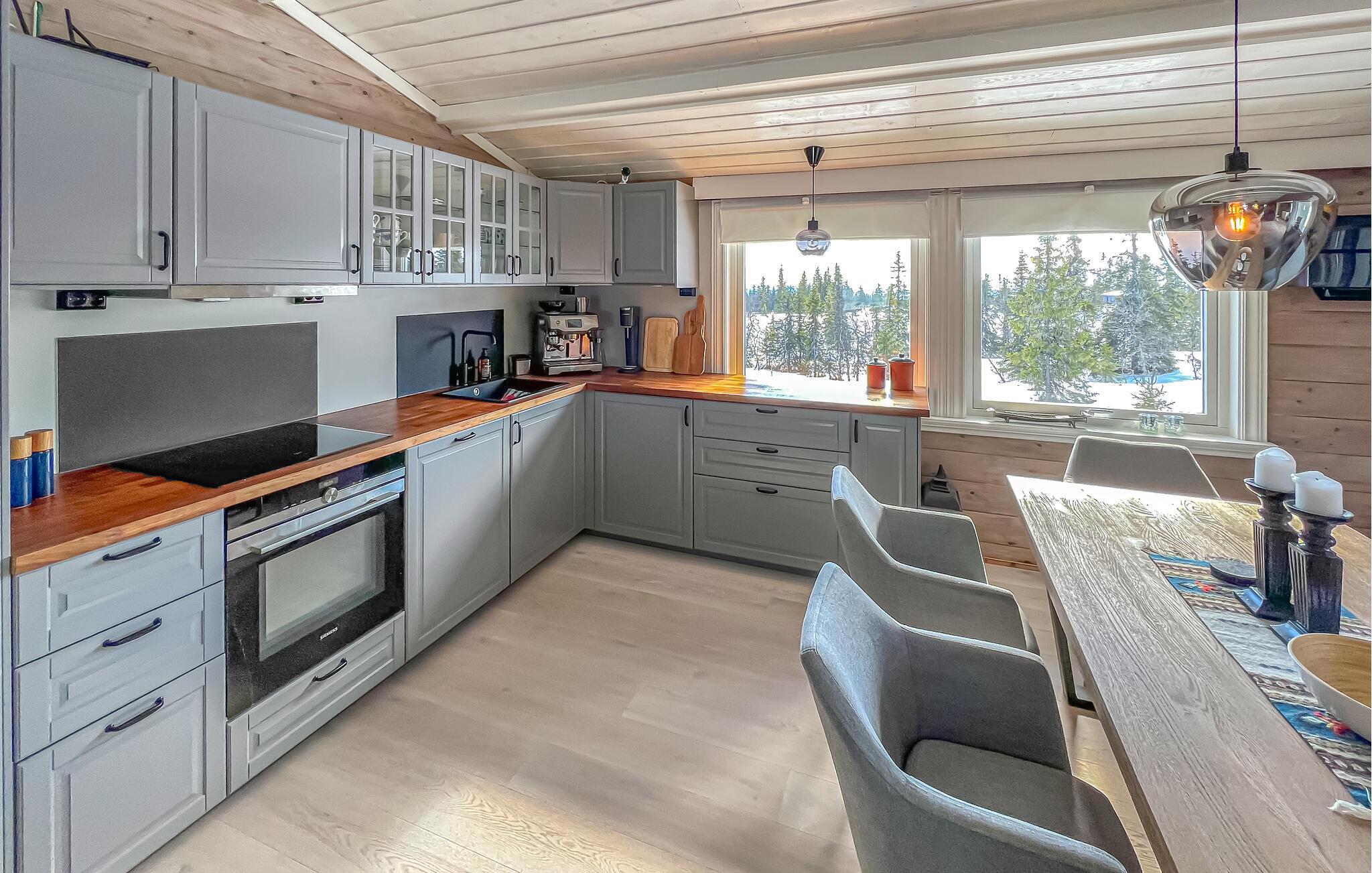 Eingebettet in eine wunderschöne Naturlandschaft bietet Ihnen diese stilvoll eingerichtete Hütte die Möglichkeit, in ruhiger Lage zu entschleunigen. Lassen Sie sich beim Kochen in der geräumigen Küche vom Blick in die Landschaft inspirieren und freuen Sie sich auf gemeinsame Mahlzeiten im hellen Essbereich. Entspannen Sie abends im behaglichen Wohnzimmer vor dem knisternden Kamin, streamen Sie einen spannenden Film oder widmen Sie sich auf dem bequemen Lesesessel einem guten Buch.