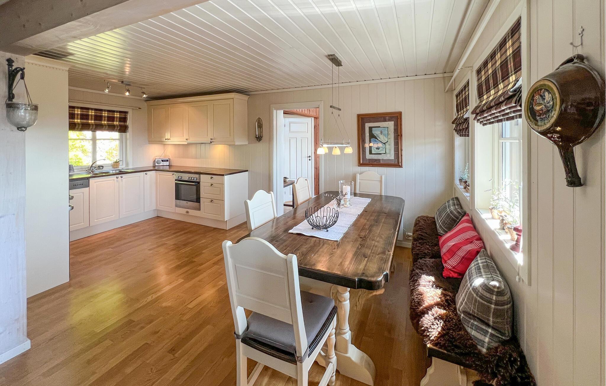 In diesem charaktervollen Haus vereinen sich Komfort und Behaglichkeit zu einem stilvollen Ganzen. Bodentiefe Fenster lassen das helle Tageslicht in die Wohnräume, während bequeme Sofas und Sessel zu einer entspannten Auszeit vom Alltag einladen. Wenn es draußen kühler ist, entzünden Sie den Kaminofen und entspannen sich bei wohliger Wärme. Bereiten Sie gemeinsam leckere Mahlzeiten in der modernen Küche zu und genießen Sie sie mit einem guten Glas Wein.