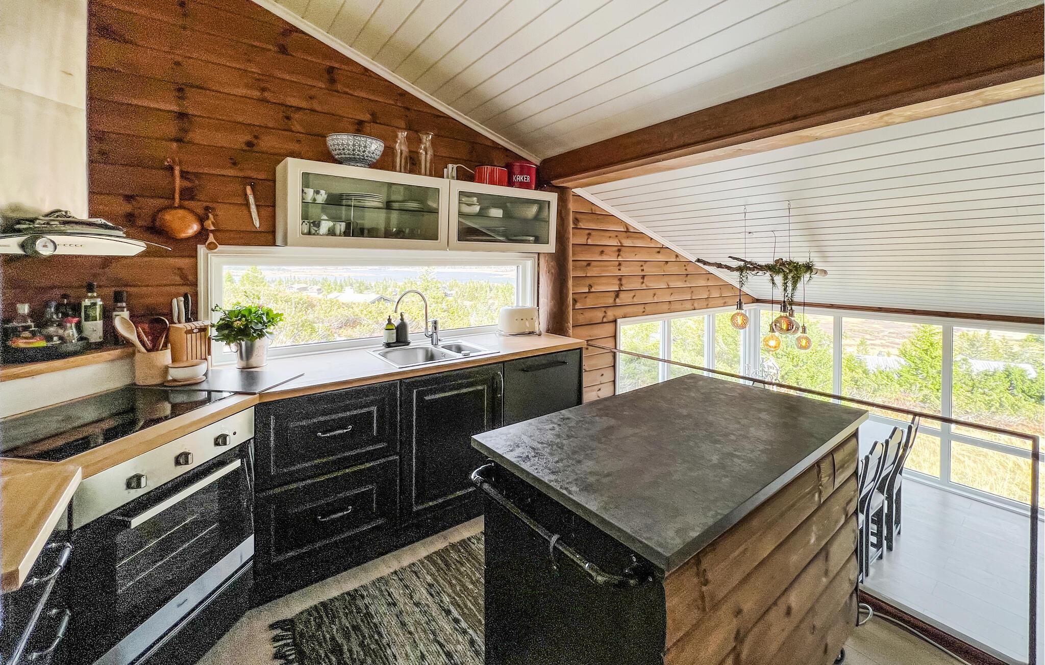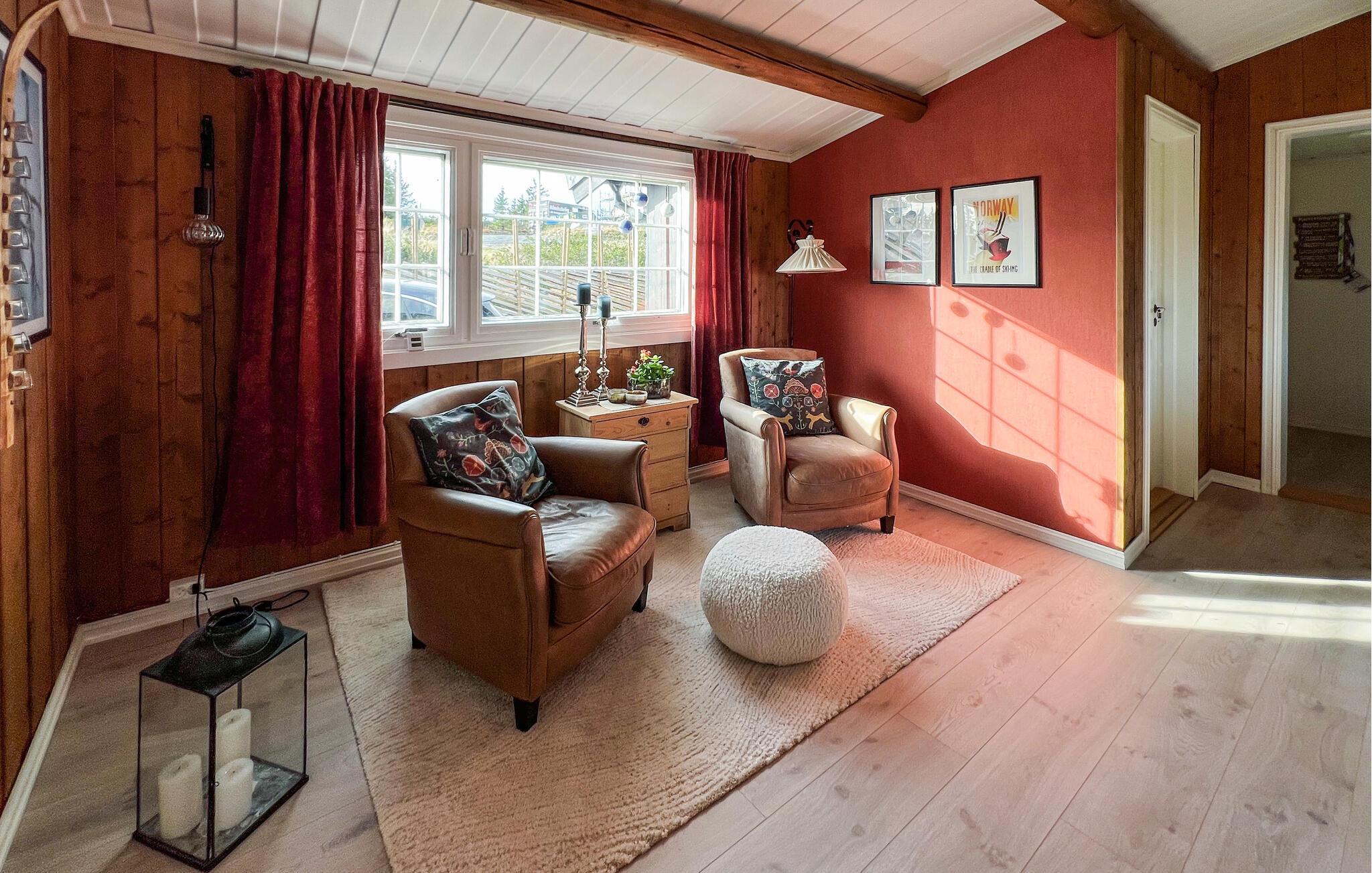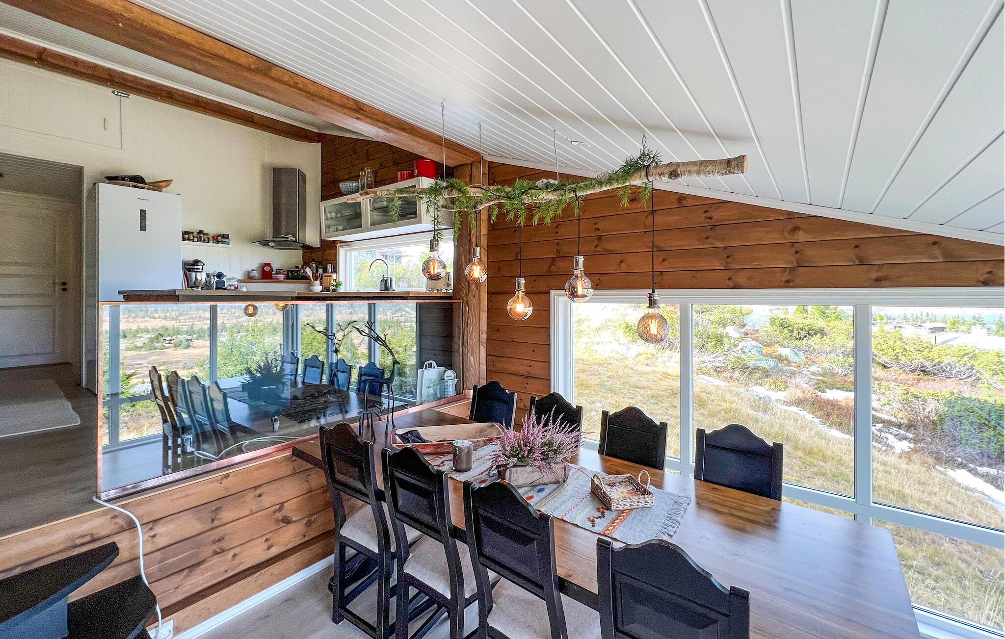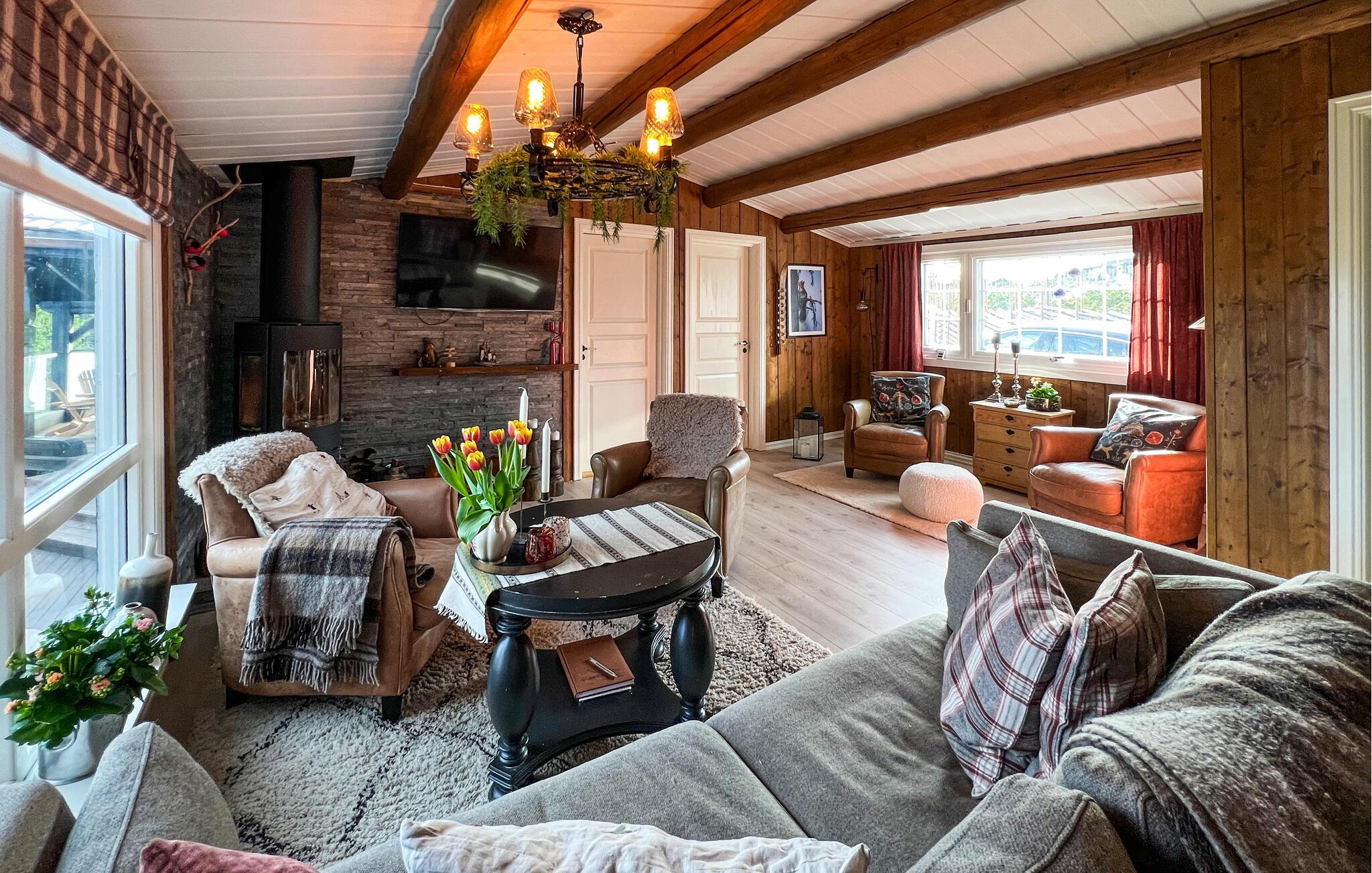 Genießen Sie eine Auszeit, in der Natur, Komfort und skandinavischer Stil miteinander verschmelzen. Dieses einladende Ferienhaus bietet Ihnen den idealen Rückzugsort, um mit Blick auf die umliegende Landschaft neue Energie zu tanken. Der offene Wohnbereich mit sichtbaren Holzbalken, großen Fenstern und einem knisternden Kaminofen schafft eine besonders behagliche Stimmung. Entspannen Sie auf dem komfortablen Sofa, genießen Sie die Aussicht oder verbringen Sie gesellige Stunden am Esstisch mit Platz für Familie und Freunde. Die Küche ist bestens ausgestattet – ideal, um regionale Spezialitäten zuzubereiten. In den gemütlichen Sitzecken finden Sie stets einen Ort zum Lesen, Plaudern oder einfach zum Innehalten.