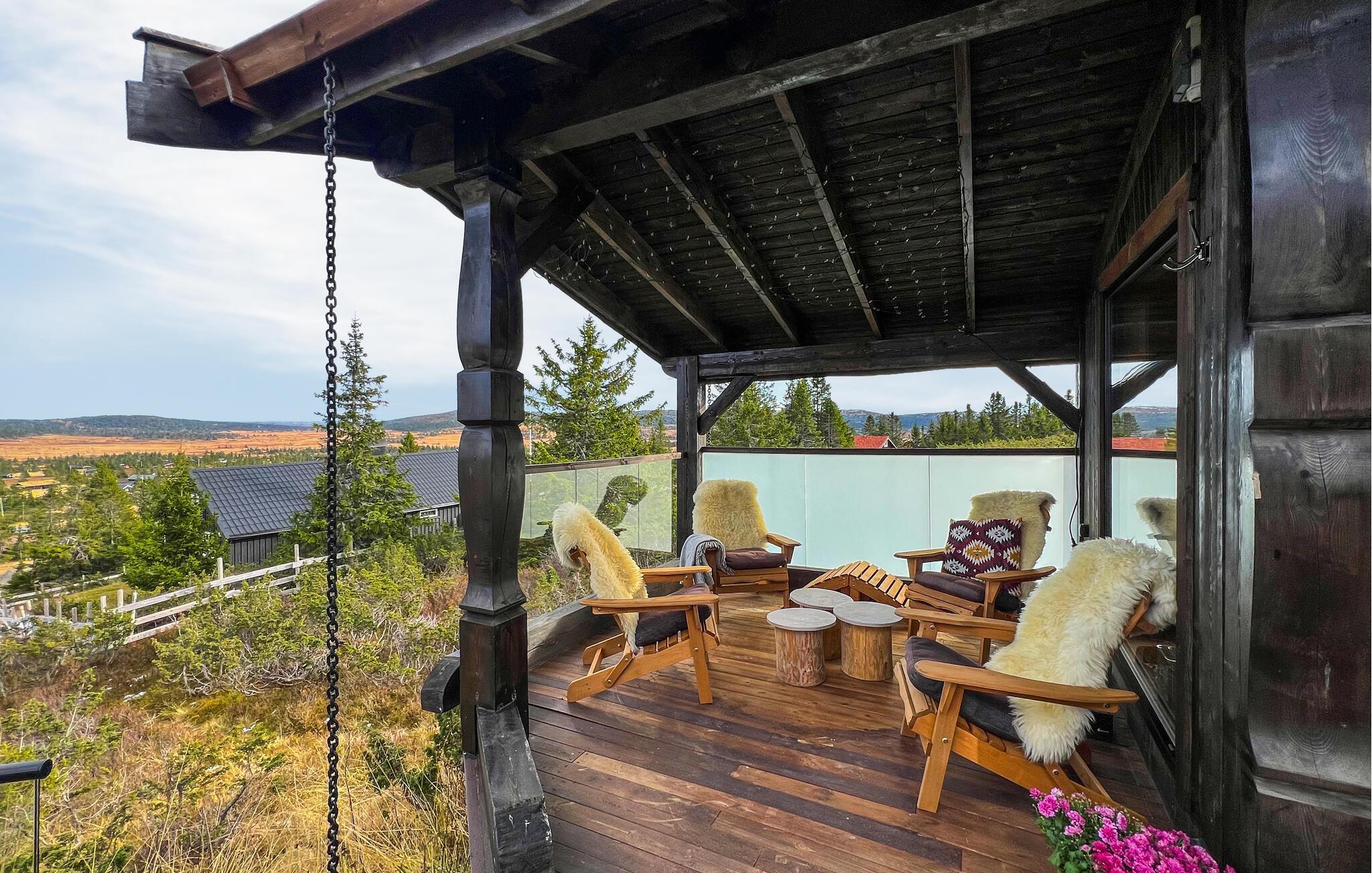 Gehen Sie hinaus auf die große Holzterrasse und atmen Sie die klare Bergluft. Nutzen Sie die überdachte Sitzecke für entspannte Stunden im Schatten oder genießen Sie sonnige Tage im Freien. Die Außensauna lädt zu wohltuender Entspannung ein, während die Feuerstelle und die rustikale Sitzgruppe schöne Plätze für lange Abende unter freiem Himmel bieten.