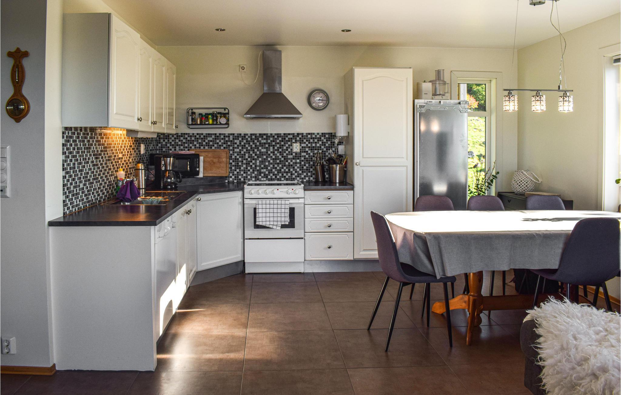 Das Ferienhaus ist warm und gemütlich eingerichtet. Sie können am Fenster sitzen und die Aussicht auf die Umgebung genießen, während Sie die Aktivitäten für den kommenden Tag planen. In der Küche können Sie einen frischen Fisch zum Abendessen zubereiten und am großen Esstisch gemeinsam essen.
