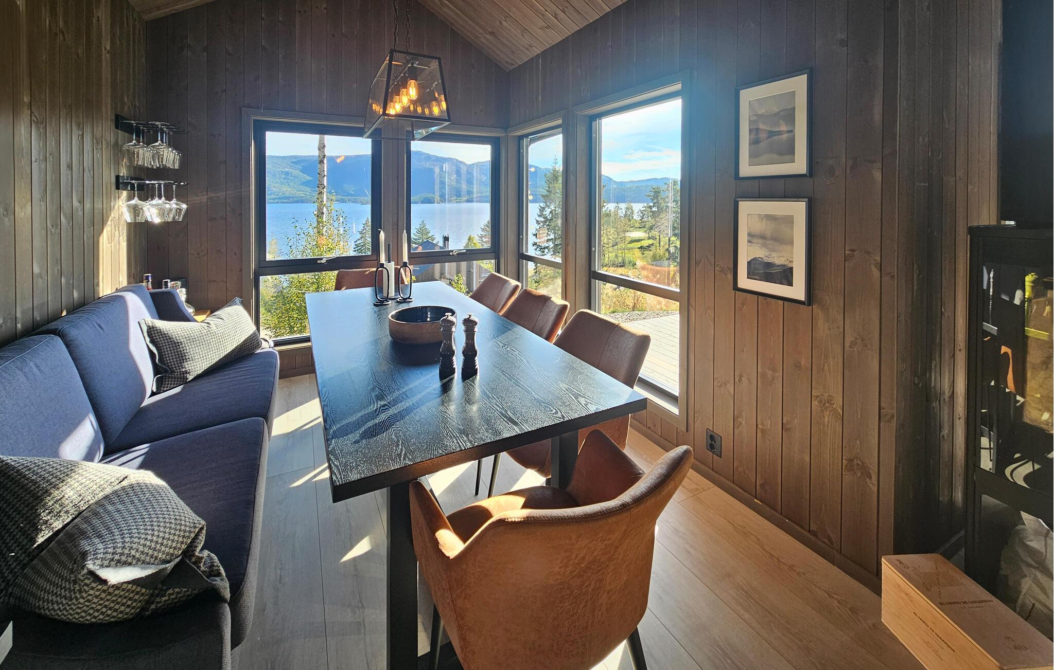 Entdecken Sie dieses moderne und gemütliche Ferienhaus in der Nähe von Treungen. Umgeben von malerischen Wäldern und mit Blick auf den See Nisser bietet das Haus eine idyllische Kulisse, die zum Entspannen einlädt. Genießen Sie die Ruhe auf der großzügigen Terrasse, während Sie den Panoramablick auf den See bewundern. Lassen Sie den Alltag hinter sich und starten Sie den Tag mit einem gemütlichen Frühstück im lichtdurchfluteten Wohnbereich. Der Kaminofen sorgt an kühlen Abenden für eine wohlige Atmosphäre, während die komfortablen Sitzgelegenheiten zu entspannten Stunden einladen. Bereiten Sie Ihre Mahlzeiten in der voll ausgestatteten Küche zu und genießen Sie diese am Esstisch mit Blick auf die beeindruckende Natur.
