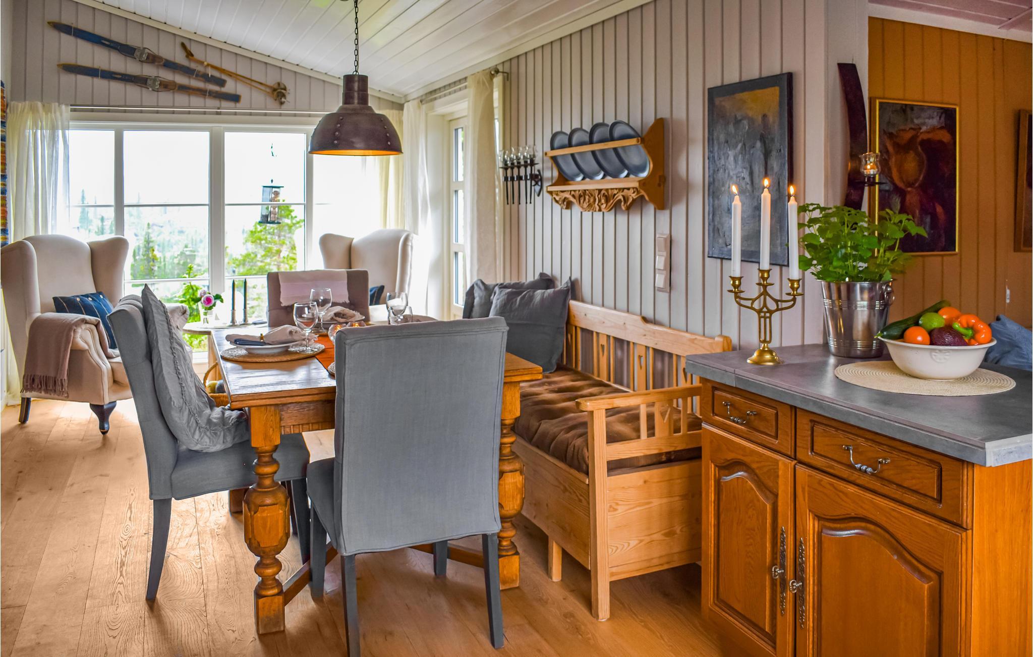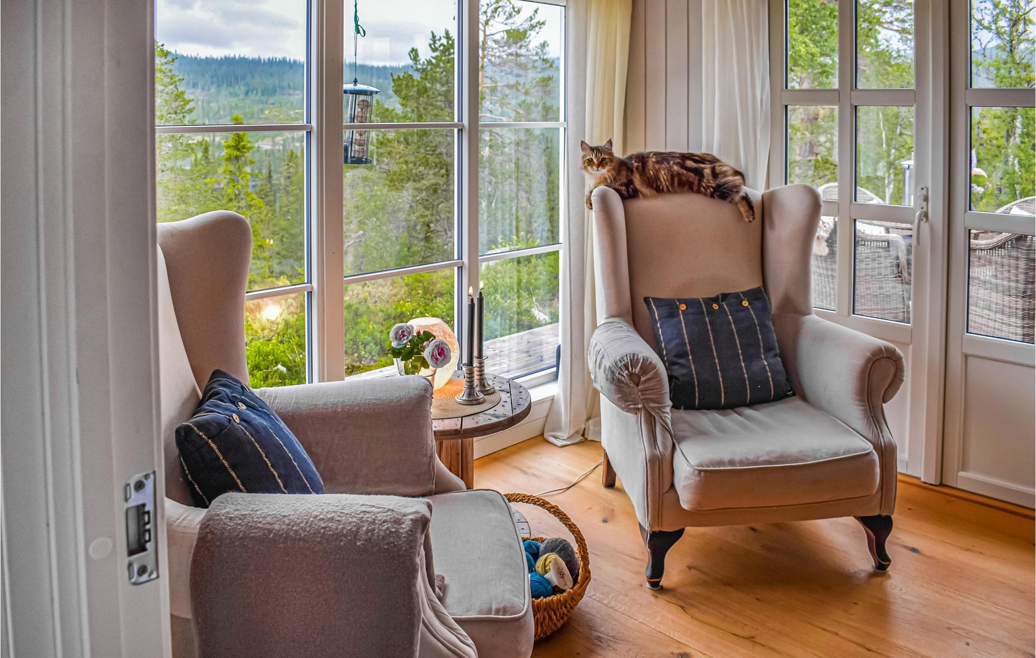 Dieses Ferienhaus ist der ideale Urlaubsort für ausgedehnte oder kurze Wanderungen und Angeltouren in der reizvollen Bergwelt Norwegens! Die Kombination aus dunkleren Holzmöbeln, ein einladenden Farbkonzept und vielen Kissen und Fellen macht die Hütte zu einem warmen, kuscheligen Wohlfühlort. Der Esstisch lädt zu einem lustigen Spielenachmittag oder Spieleabend mit Leckereien ein. Kuscheln Sie sich abends in die Kissen auf dem Sofa ein und plaudern Sie über Ihre morgige Gaustatoppen-Bergtour. Die abendlichen Speisen können Sie in der gut ausgestatteten Küche zubereiten und den Sonnenuntergang von der Terrasse aus genießen. Vor der Tür erwarten Sie eine verträumte Berglandschaft mit Wanderwegen und MTB-Strecken zum Entdecken. Mit dem hauseigenen Ruderboot können Sie leicht angeln gehen.