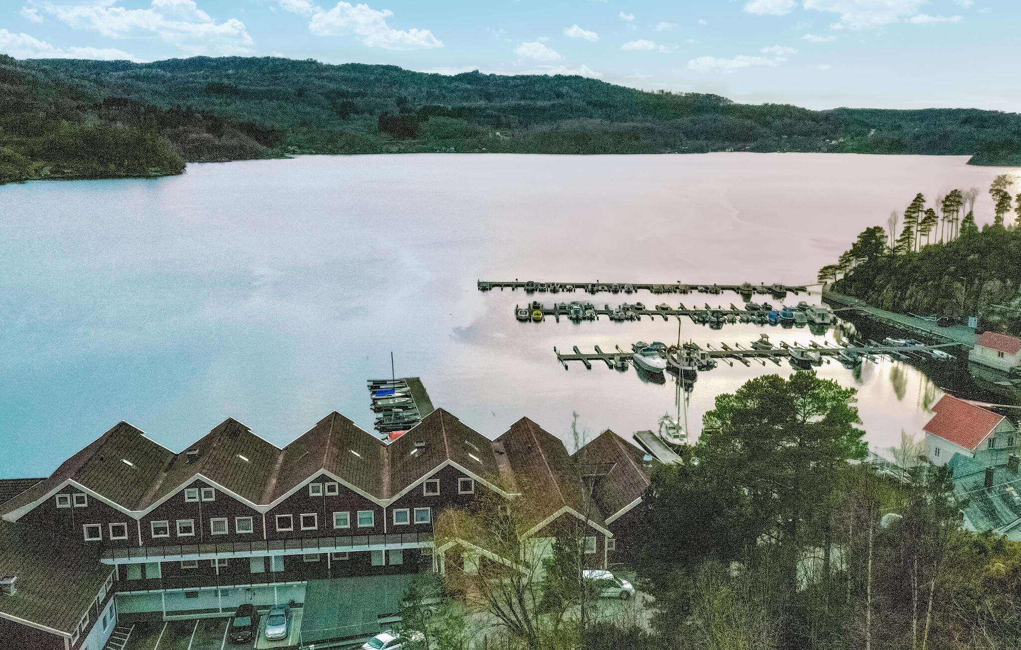 Die lichtdurchflutete Ferienwohnung empfängt ihre Feriengäste in wunderschöner Lage, am glitzernden Bjørnafjord. Im Inneren vermittelt die Kombination von den sommerlichen Farben Weiß und Hellblau die Nähe zum Meer. Egal, ob Sie in der offenen Wohnküche kochen, essen oder Karten spielen, durch die großen Panoramafenster können Sie immer den Fjord sehen. Gehen Sie auf die schöne Terrasse mit hervorragendem Blick auf den Fjord und den kleinen Jachthafen hinaus und entspannen sich nach einem erlebnisreichen Tag in den Lounge-Möbeln. Es gibt ein Restaurant im selben Gebäude und gute Angelmöglichkeiten vom Land aus.