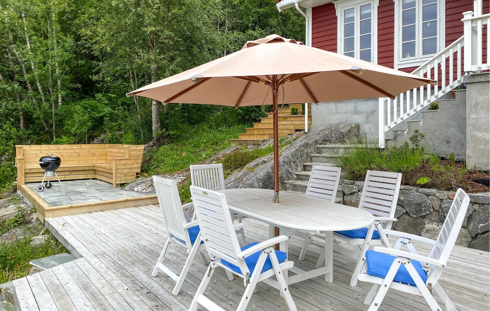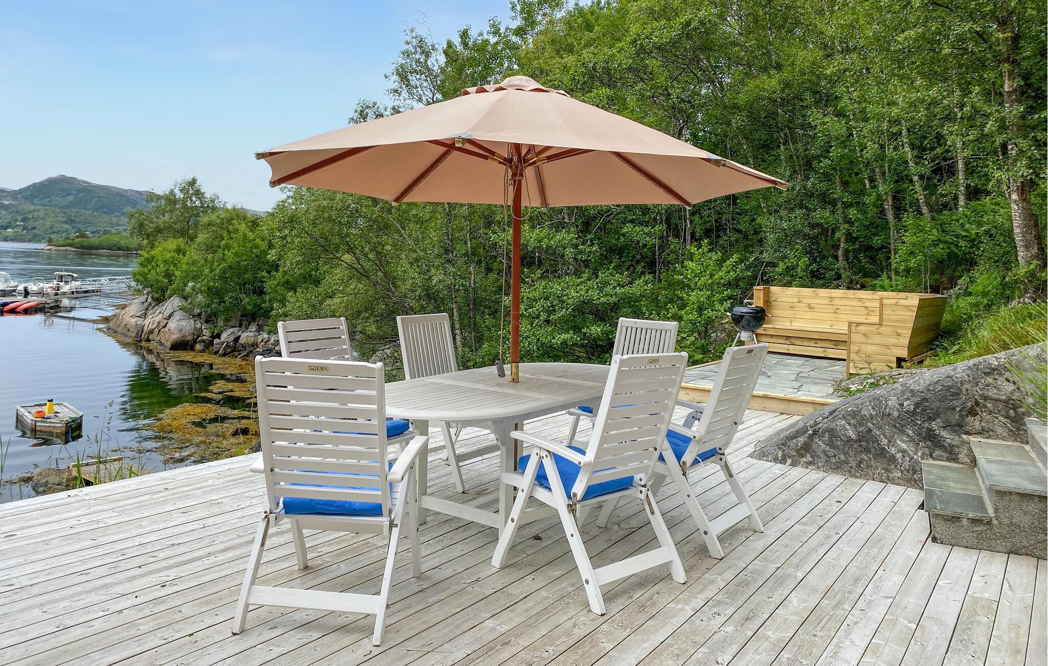 Ihr Ferienhaus liegt auf einem ungestörten Grundstück und besticht neben dem sagenhaften Fjordblick auch mit einem ganz besonderen traditionellen Charme. Der Innenbereich mit den sanften Farbtönen und den hellen Räumen schafft eine angenehme Atmosphäre. Die geräumige Küche ist ideal, wenn Sie gemeinsam Mahlzeiten zubereiten möchten, während die weichen Sofas im Wohnbereich zum Entspannen und zu Spiel und Spaß mit der ganzen Familie einladen. Gehen Sie auch hinaus auf die Terrasse im ersten Stock oder auf die große offene Holzterasse unten und genießen Sie einen kleinen Snack oder ein leckeres Getränk, während Sie den Blick schweifen lassen. Bade- und Angelmöglichkeiten liegen Ihnen hier quasi zu Füßen.
