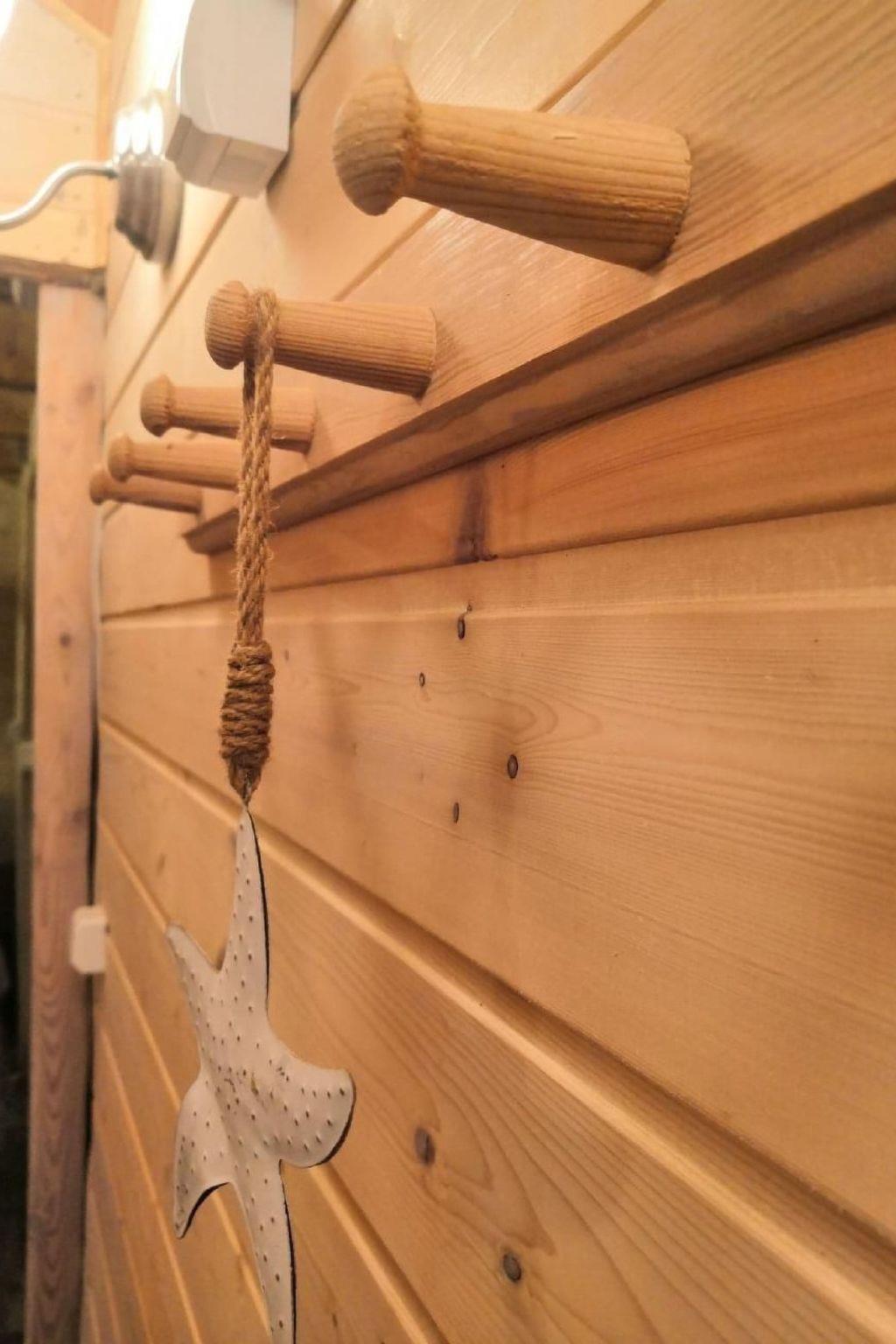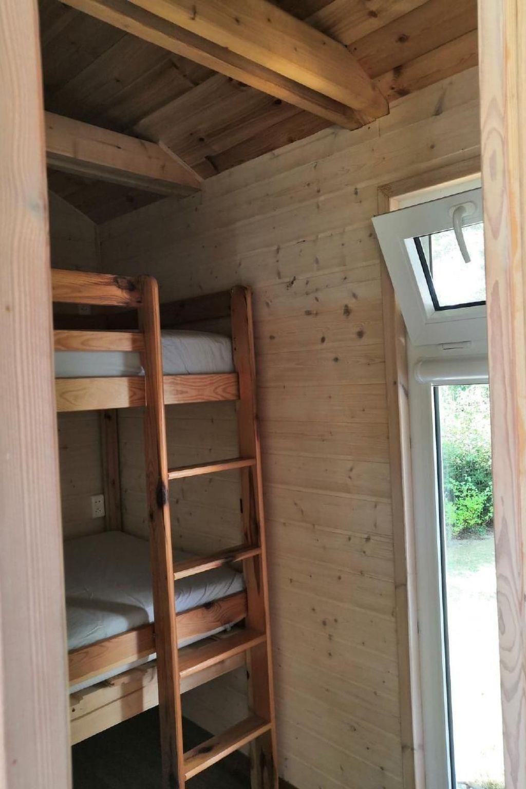 Das Innere des 20 m² großen Hauses bietet ein Wohnzimmer mit Kochnische, ausgestattet mit einem Schlafsofa für 2 Personen, ein Schlafzimmer mit Etagenbett (2 Matratzen 190/80 cm) und ein Badezimmer mit WC und Dusche. Außerdem gibt es einen Elektroherd, einen Kühlschrank, einen Wasserkocher, ein komplettes Set an Töpfen, Tellern und Besteck sowie eine elektrische Heizung und eine Hängematte, um Ihnen einen angenehmen und problemlosen Aufenthalt zu ermöglichen.