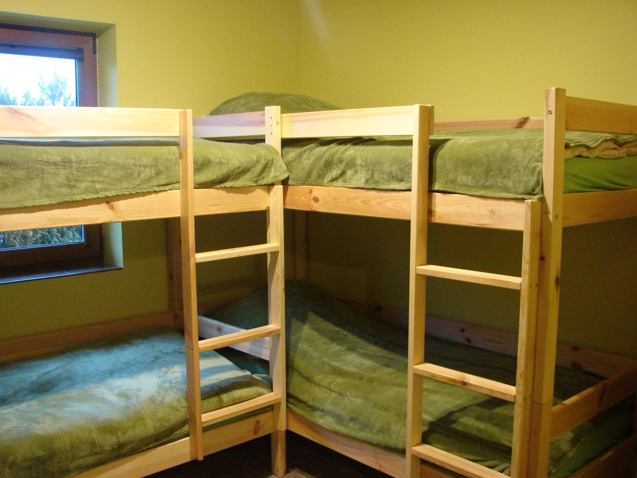 Jedes Ferienhaus besteht aus einem Wohnzimmer mit Küche, einem Zimmer mit einem Doppelbett, einem Zimmer mit zwei Etagenbetten und einem Badezimmer.