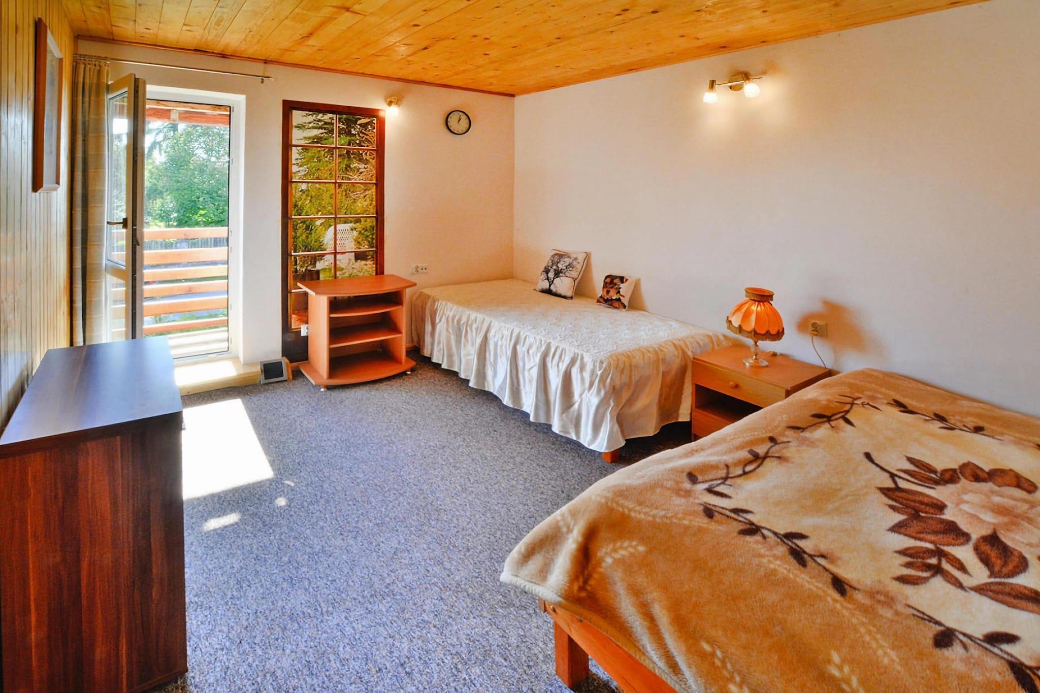 Der kleine Ferienort am Pile-See eignet sich ideal zum Angeln, Schwimmen im klaren Wasser und Radfahren durch die umliegenden Wälder. Die Umgebung bietet mit Wiesen, Feldern, Wäldern und vor allem zahlreichen Seen fantastische Möglichkeiten, die Freizeit am Wasser zu verbringen. Entspannung pur erwartet Sie in einer Oase der Ruhe und des Friedens, in direktem Kontakt mit der Natur. Dieses geräumige, zweistöckige Sommerhaus verfügt über ein privates, eingezäuntes Grundstück. Es bietet sowohl eine überdachte Terrasse im Erdgeschoss als auch einen Balkon im ersten Stock. Die Terrasse ist mit Gartenmöbeln, Liegen und einem Grillplatz ausgestattet. Im Erdgeschoss befindet sich ein Wohnzimmer mit Kamin, TV und Esstisch. Das Wohnzimmer ist mit einer gut ausgestatteten Küche verbunden. Im Erdgeschoss befindet sich außerdem ein Badezimmer mit Dusche. Im Obergeschoss befinden sich drei separate Schlafzimmer und ein zusätzliches WC. Eine Waschmaschine ist vorhanden. Vier Fahrräder stehen den Gästen kostenlos zur Verfügung. Ein Tretboot ist gegen Aufpreis verfügbar. Im Preis inbegriffen: Bettwäsche, Handtücher, Strom, Brennholz, Endreinigung, Kinderbett, Hochstuhl, Parkplatz und Fahrräder. Die unmittelbare Umgebung lädt besonders zum Angeln ein (vom Ufer oder mit dem Boot). Es lohnt sich, die Umgebung mit dem Fahrrad zu erkunden. Auf der anderen Seite des Pile-Sees, in der Stadt Borne Sulinowo (7 km von Dabrowica entfernt), gibt es eine Reihe von Restaurants und Bars. Zwischen 1945 und 1992 war Borne Sulinowo eine russische Garnison, eine von der polnischen Verwaltung ausgeschlossene Stadt, die auf Karten nicht zu sehen war – eine geheime, unzugängliche Stadt, könnte man sagen. Hier können Sie auf alle militärischen Überreste der russischen Militärpräsenz in diesen Gebieten stoßen und etwas über Polens Nachkriegsgeschichte im Kontext der Stationierung ausländischer Armeen bis in die 1990er Jahre erfahren.