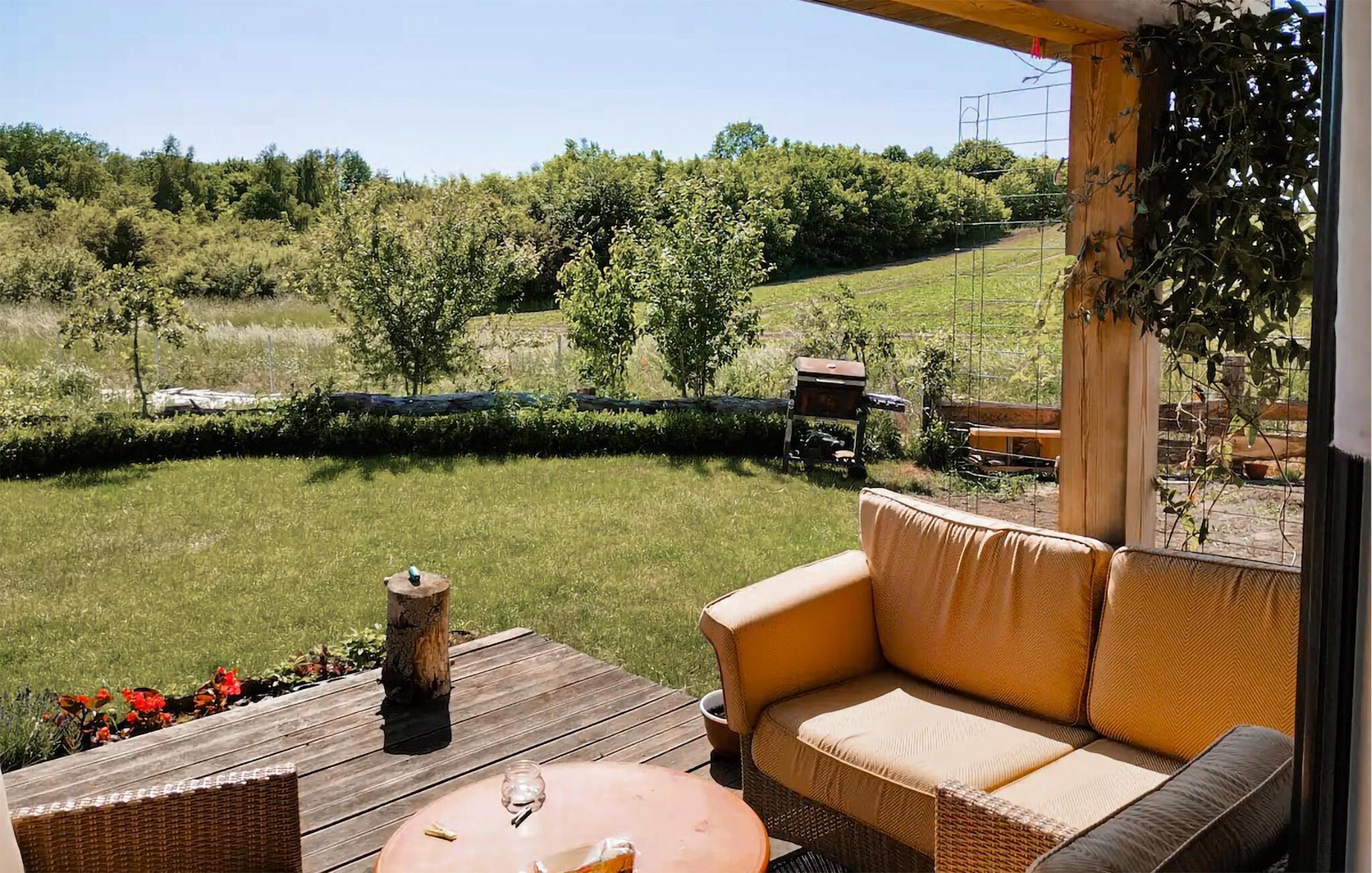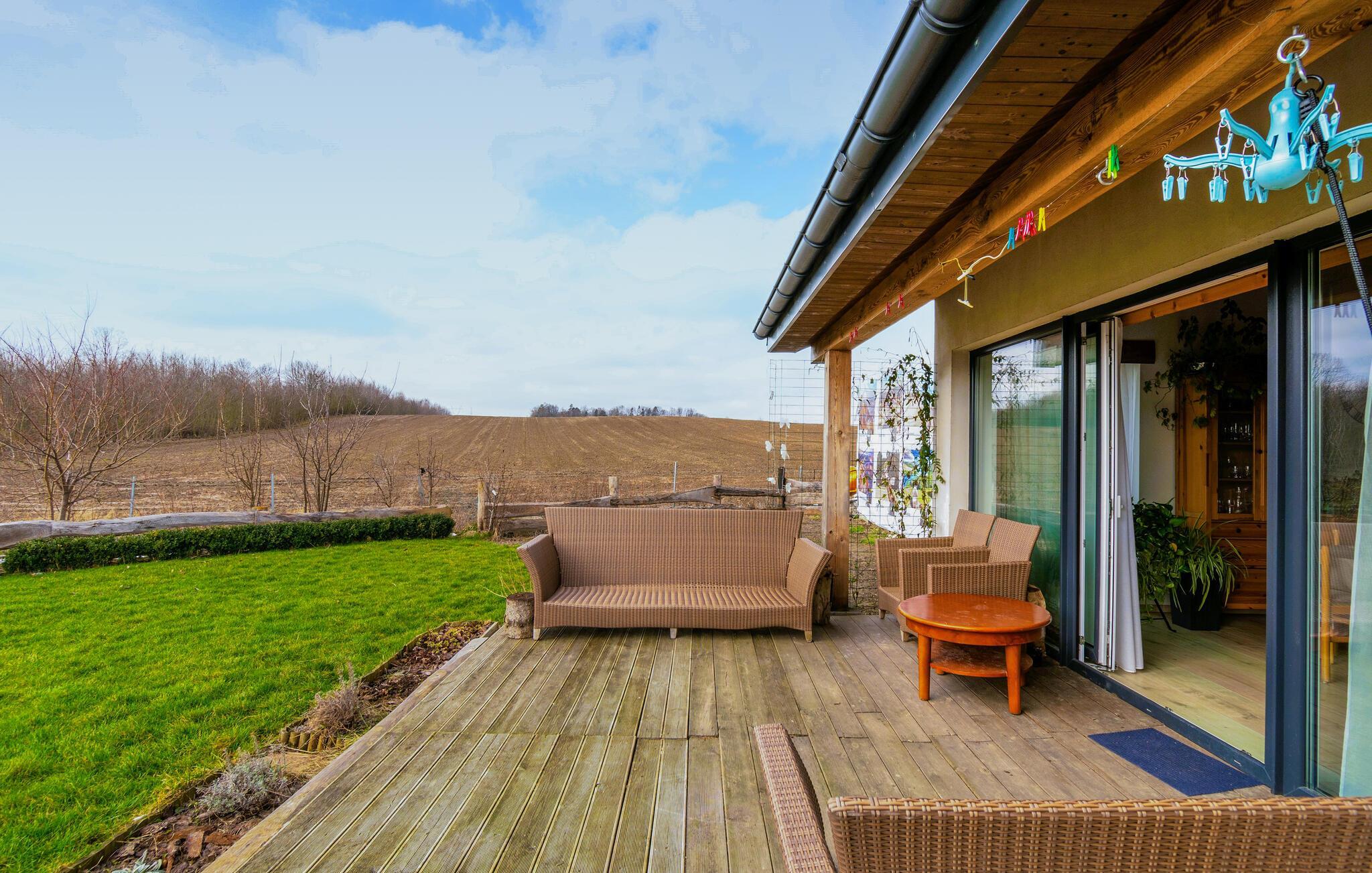 Treten Sie vom Wohnzimmer auf die schöne Holzterrasse und lassen Ihren Blick über die Felder und den garten schweifen. Sonnenbäder und gemeinsame Grillabende stehen hier auf dem Tagesprogrammen, während Ihre Kinder im Garten Ball spielen.