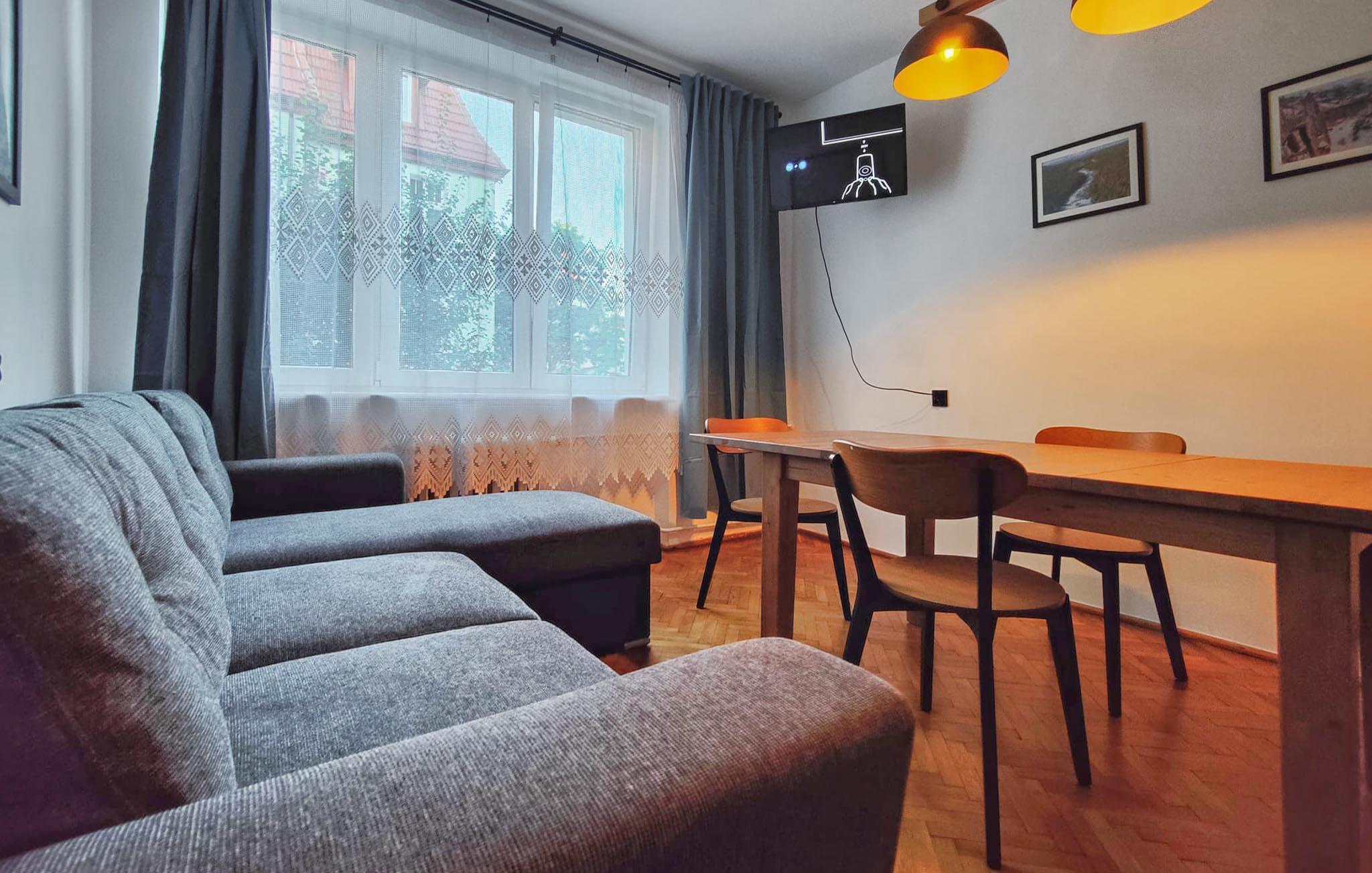 Erleben Sie einen entspannten und erlebnisreichen Urlaub in dieser Ferienwohnung in Danzig. Sie bietet Ihnen, was Sie für einen erholsamen Aufenthalt benötigen. Machen Sie es sich auf dem bequemen grauen Sofa gemütlich und genießen Sie eine Auszeit mit einem guten Buch oder Ihrer Lieblingsserie. Nutzen Sie den großen Holztisch für ein gemeinsames Frühstück oder ein geselliges Abendessen mit Familie und Freunden.