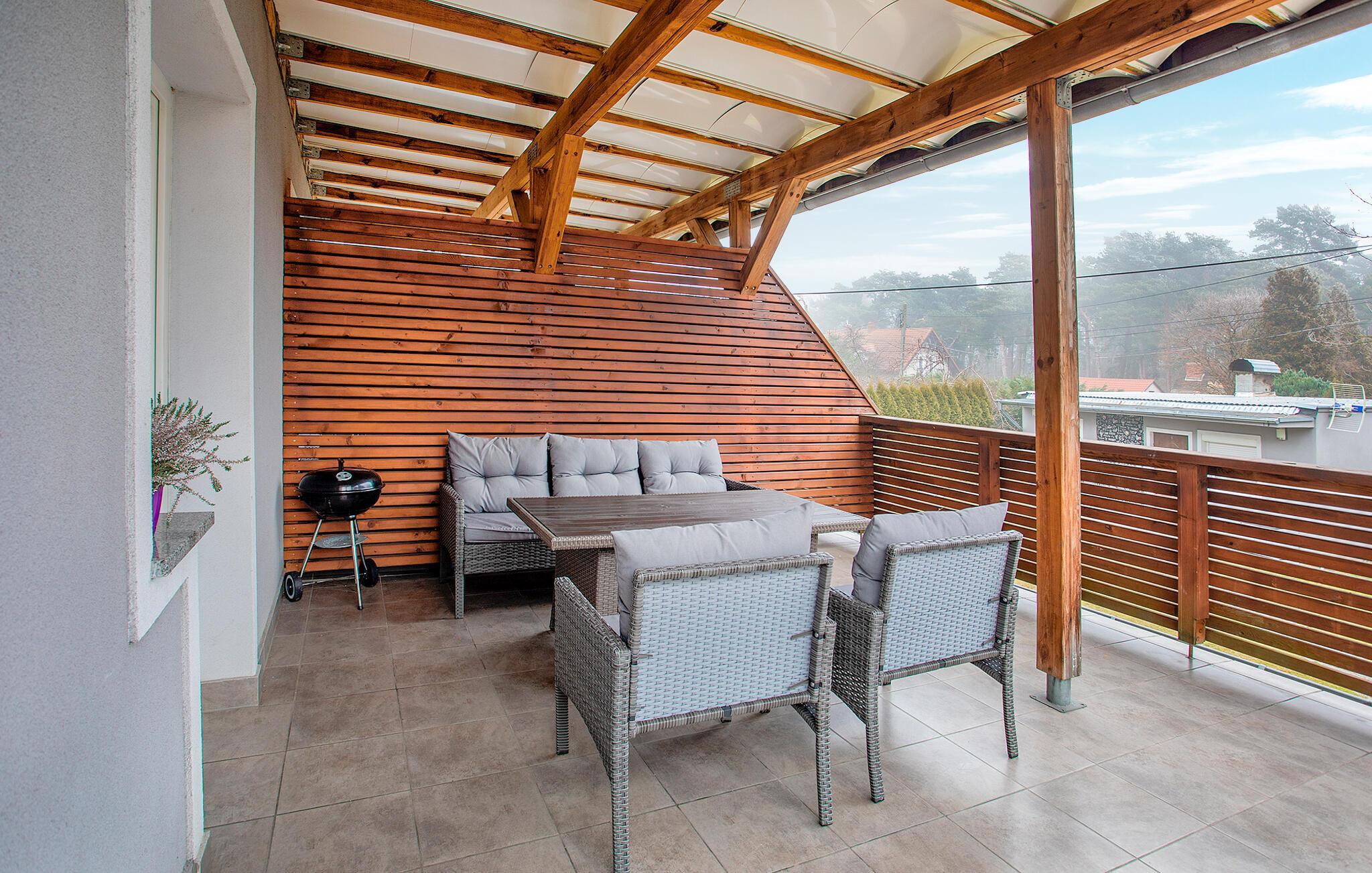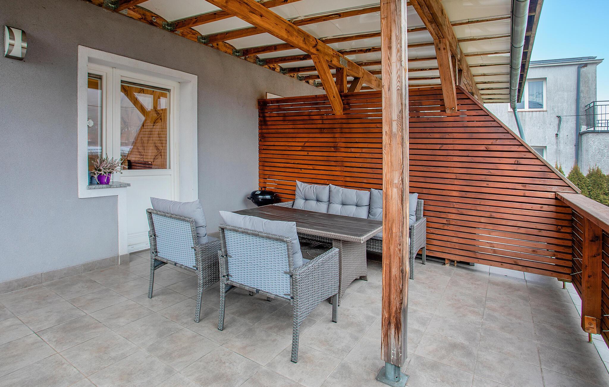 Genießen Sie Ihren Urlaub in dieser modernen Ferienwohnung mit großer, überdachter Terrasse – ideal für entspannte Mahlzeiten im Freien.