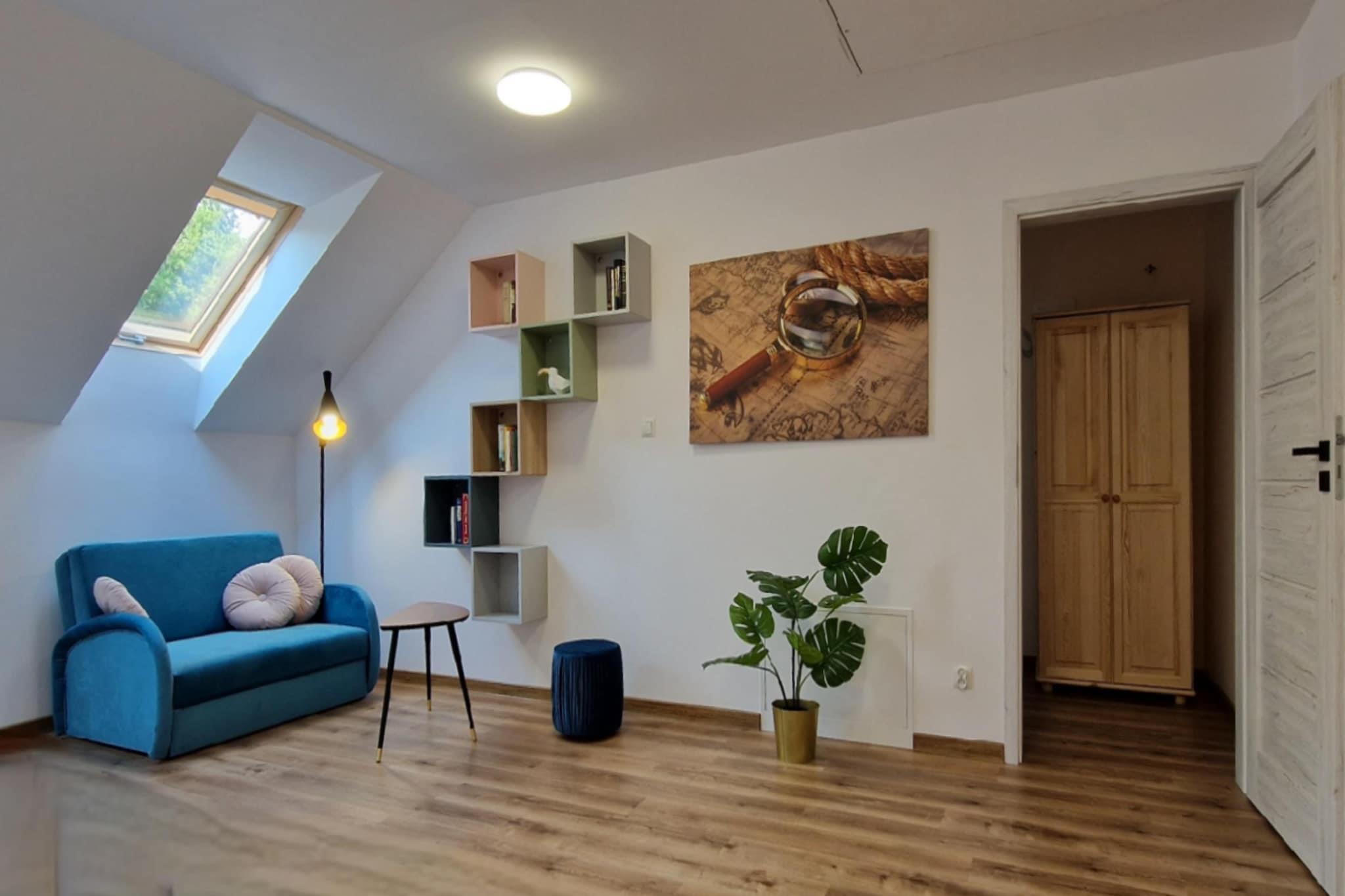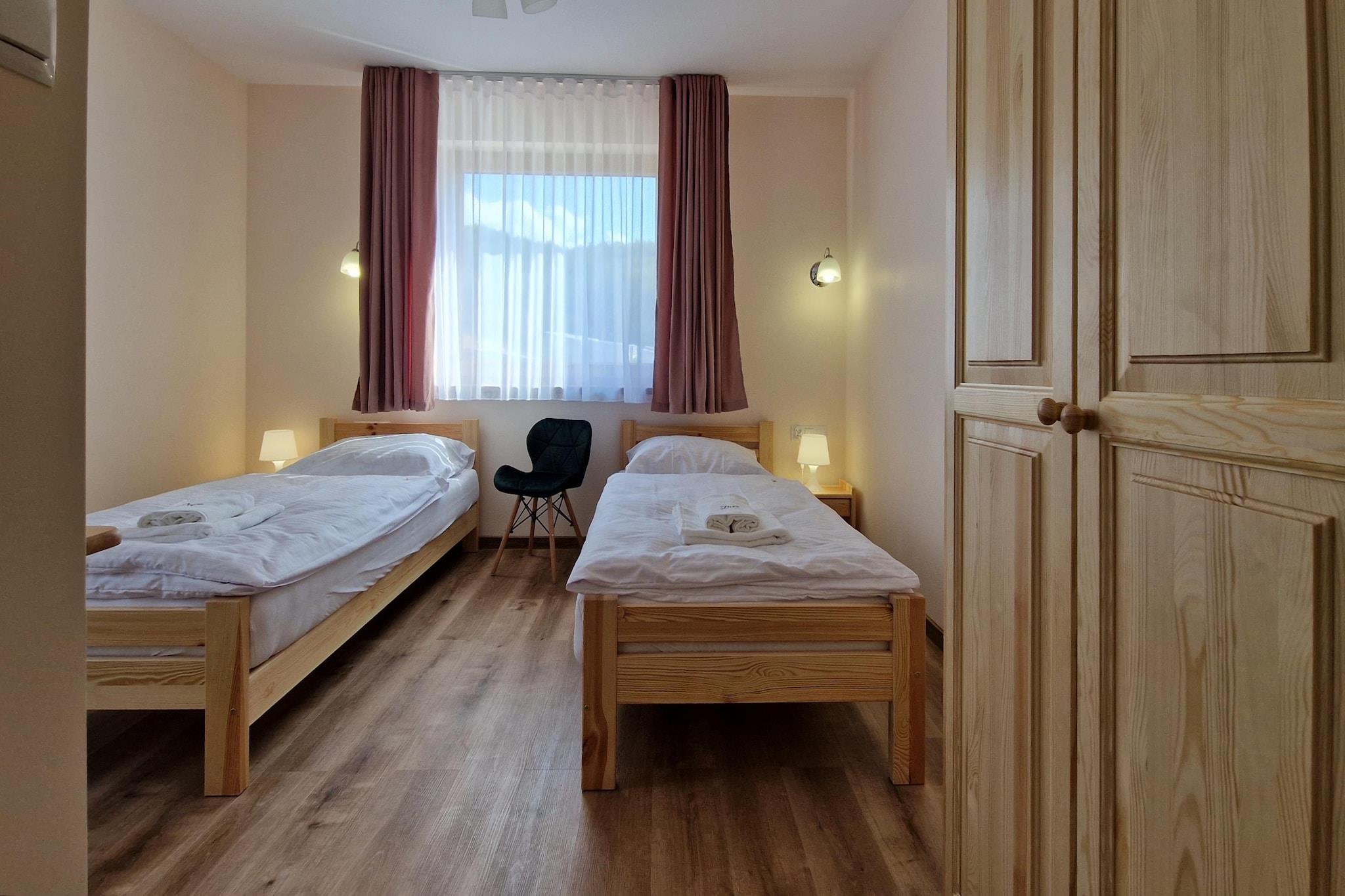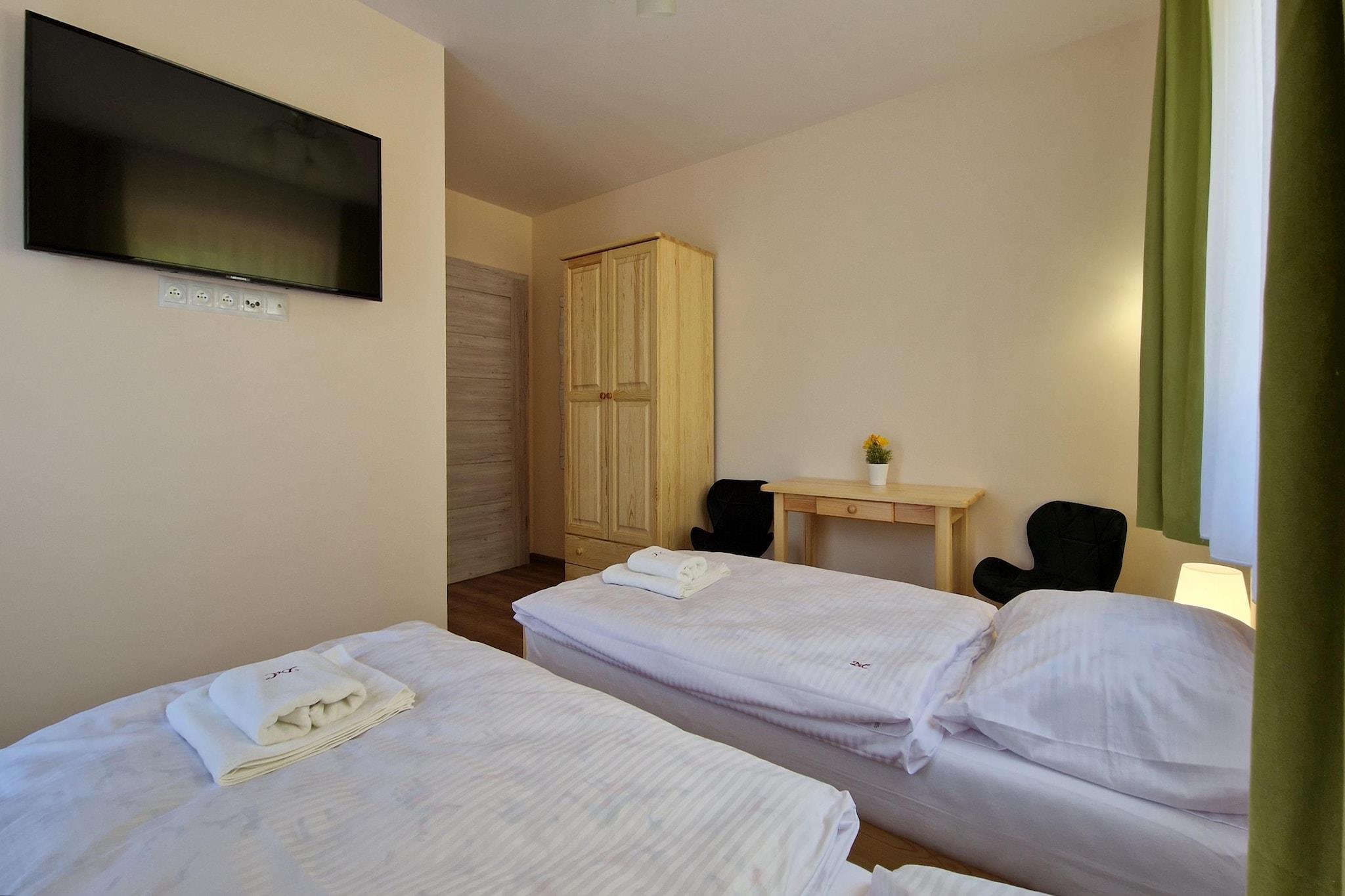 Komfortables, neues Ferienhaus mit Swimmingpool, gelegen in einem malerischen Ort, umgeben von Bergen und Wäldern, abseits von Zivilisation und Stadtlärm. Die Anlage hat eine Fläche von 190 m2 und ist für 12 Personen geeignet. Um ihn herum gibt es ein Erholungsgebiet mit einem Grillpavillon und einem Swimmingpool. Es gibt sechs 2-Personen-Zimmer mit jeweils zwei Einzelbetten mit der Möglichkeit, sie zu einem Doppelbett zusammenzustellen. Darüber hinaus verfügt jedes über ein separates Badezimmer mit Dusche. Die Zimmer sind mit einem Kleiderschrank, einem Schreibtisch mit Stühlen und einem Fernseher mit Satellitenantenne ausgestattet. Das Objekt erstreckt sich über zwei Stockwerke. Im ersten Stock befinden sich vier Schlafzimmer und eine offene Entspannungs-"Leseecke", d.h. ein Ort mit Sofa, Tisch, Lampe und Bücherregal mit Lesematerial. Im Erdgeschoss gibt es einen geräumigen Vorraum, zwei Schlafzimmer, eine kleine separate Toilette , ein kleiner Wirtschaftsraum und ein Wohnzimmer mit Küche. Eines der Zimmer mit Bad ist vollständig behindertengerecht ausgestattet. Das Badezimmer verfügt über alle notwendigen Haltegriffe für Behinderte. Das Erdgeschoss ist auch für eine behinderte Person im Rollstuhl geeignet - Haus, Zimmer, Wohnzimmer und Küche sind leicht zu erreichen. Die beiden Zimmer im Erdgeschoss haben separate Terrassentüren, die direkt nach draußen führen. Die Küche mit offenem Wohnzimmer ist ein gemeinsamer Ort für alle Gäste. Das Wohnzimmer verfügt über zwei Kommoden, einen großen Tisch für 12 Personen und einen Fernseher. Die voll ausgestattete Küche umfasst alle notwendigen Haushaltsgeräte, d. h. einen Induktionsherd, eine Mikrowelle, einen Backofen, einen Kühlschrank mit Gefrierfach, einen Geschirrspüler, eine Waschmaschine, einen Toaster, eine Überlauf-Kaffeemaschine und einen Wasserkocher. Außerdem hat die Küche zwei Sofas, einen Sessel und einen Tisch mit ein paar Gesellschaftsspielen. Nebenkosten vor Ort zahlbar: Kaution 1000 PLN