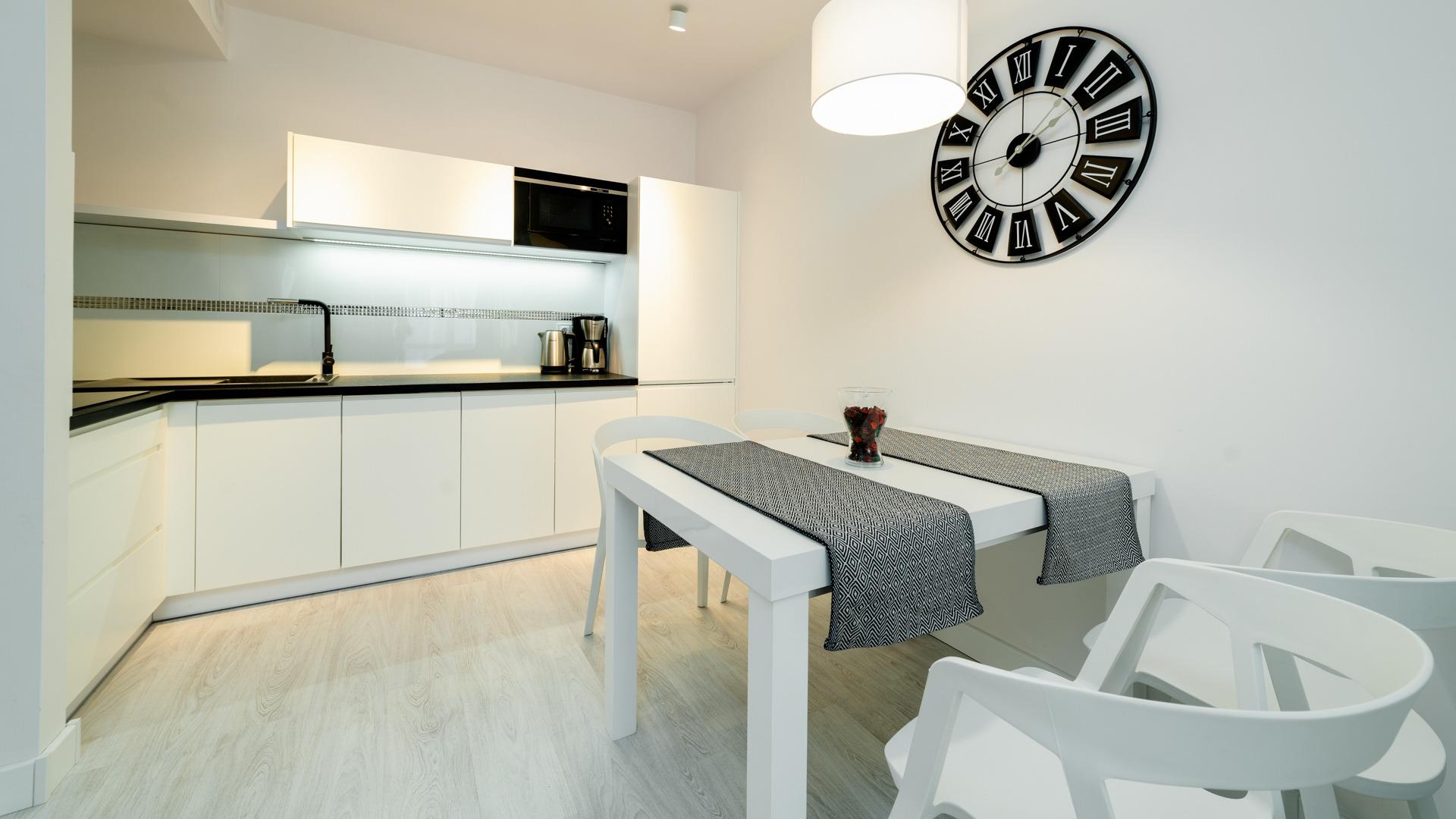 Alle angebotenen Apartments verfügen über eine voll ausgestattete Küchenzeile und ein elegantes Badezimmer mit Dusche.