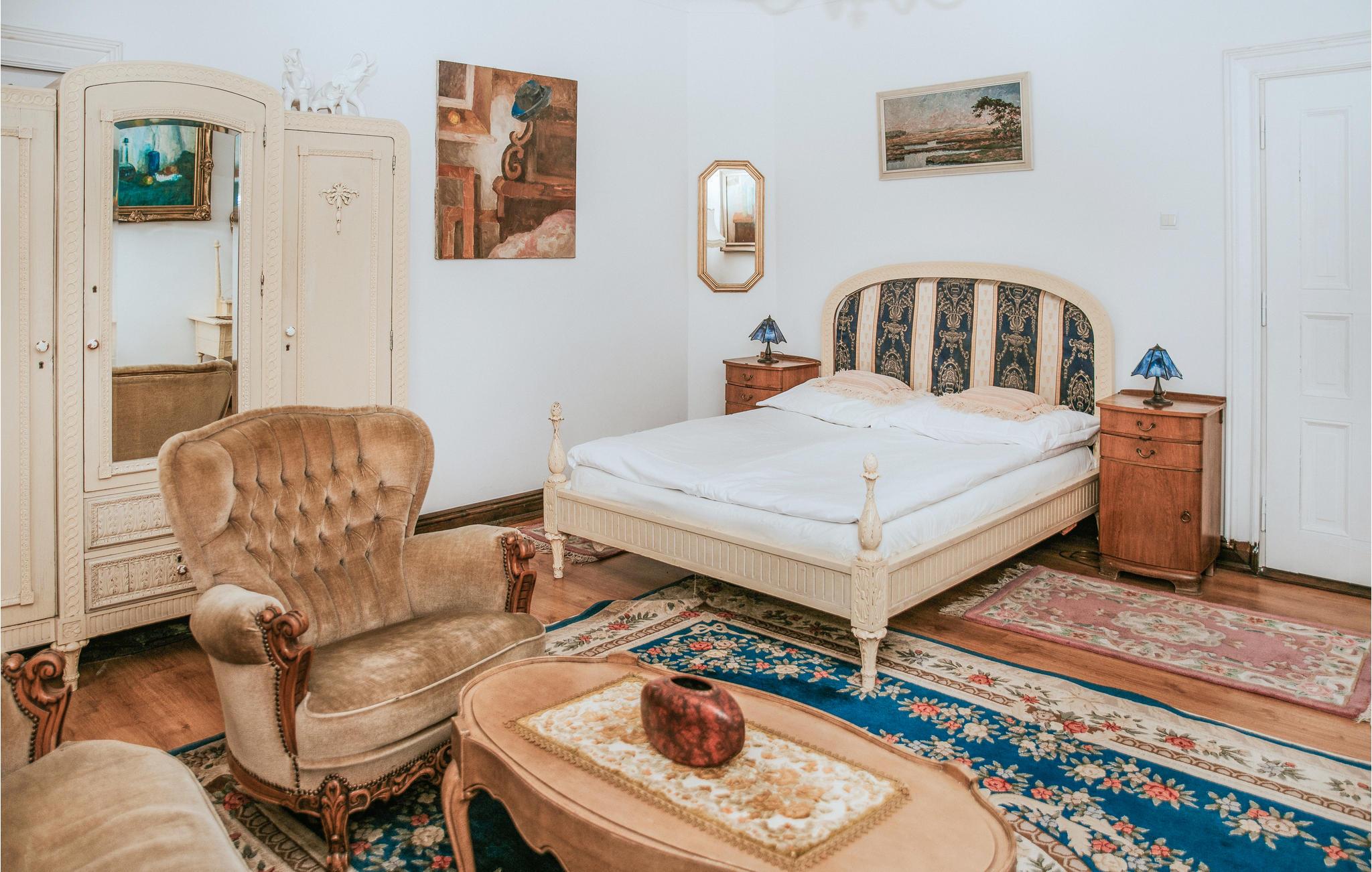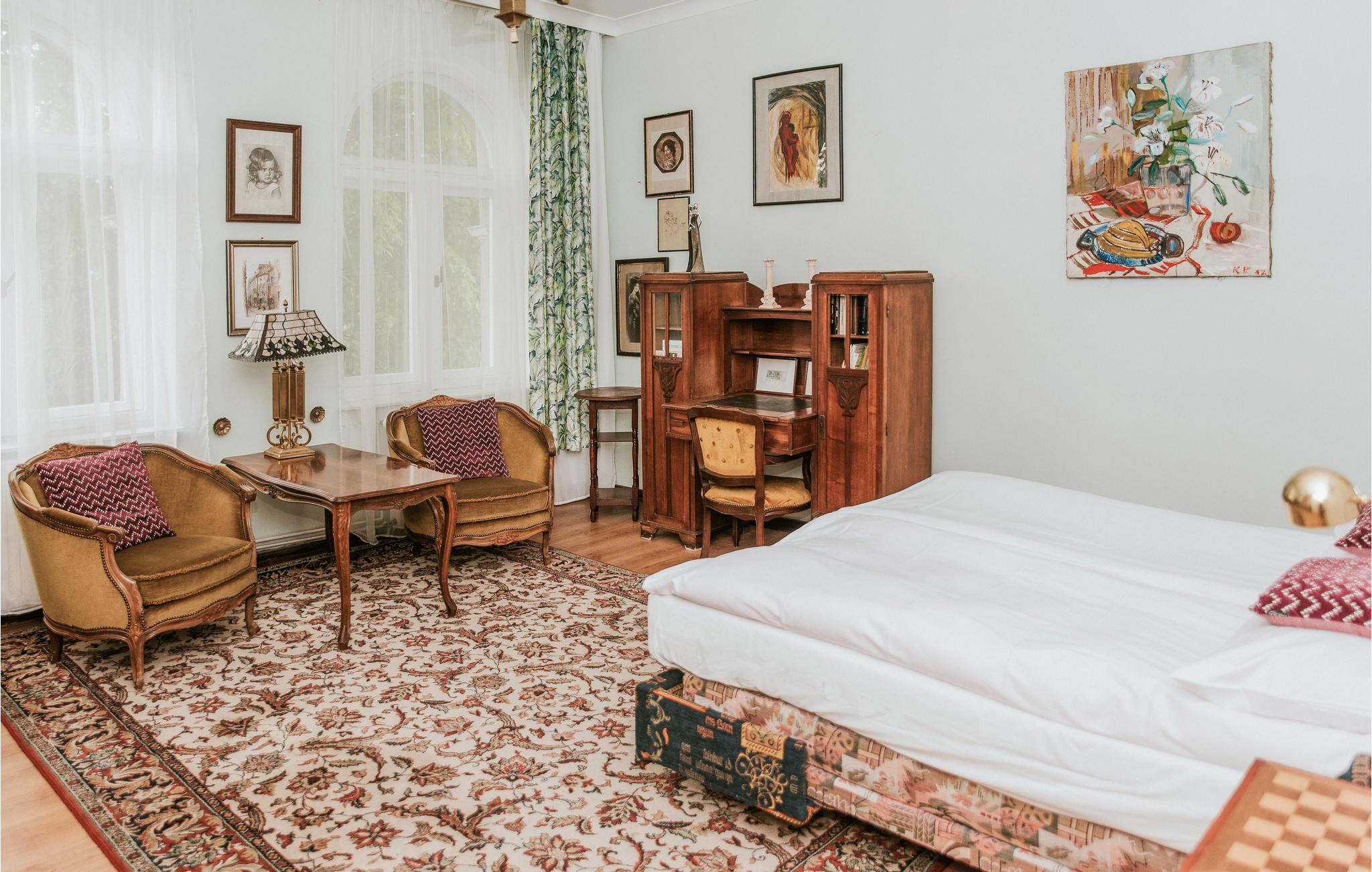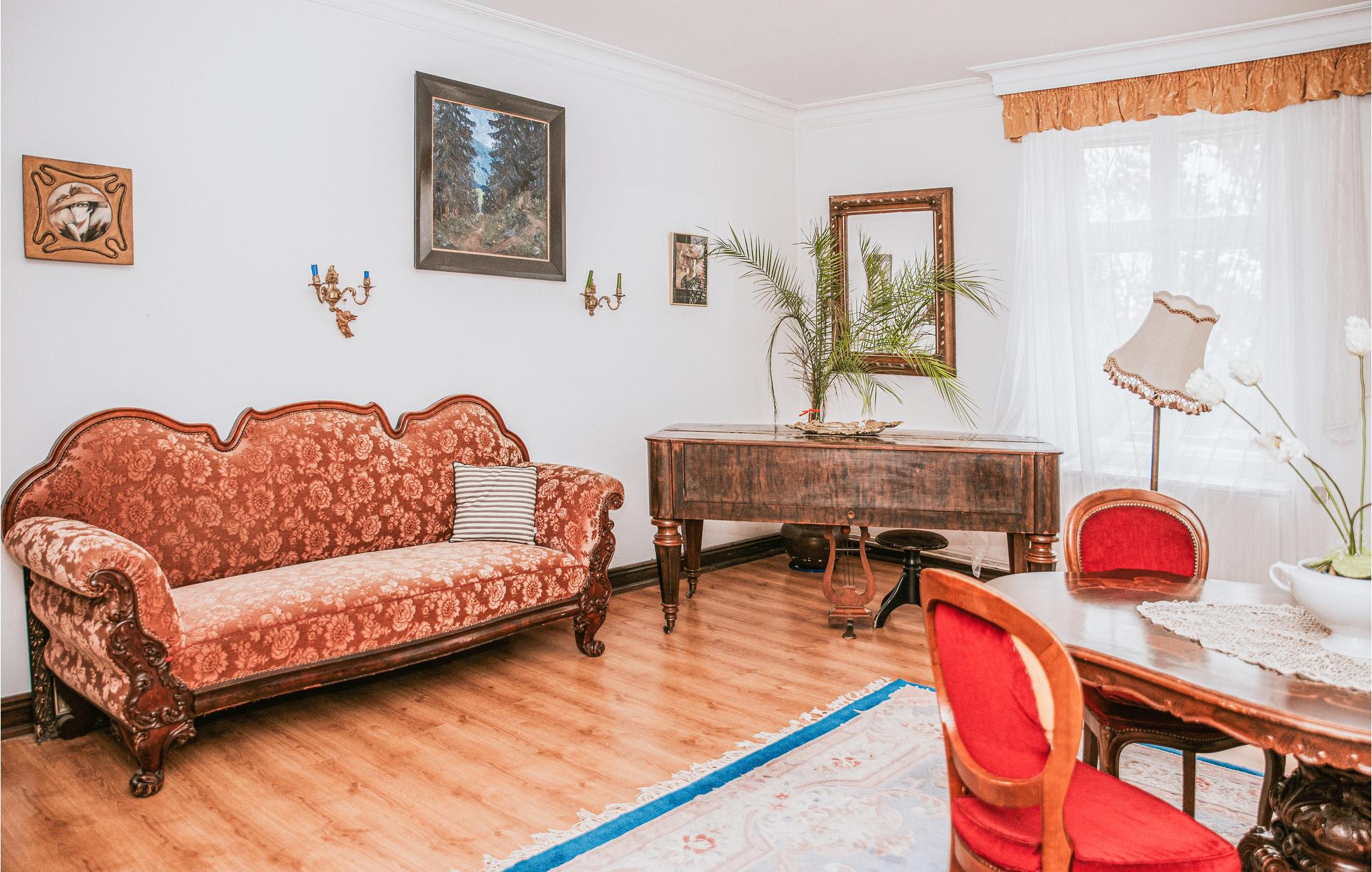 Diese einladende Ferienwohnung empfängt Sie in schöner Lage in einem alten Gebäude auf einem gemeinsamen Grundstück. Der Urlaubsort passt perfekt zu zwei befreundeten Familien oder einer Gruppe von Freunden. Die Räume erhalten ihren besonderen Charme durch die auffallenden Möbeln im altmodischen eleganten Stil, die warmen Farben, viele niedliche Details, hölzerne Elemente, große Fenster und schöne Vorhänge. Hier fühlen Sie sich wie auf einer Zeitreise in die Vergangenheit. Unterhalten Sie sich unter dem Kronleuchter bei gutem Essen oder genießen Sie leckeres Grillessen auf der offenen Terrasse. Auf dem Balkon können Sie den Sonnenuntergang bewundern.
