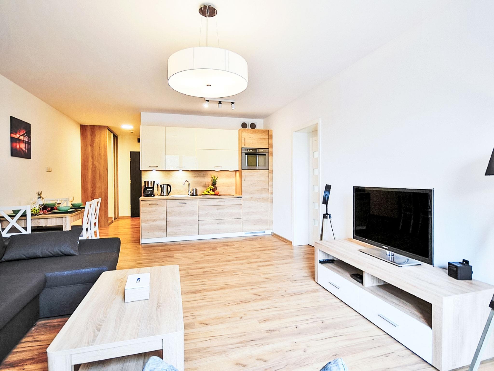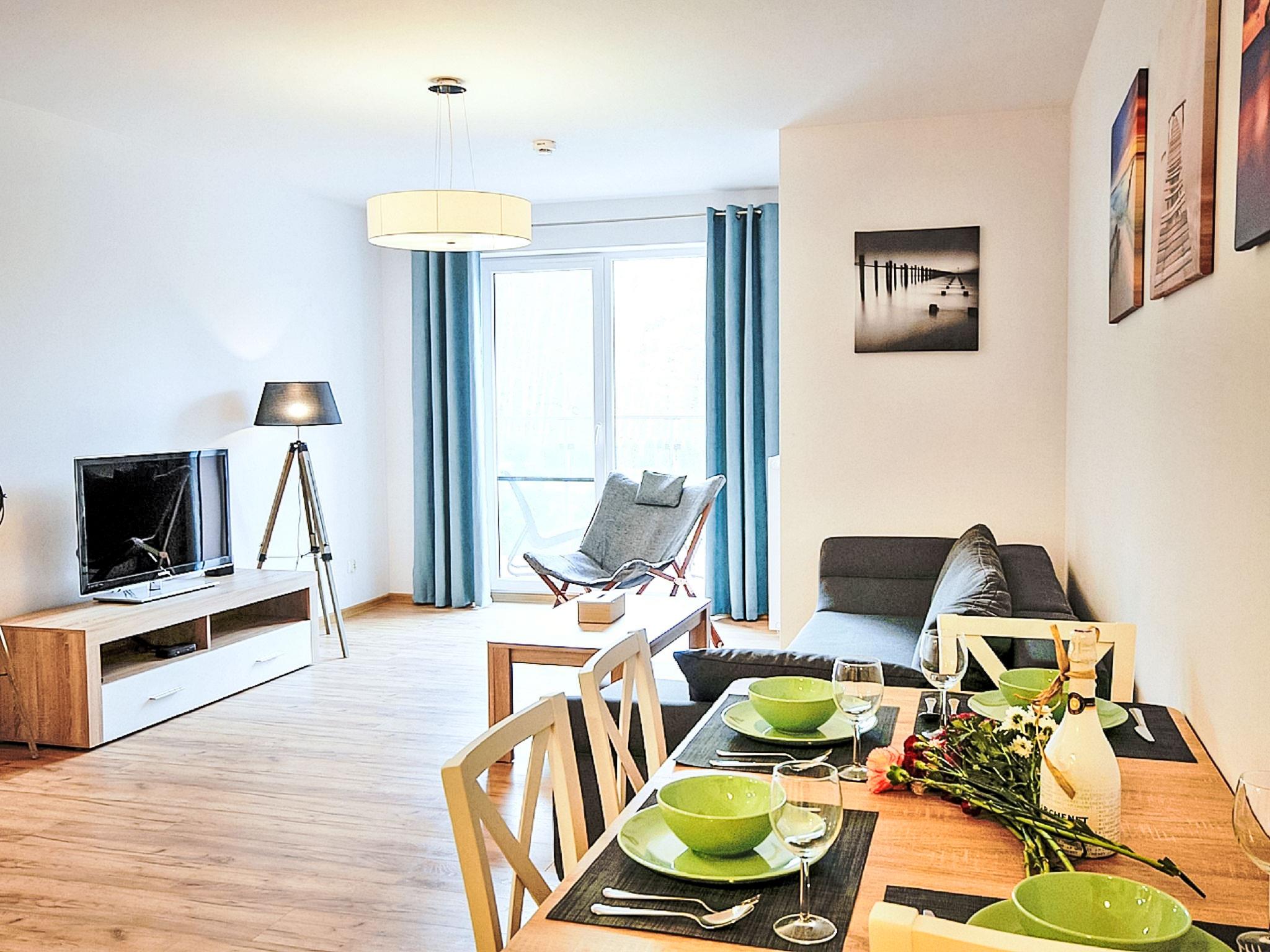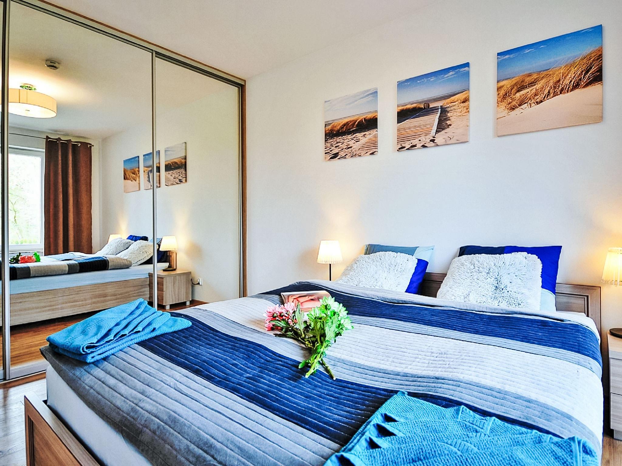 Modernes, komfortables Appartementhaus "Szum Morza", Baujahr 2017. Am Ortsrand, ruhige, sonnige Lage, 350 m vom Meer, im Grünen. Zur Mitbenutzung: Hallenbad beheizt (6 x 17 m, Öffnungszeiten Schwimmbad: 09:00-21:00). Dusche/WC im Poolbereich, Kinderbecken, Sprudelbad, Kinderspielplatz. Im Hause: Sauna, Fitnessraum, Spielzimmer, Fahrstuhl, Zentralheizung, Alarmanlage. Parkplatz beim Haus auf dem Grundstück, öffentliche Parkplätze auf der Strasse. Einkaufsgeschäft 1.3 km, Lebensmittelgeschäft 850 m, Supermarkt, Restaurant 300 m, Bushaltestelle 1.1 km, Bahnstation 2.5 km, Sandstrand 350 m. Sporthafen 3 km. Nahe gelegene Sehenswürdigkeiten: Oceanarium 3 km, Molo 3 km, Park Dziki Zachód Zieleniewo 7 km. Bewachte Residenz.