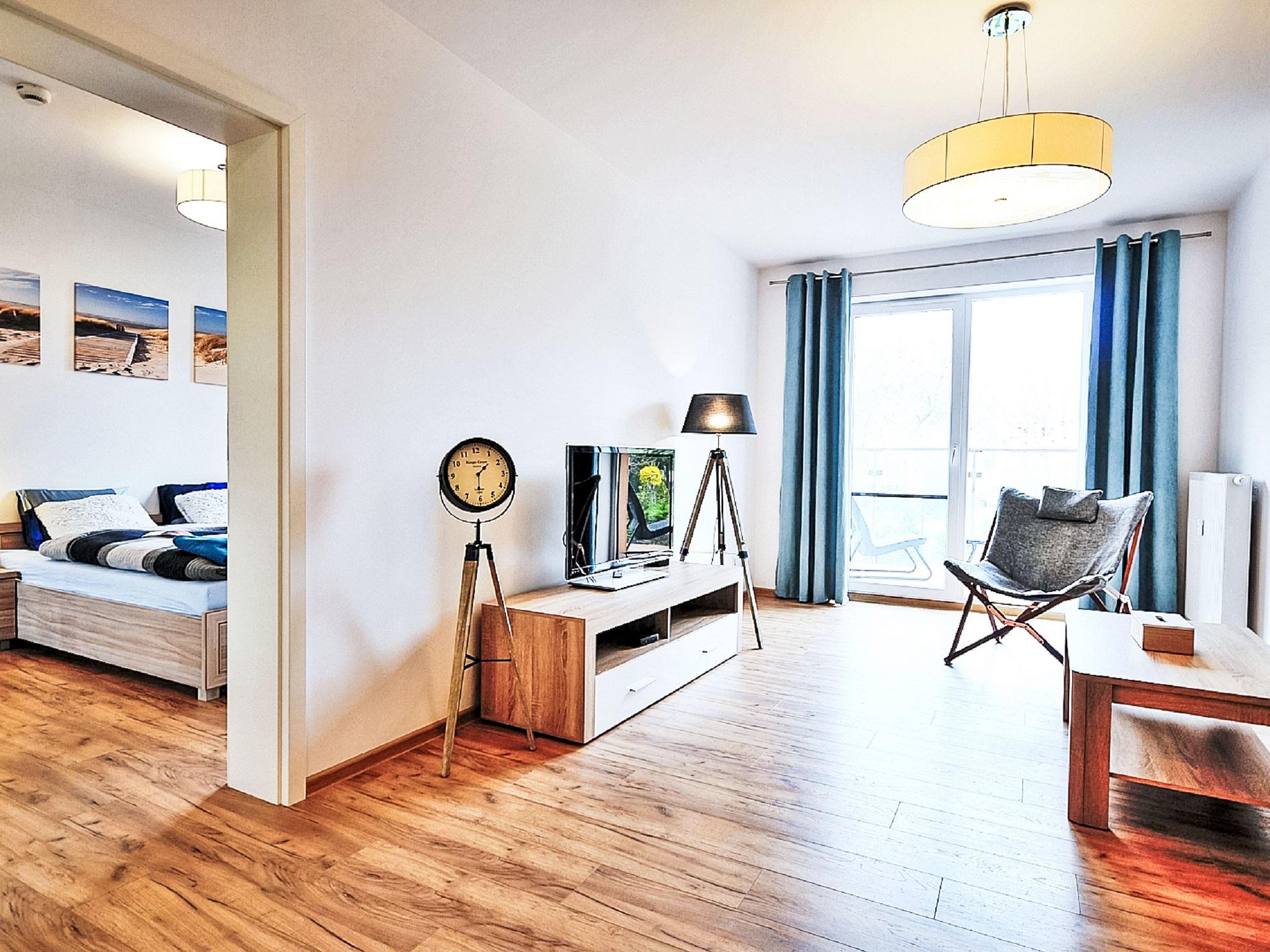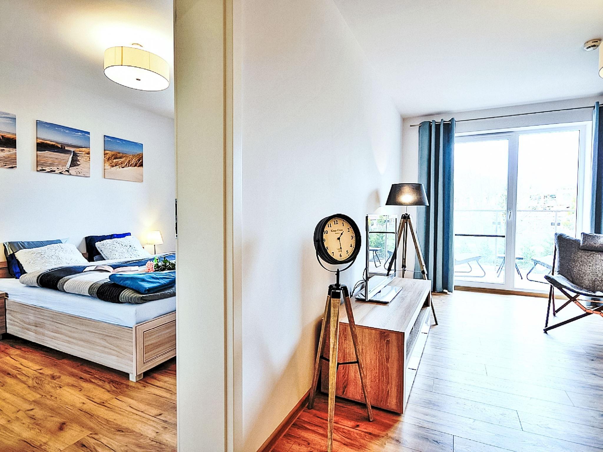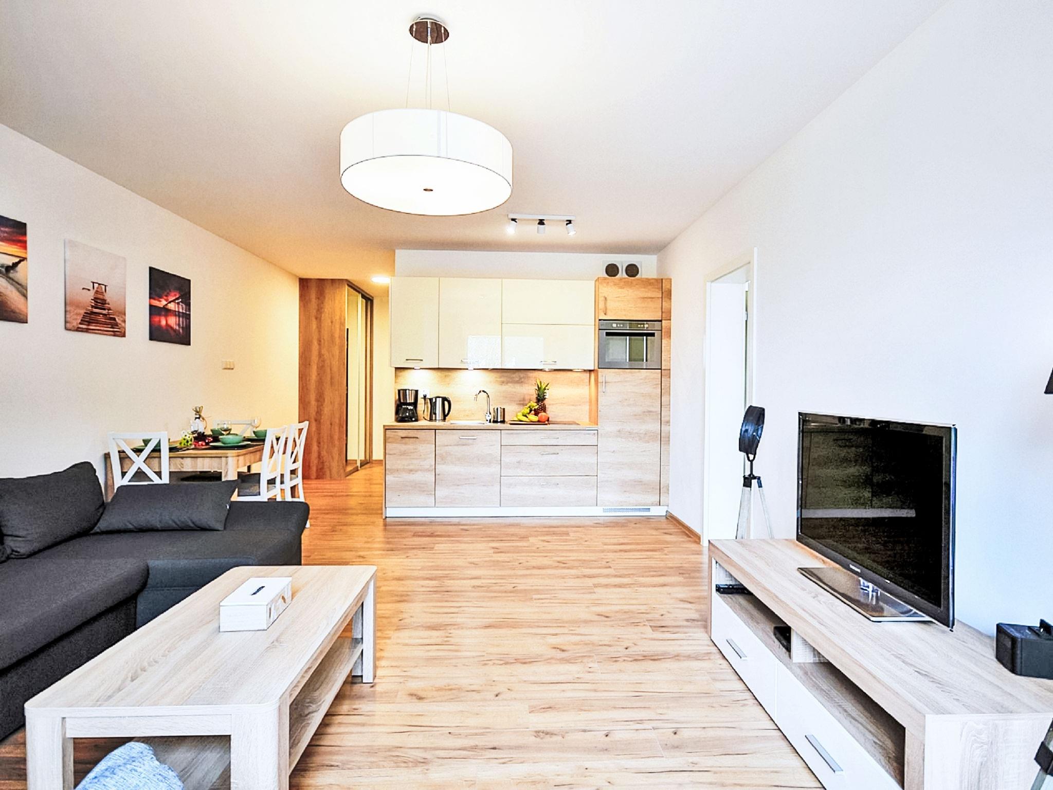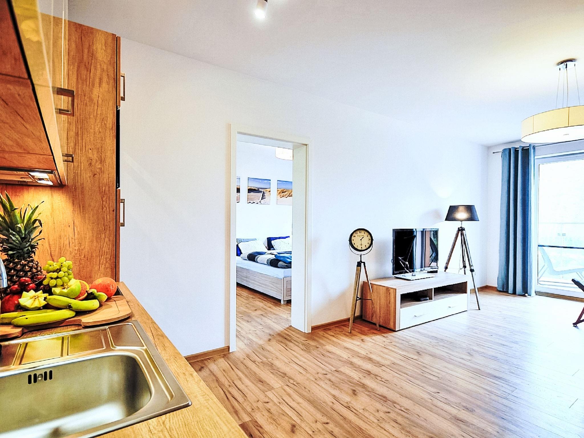 Modernes, komfortables Appartementhaus "Szum Morza", Baujahr 2017. Am Ortsrand, ruhige, sonnige Lage, 350 m vom Meer, im Grünen. Zur Mitbenutzung: Hallenbad beheizt (6 x 17 m, Öffnungszeiten Schwimmbad: 09:00-21:00). Dusche/WC im Poolbereich, Kinderbecken, Sprudelbad, Kinderspielplatz. Im Hause: Sauna, Fitnessraum, Spielzimmer, Fahrstuhl, Zentralheizung, Alarmanlage. Parkplatz beim Haus auf dem Grundstück, öffentliche Parkplätze auf der Strasse. Einkaufsgeschäft 1.3 km, Lebensmittelgeschäft 850 m, Supermarkt, Restaurant 300 m, Bushaltestelle 1.1 km, Bahnstation 2.5 km, Sandstrand 350 m. Sporthafen 3 km. Nahe gelegene Sehenswürdigkeiten: Oceanarium 3 km, Molo 3 km, Park Dziki Zachód Zieleniewo 7 km. Bewachte Residenz.