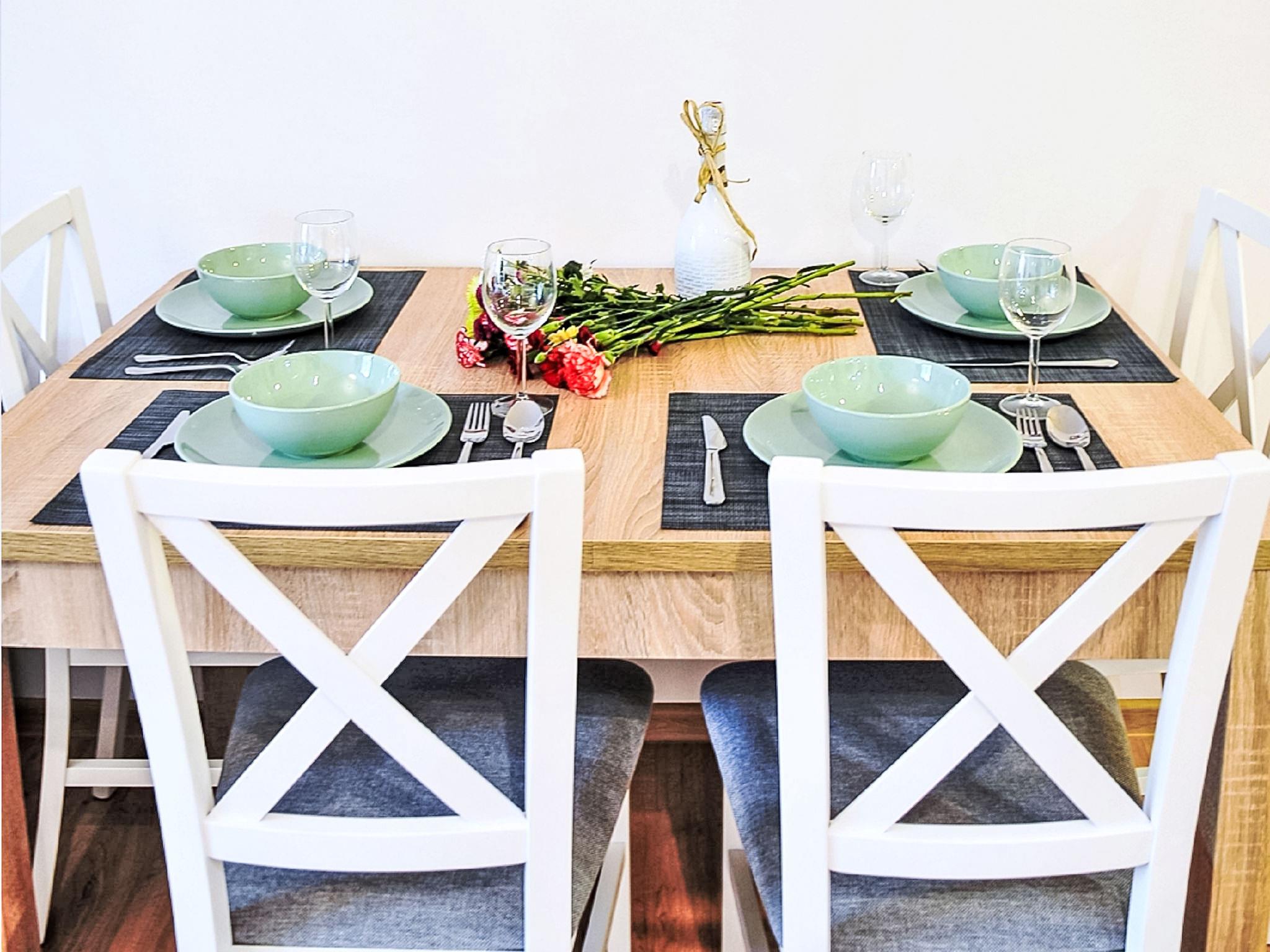 "B1", 2-Zimmer-Wohnung 52 m2, im erhöhten Erdgeschoss. Salon mit 1 Doppeldiwanbett und Sat-TV. 1 Zimmer mit 1 Doppelbett. Offene Küche (Backofen, Geschirrspüler, 4 Glaskeramikplatten, Tiefkühler, elektrische Kaffeemaschine). Dusche/WC. Balkon. Balkonmöbel, Liegestühle (2). Zur Verfügung: Waschmaschine, Bügeleisen, Haartrockner. Internet (WLAN). Bitte beachten: Maximal 1 Haustier/Hund erlaubt. Rauchmelder. Zusätzliches ausklappbares Sofa oder Sessel im Wohnzimmer.