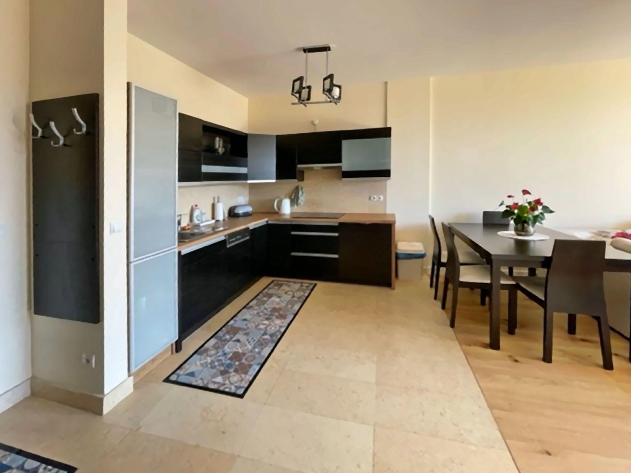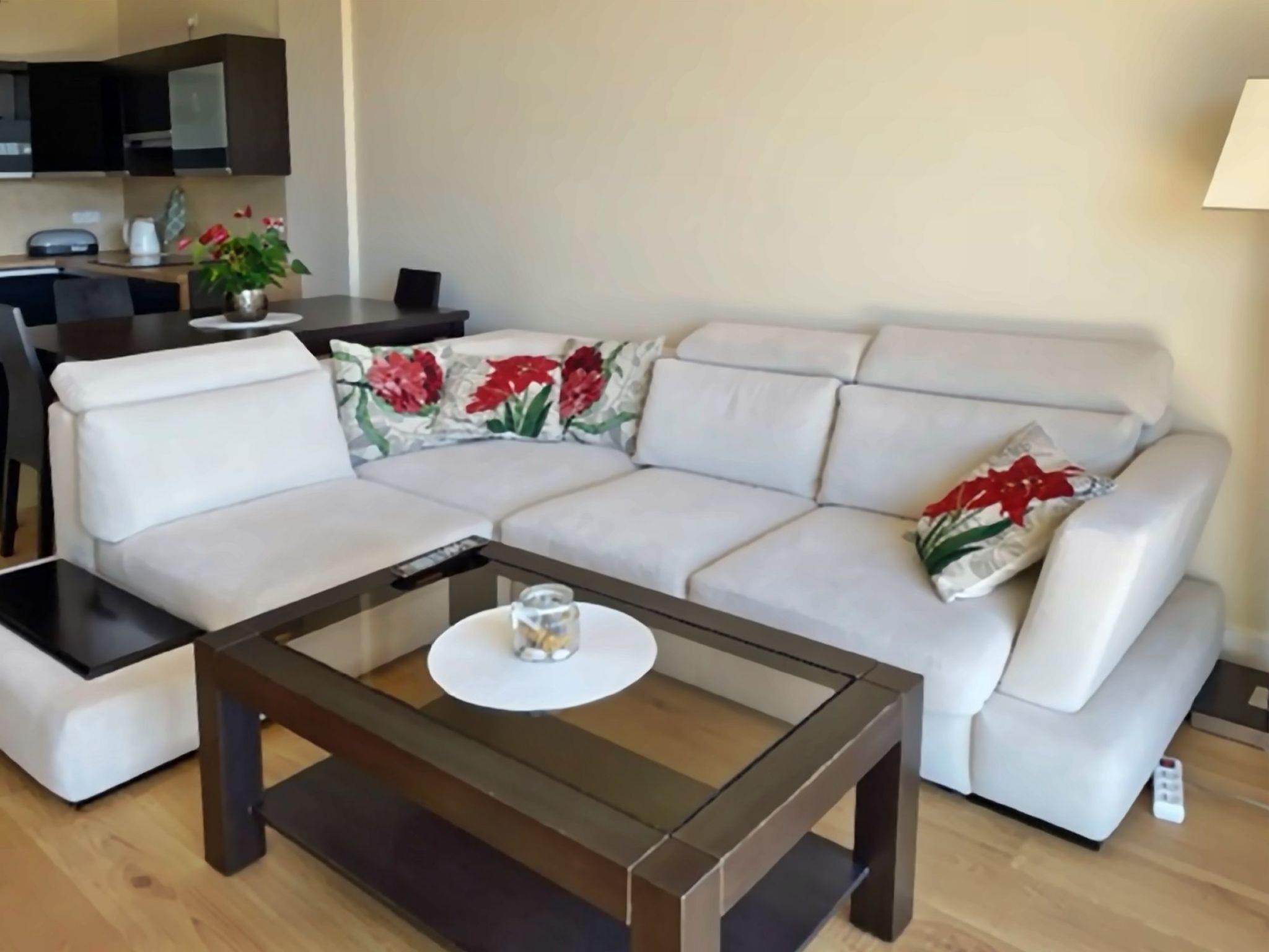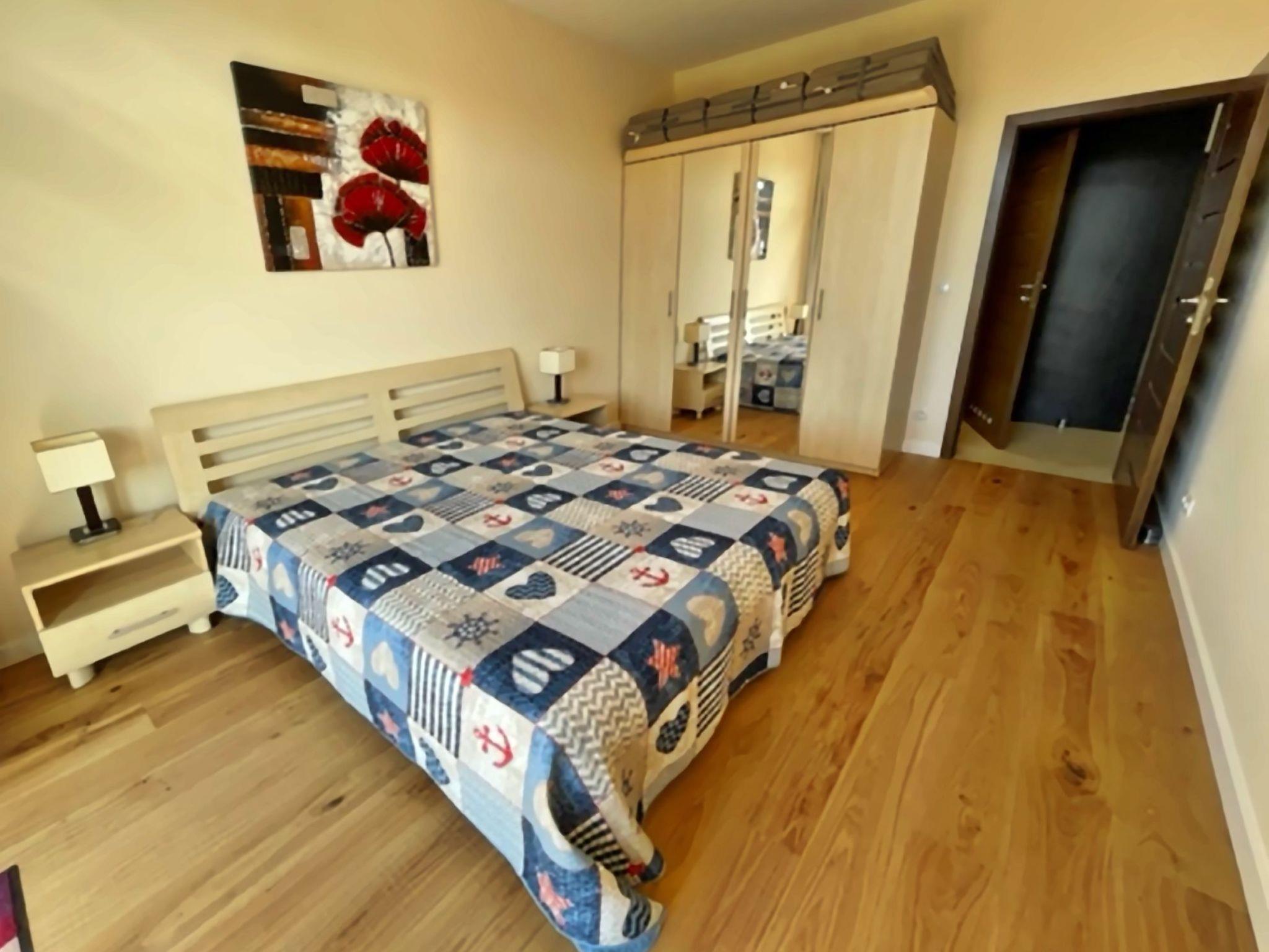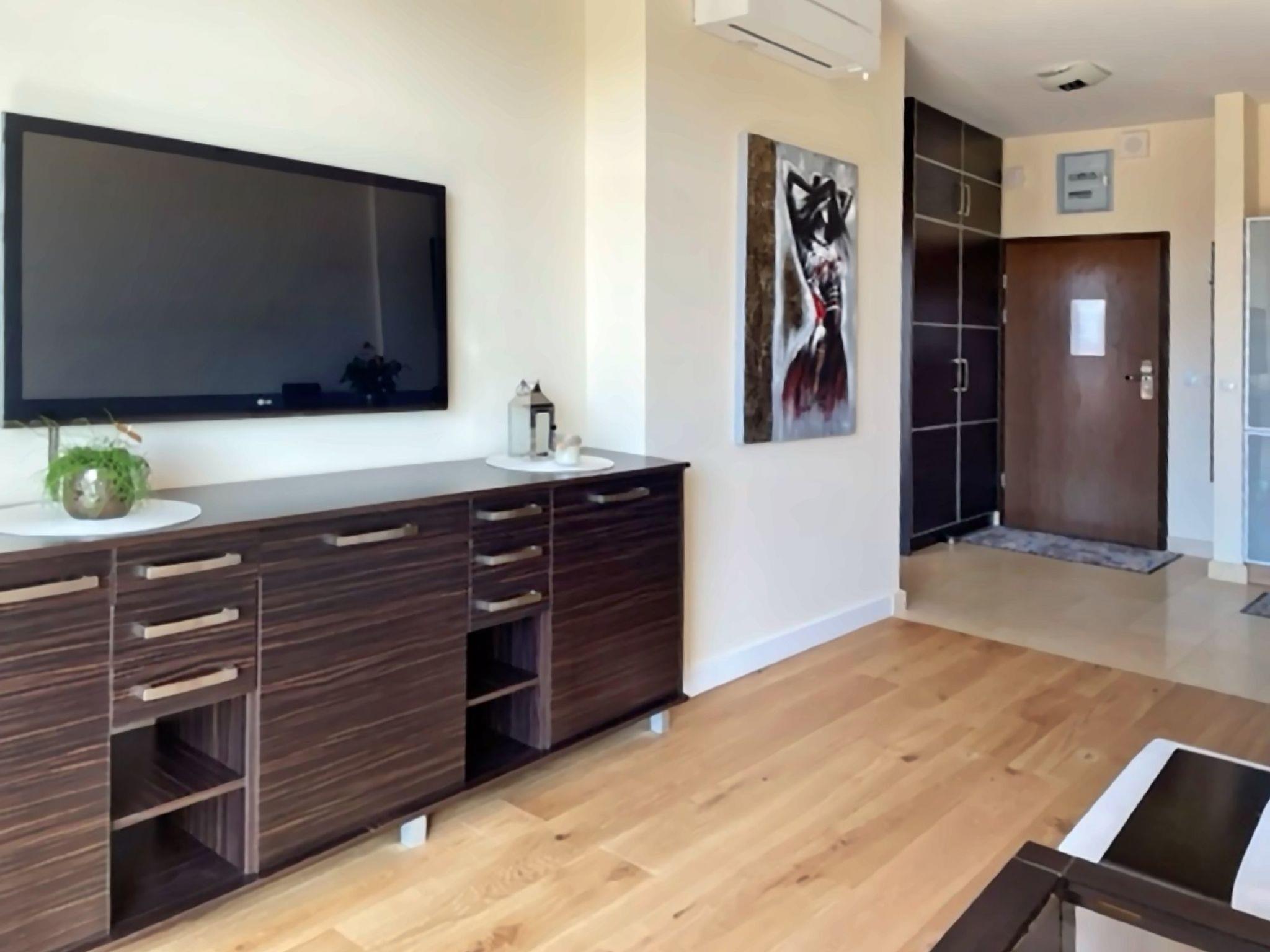 Einem Wohnzimmer mit einem großen 2-Sitzer-Schlafsofa (160cmx200cm), LED-Fernseher (50"), einem niedrigen Couchtisch; im Wohnzimmer befindet sich eine Essecke mit einem Tisch und 4 Stühlen;einer Küchenzeile, die mit einem Cerankochfeld, Backofen, Kühlschrank, Geschirrspüler, Toaster, Tchibo-Druckkaffeemaschine (15bar), Geschirr, Töpfen, Besteck etc.Ein Schlafzimmer mit einem großen Doppelbett (180cmx200cm) mit professioneller Damast-Hotelwäsche und einem großen Kleiderschrank;Ein Badezimmer mit Duschkabine, Waschbecken, Toilette, Haartrockner, Baumwollhandtüchern und Waschmaschine;Eine große Terrasse (16m2) mit einem Tisch und 4 bequemen Stühlen; Vom Balkon aus hat man in der Zeit, in der die Bäume nicht belaubt sind, einen schönen seitlichen Blick auf das Meer;Außerdem verfügt die Wohnung über Strandausrüstung (Liegestühle, Sonnenschirm), einen Wäschetrockner, ein Bügeleisen und Bügelbrett sowie einen Safe;Ein großer Vorteil dieser Wohnung ist ihr eigener kostenloser Parkplatz in der Tiefgarage.