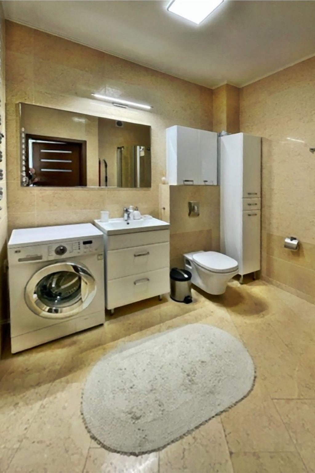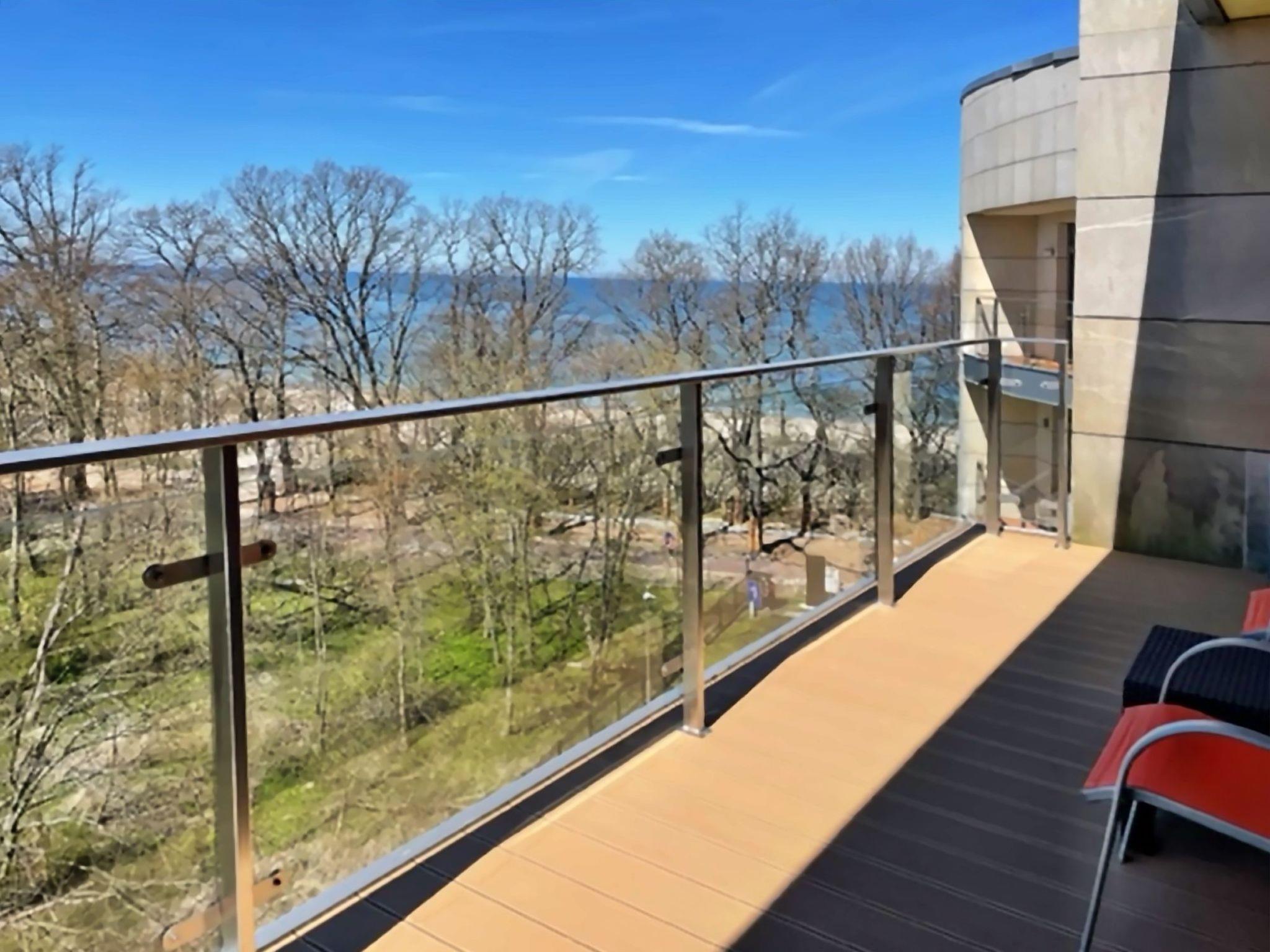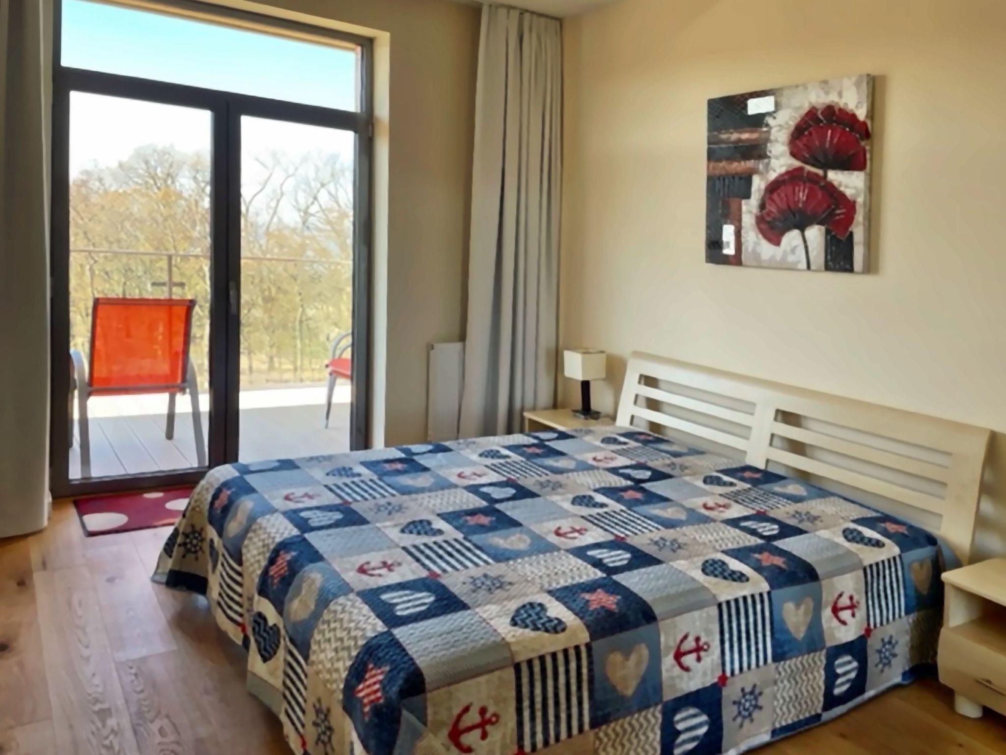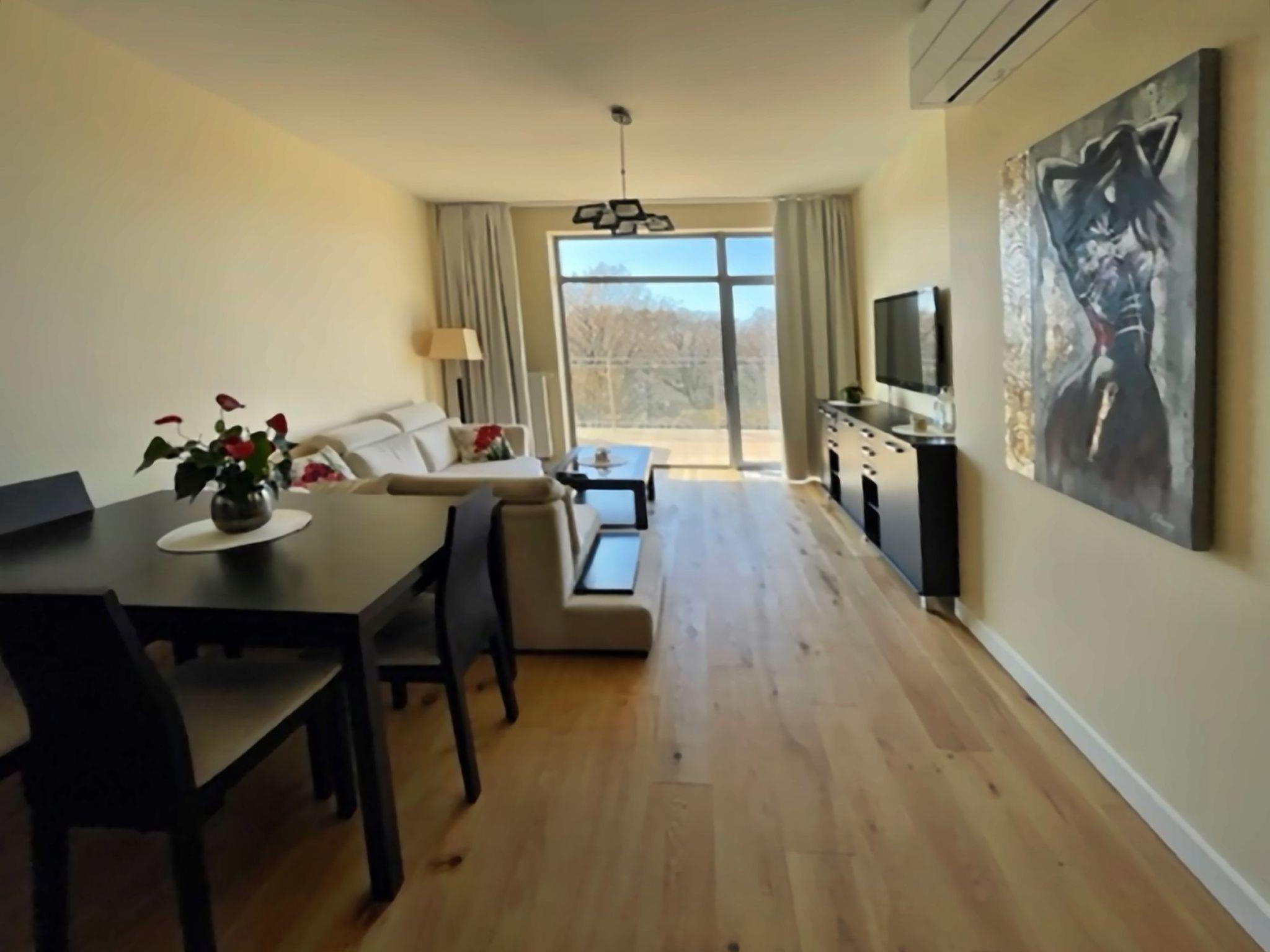 Einem Wohnzimmer mit einem großen 2-Sitzer-Schlafsofa (160cmx200cm), LED-Fernseher (50"), einem niedrigen Couchtisch; im Wohnzimmer befindet sich eine Essecke mit einem Tisch und 4 Stühlen;einer Küchenzeile, die mit einem Cerankochfeld, Backofen, Kühlschrank, Geschirrspüler, Toaster, Tchibo-Druckkaffeemaschine (15bar), Geschirr, Töpfen, Besteck etc.Ein Schlafzimmer mit einem großen Doppelbett (180cmx200cm) mit professioneller Damast-Hotelwäsche und einem großen Kleiderschrank;Ein Badezimmer mit Duschkabine, Waschbecken, Toilette, Haartrockner, Baumwollhandtüchern und Waschmaschine;Eine große Terrasse (16m2) mit einem Tisch und 4 bequemen Stühlen; Vom Balkon aus hat man in der Zeit, in der die Bäume nicht belaubt sind, einen schönen seitlichen Blick auf das Meer;Außerdem verfügt die Wohnung über Strandausrüstung (Liegestühle, Sonnenschirm), einen Wäschetrockner, ein Bügeleisen und Bügelbrett sowie einen Safe;Ein großer Vorteil dieser Wohnung ist ihr eigener kostenloser Parkplatz in der Tiefgarage.