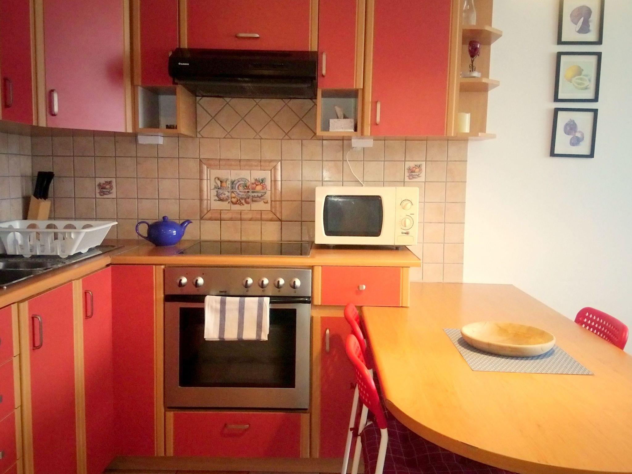 Küchenzeile, komplett ausgestattet mit Backofen, Kühlschrank mit Gefrierfach, Elektroherd, Wasserkocher, Mikrowelle, Besteck, Töpfe, Pfannen usw.. Außerdem Staubsauger, Bügeleisen, Bügelbrett, Haartrockner, Ständer.