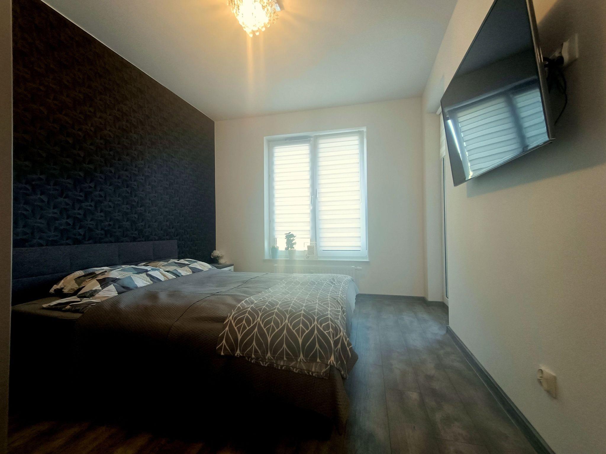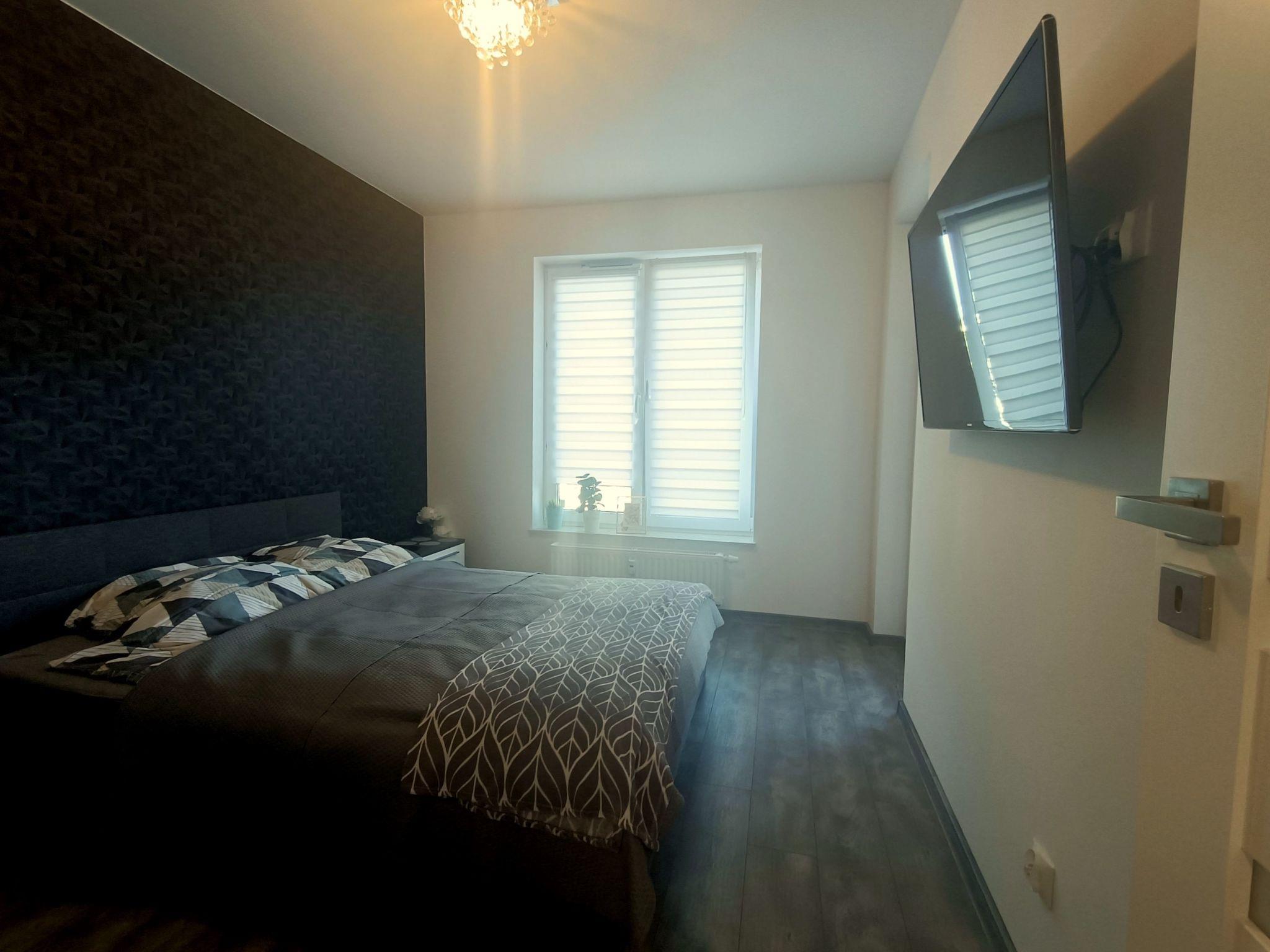 - 1 Schlafzimmer mit einem Doppelbett 160 x 2,00 m. Im Schlafzimmer 47" TV, Wäscheschrank, Zugang zum Balkon, Bettwäsche vorhanden.