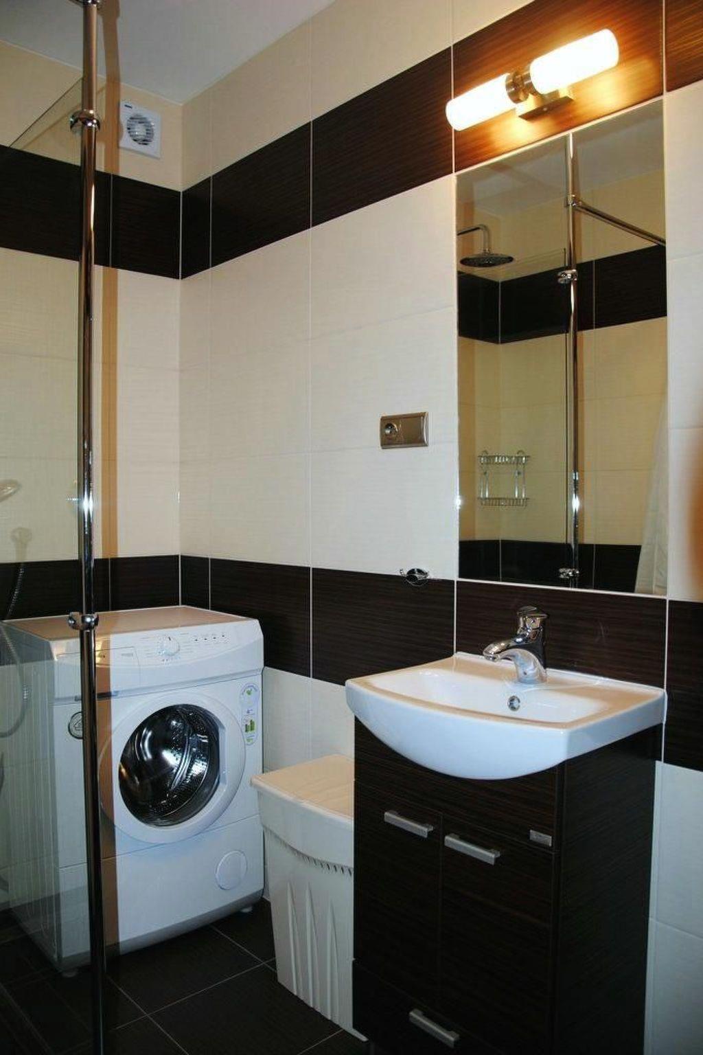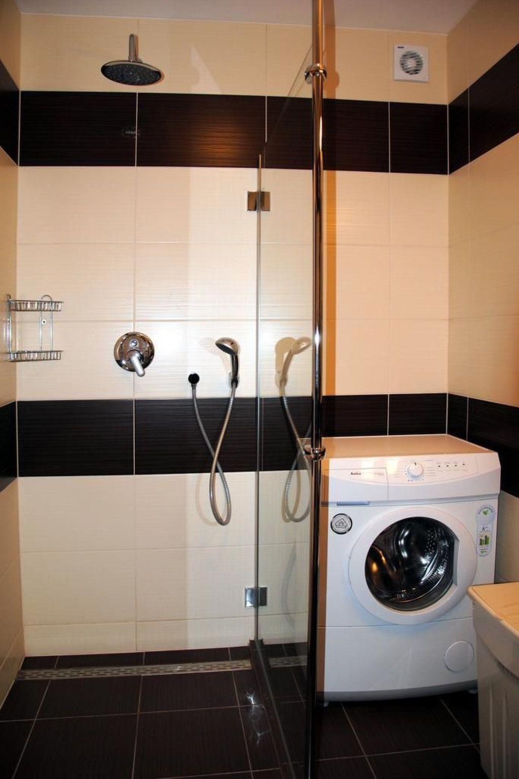 - Badezimmer mit Dusche, Waschbecken und Toilette; Ausstattung: Haartrockner, Baumwollhandtücher und Waschmaschine;