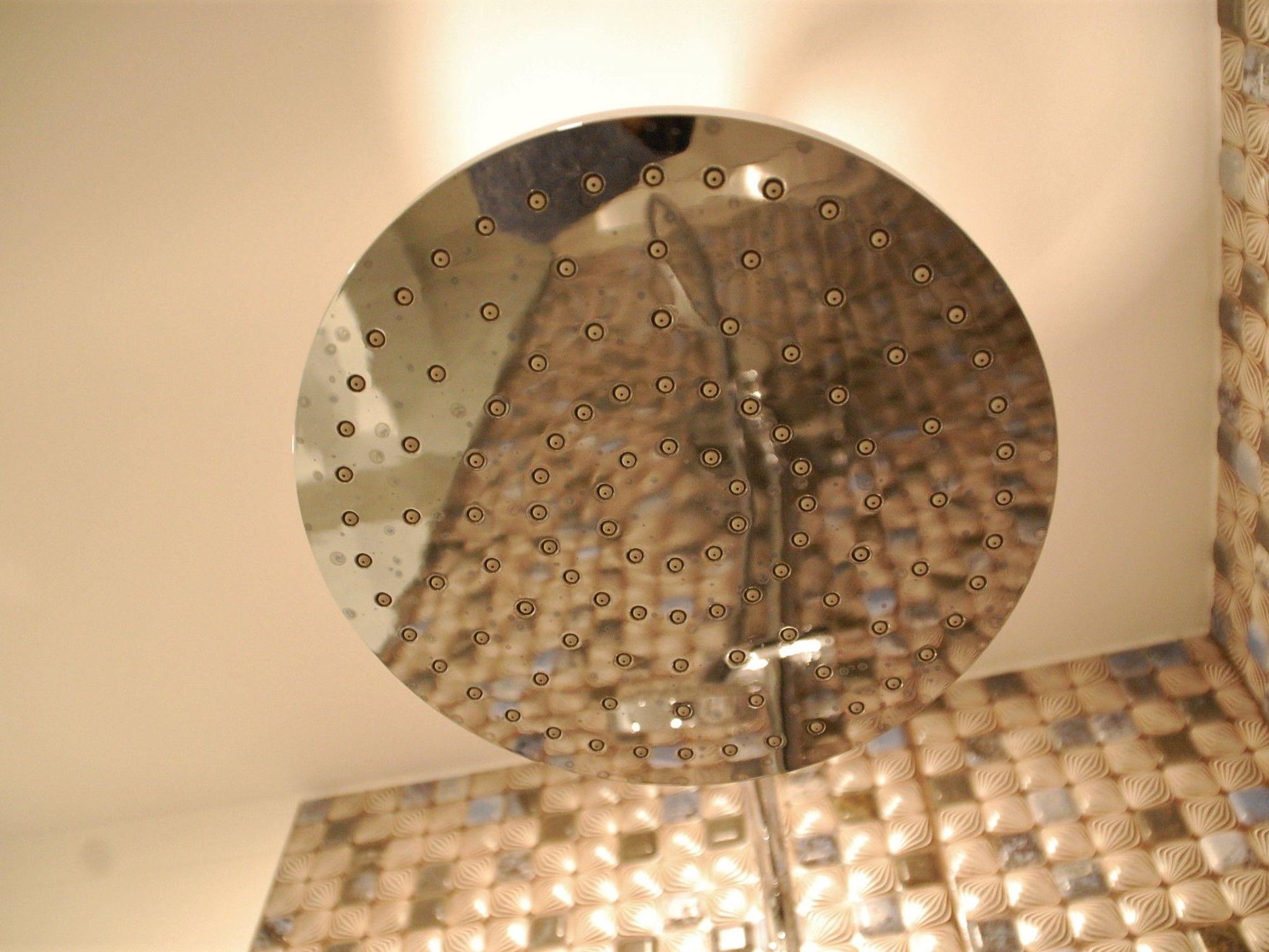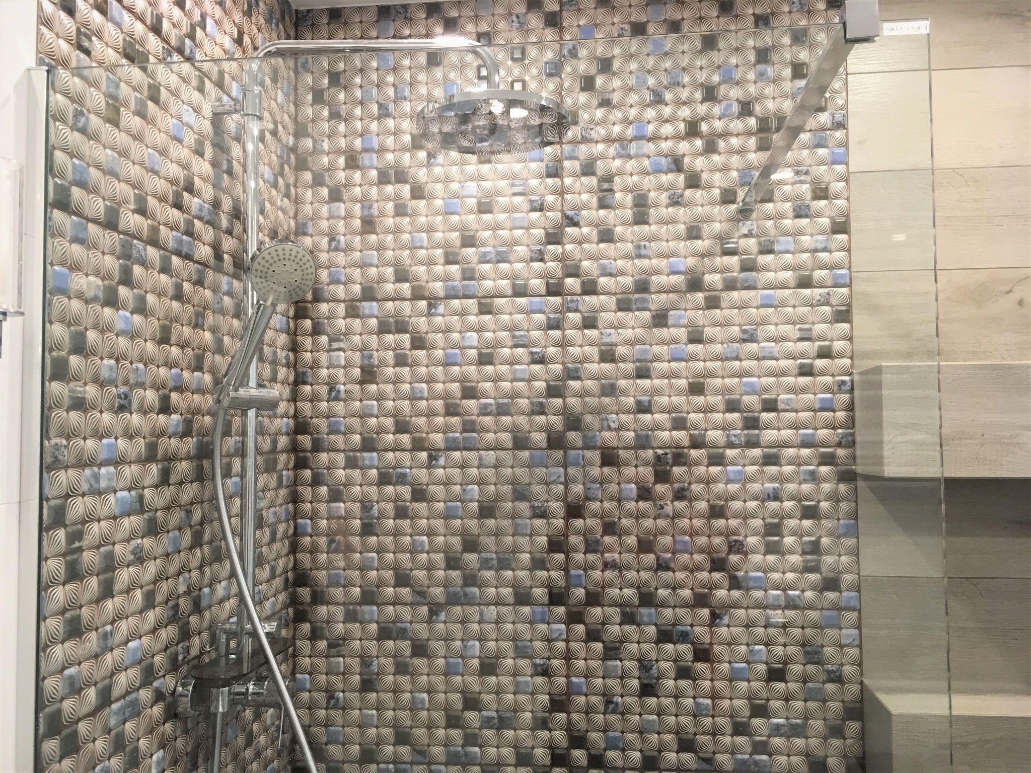 Im Badezimmer, Dusche mit Regendusche, Haartrockner, Handtücher.