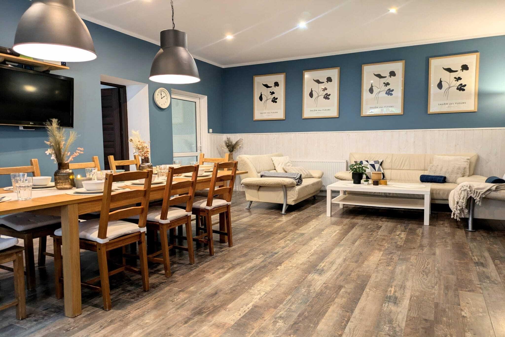 Ein gemütlicher Ferienort in unmittelbarer Nähe des Flusses Parseta. Ruhige Lage, nur wenige Schritte vom Zentrum entfernt. Zum Strand sind es 650 m. In der Nähe befindet sich der Fischmarkt, wo Sie frischen Fisch direkt vom Kutter kaufen können. Die komfortable, sehr geräumige Wohnung (Erdgeschoss) bietet Platz für bis zu 14 Personen. Sie besteht aus einem Wohnzimmer (großer Tisch, Fernseher, Videospielkonsole) und einer perfekt ausgestatteten Küche. Es gibt vier separate Schlafzimmer, zwei Badezimmer mit Duschen (eine Waschmaschine ist vorhanden) und ein separates WC. Eine überdachte Terrasse mit Gartenmöbeln und Liegestühlen ist ebenfalls vorhanden. Ein Spielplatz mit Trampolin ist ebenfalls vorhanden. Zentralheizung und WLAN sind verfügbar. Auf dem eingezäunten Gelände befinden sich eine Sauna (im Aufenthaltspreis inbegriffen) mit Badewanne zum Abkühlen, eine Sommerküche, ein Parkplatz und ein schöner Grillpavillon mit Grillzubehör. Vom Grundstück aus haben Sie direkten Zugang zum Flussufer, wo Sie auf Liegestühlen entspannen oder beim Angeln entspannen können. Allen Gästen der Anlage steht außerdem ein Ruderboot kostenlos zur Verfügung. Frühstück kann vor Ort erworben werden. Im Aufenthaltspreis enthalten sind: Bettwäsche, Handtücher, Strom- und Wasserverbrauch, Sauna, Endreinigung, Internet, Parkplatz, Kinderbett und Hochstuhl (Reservierung erforderlich) sowie Ruderboot. Die größte Attraktion des Kurorts Kolobrzeg ist der breite Sandstrand. Es gibt auch zahlreiche Spazierwege im Strandpark, entlang der Strandpromenade, der historischen Mole und in der Altstadt. Sehenswert sind der Leuchtturm, das Ozeanarium, der Seehafen und die Kathedrale. Familien mit Kindern empfehlen wir den Pomerania Fun Park. Dieser ganzjährig geöffnete Park befindet sich im Dorf Dygowo (ca. 15 km von Kolobrzeg entfernt).