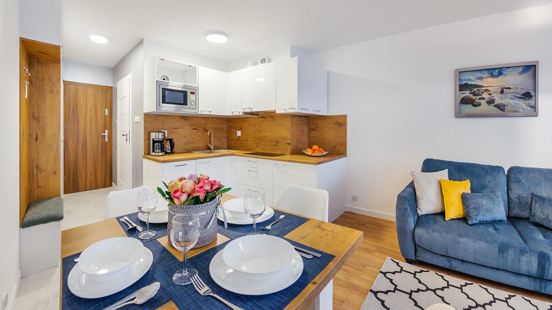 • Haustiere sind in der ausgewählten Wohnung erlaubt. Die Kosten für den Aufenthalt mit einem Haustier betragen 40 PLN pro Tag.