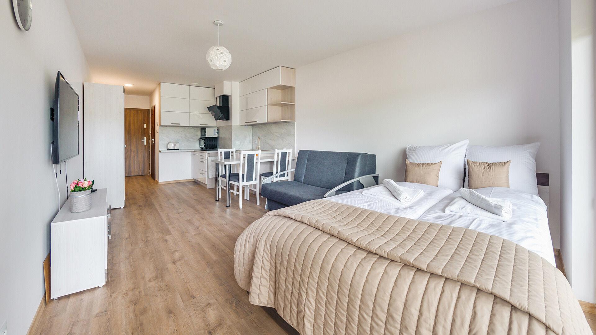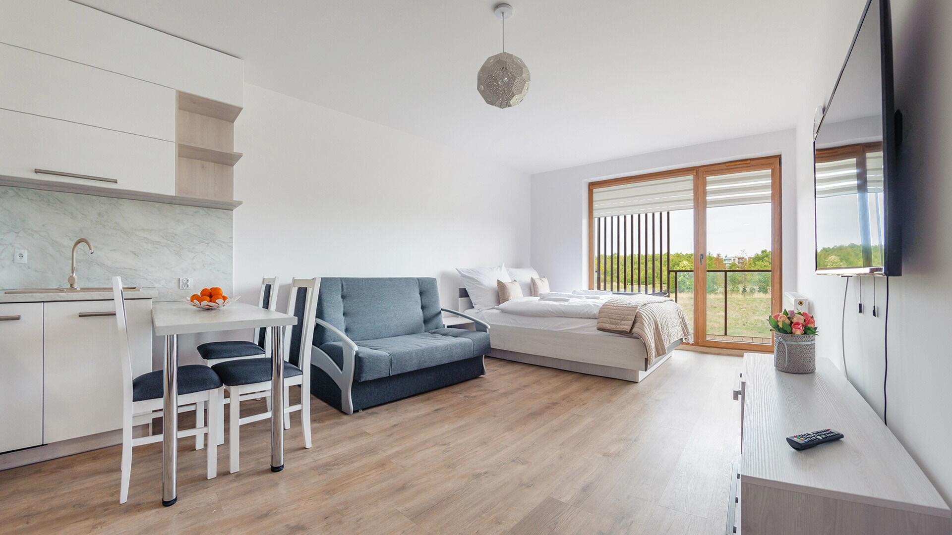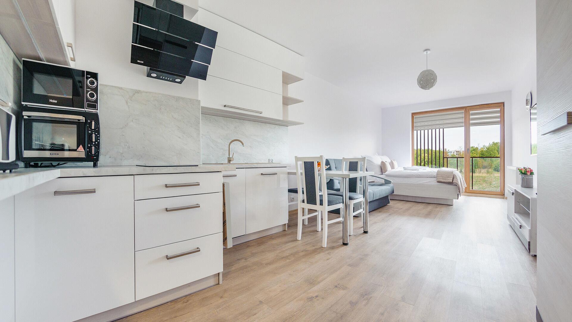 • Haustiere sind in der ausgewählten Wohnung erlaubt. Die Kosten für den Aufenthalt mit einem Haustier betragen 40 PLN pro Tag.