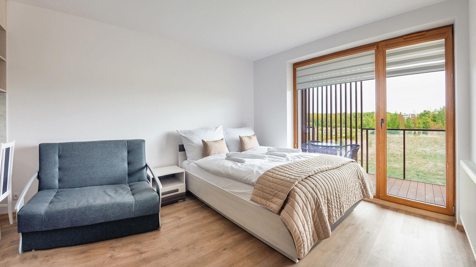 Die Apartments im Resorts Kolobrzeg liegen im ruhigen, westlichen Teil der Stadt, umgeben vom NATURA-2000-Park und nur wenige Minuten vom breiten Weststrand sowie einem Hundestrand entfernt. Die Lage bietet saubere Luft, direkten Kontakt zur Natur und Zugang zu Rad- und Spazierwegen. Die Apartments sind hochwertig ausgestattet und verfügen über voll ausgestattete Küchenzeilen sowie große Terrassen. Auf dem Gelände stehen nummerierte Außenparkplätze und Tiefgaragenplätze gegen Aufpreis zur Verfügung, zudem gibt es einen öffentlichen, kostenpflichtigen Parkplatz vor dem Gebäude. Gästen stehen ein täglich geöffneter Pool sowie eine Sauna zur Verfügung. Kolobrzeg bietet das ganze Jahr über zahlreiche Freizeit- und Kulturangebote sowie eine vielfältige Gastronomie.