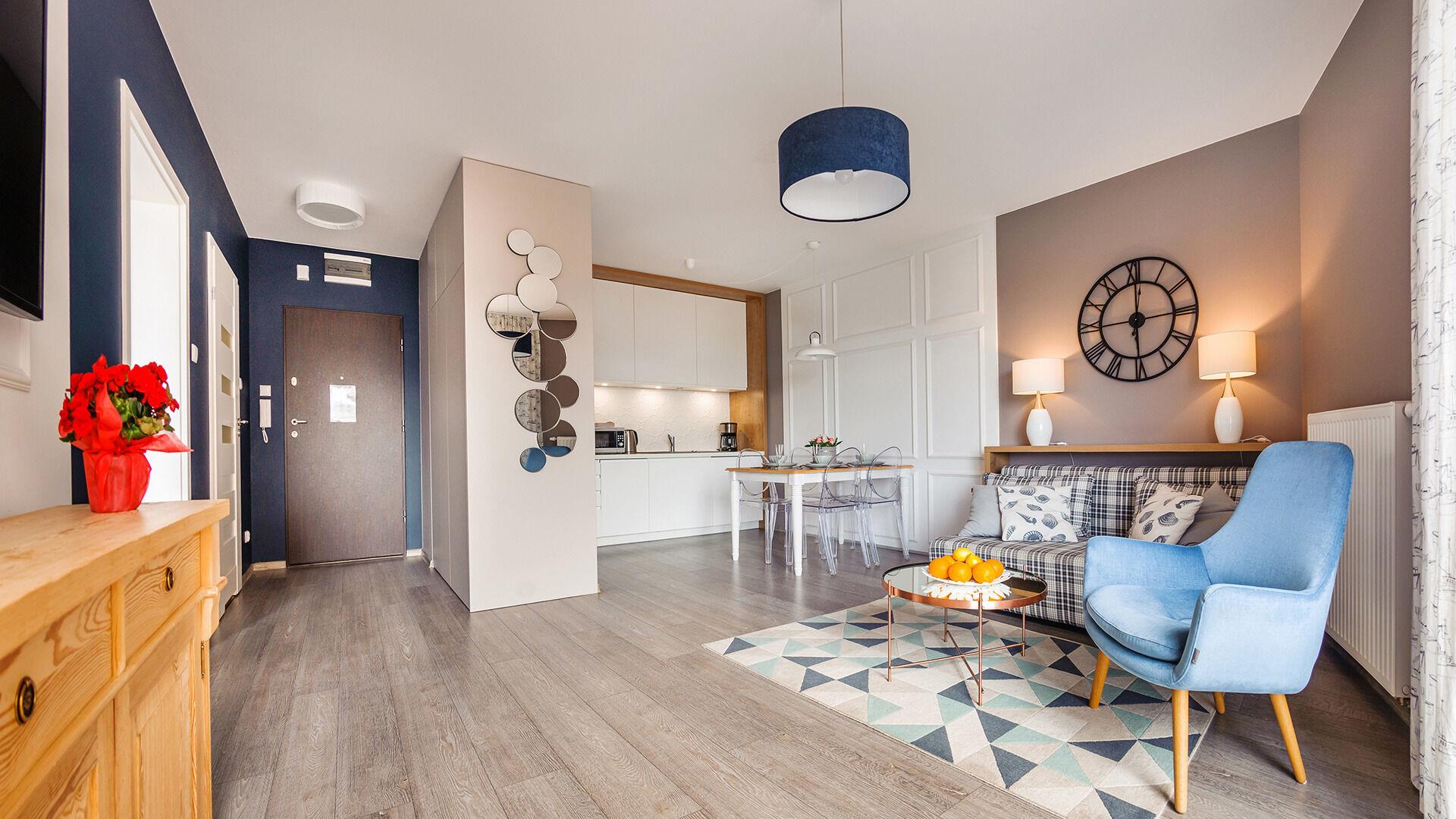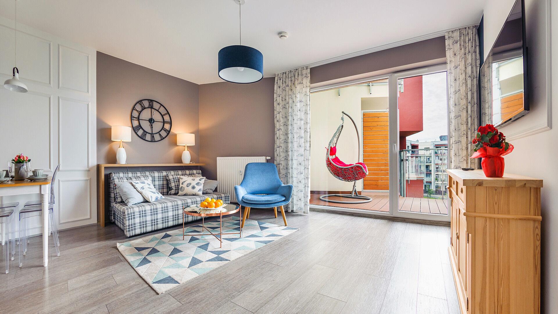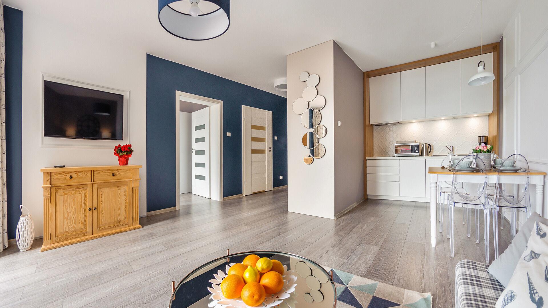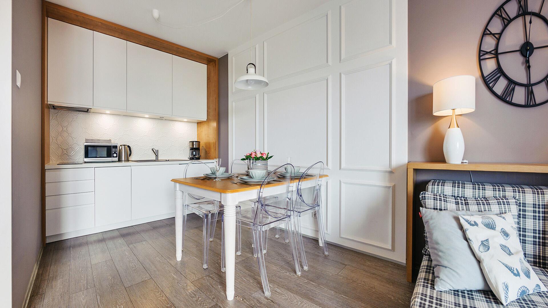 • Haustiere sind in der ausgewählten Wohnung erlaubt. Die Kosten für den Aufenthalt mit einem Haustier betragen 40 PLN pro Tag.