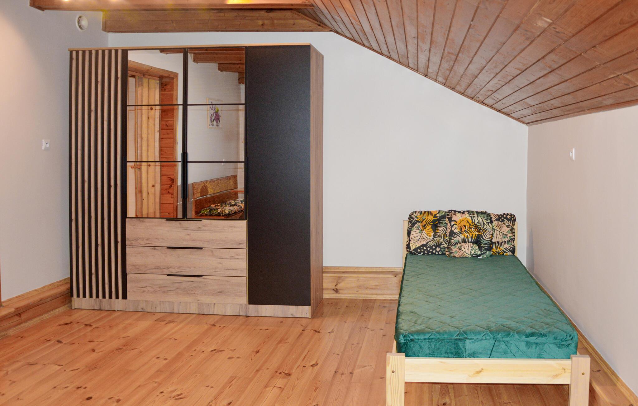 Das Ferienhaus aus Stein ist mit einer richtig gemütlichen Einrichtung versehen und ist perfekt für alle Naturliebhaber geeignet. In der Nähe finden Sie eine Reitschule, die eine riesige Attraktion sowohl für Kinder, als auch für die Eltern sein wird. Ein bisschen weiter, 2 km entfernt, können Sie selbst einen Ausritt auf einem gemieteten Reitpferd wagen. Auch andere Freizeitmöglichkeiten werden Sie hier problemlos unternehmen können: wandern, Rad fahren oder einfach Spaß am nahe gelegenen See haben. Bitte beachten Sie, dass 1 Schlafraum nur mit einer Schiebetür ausgestattet ist.