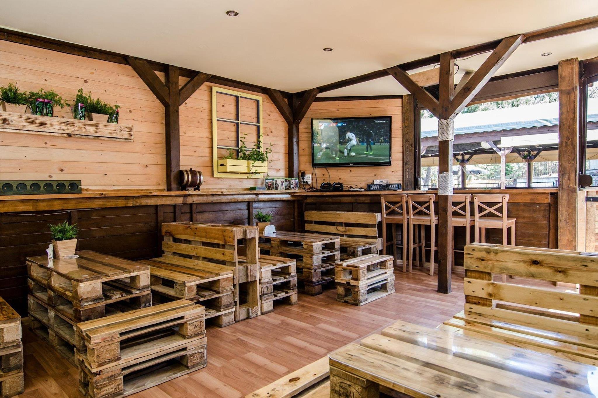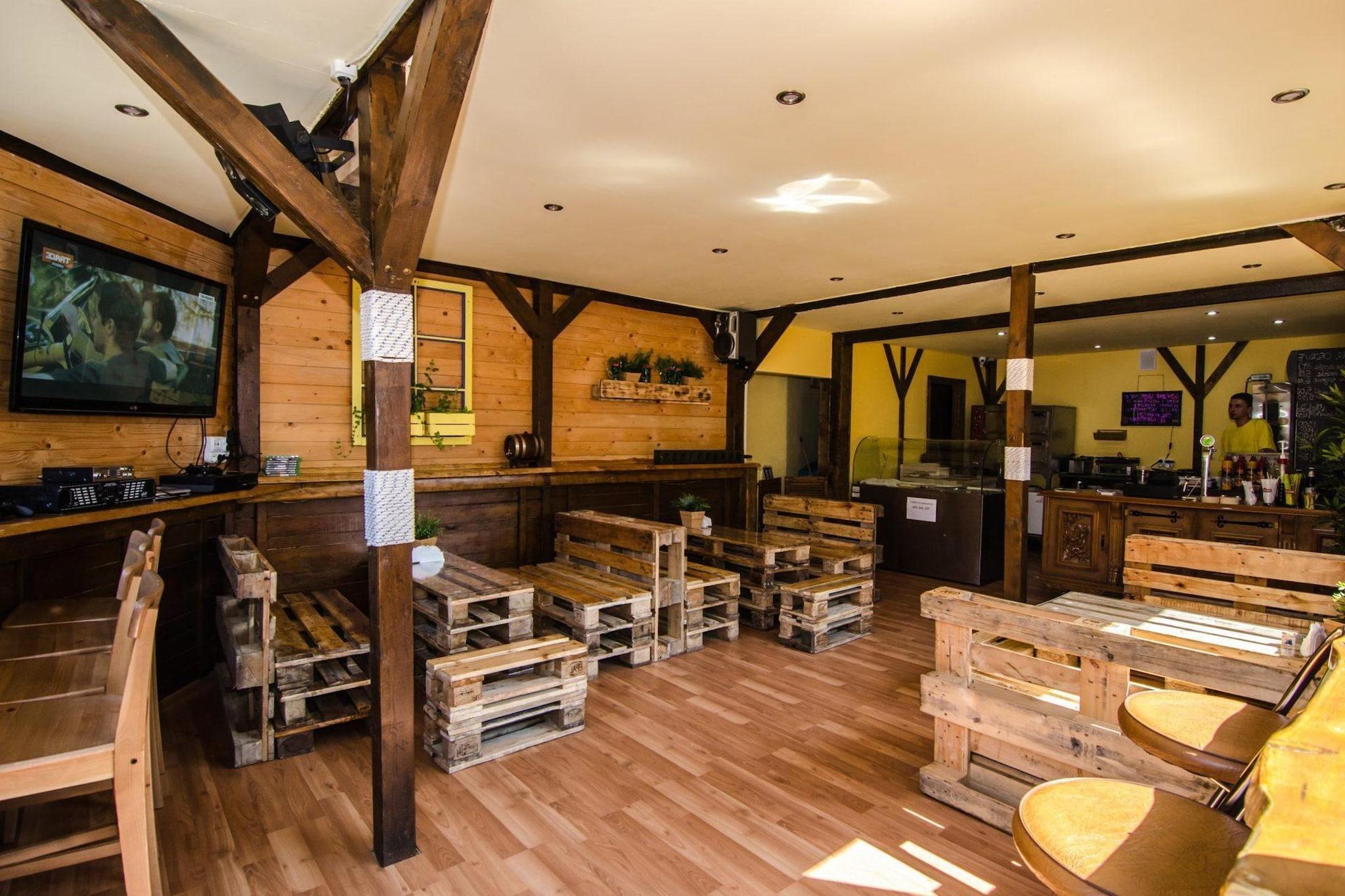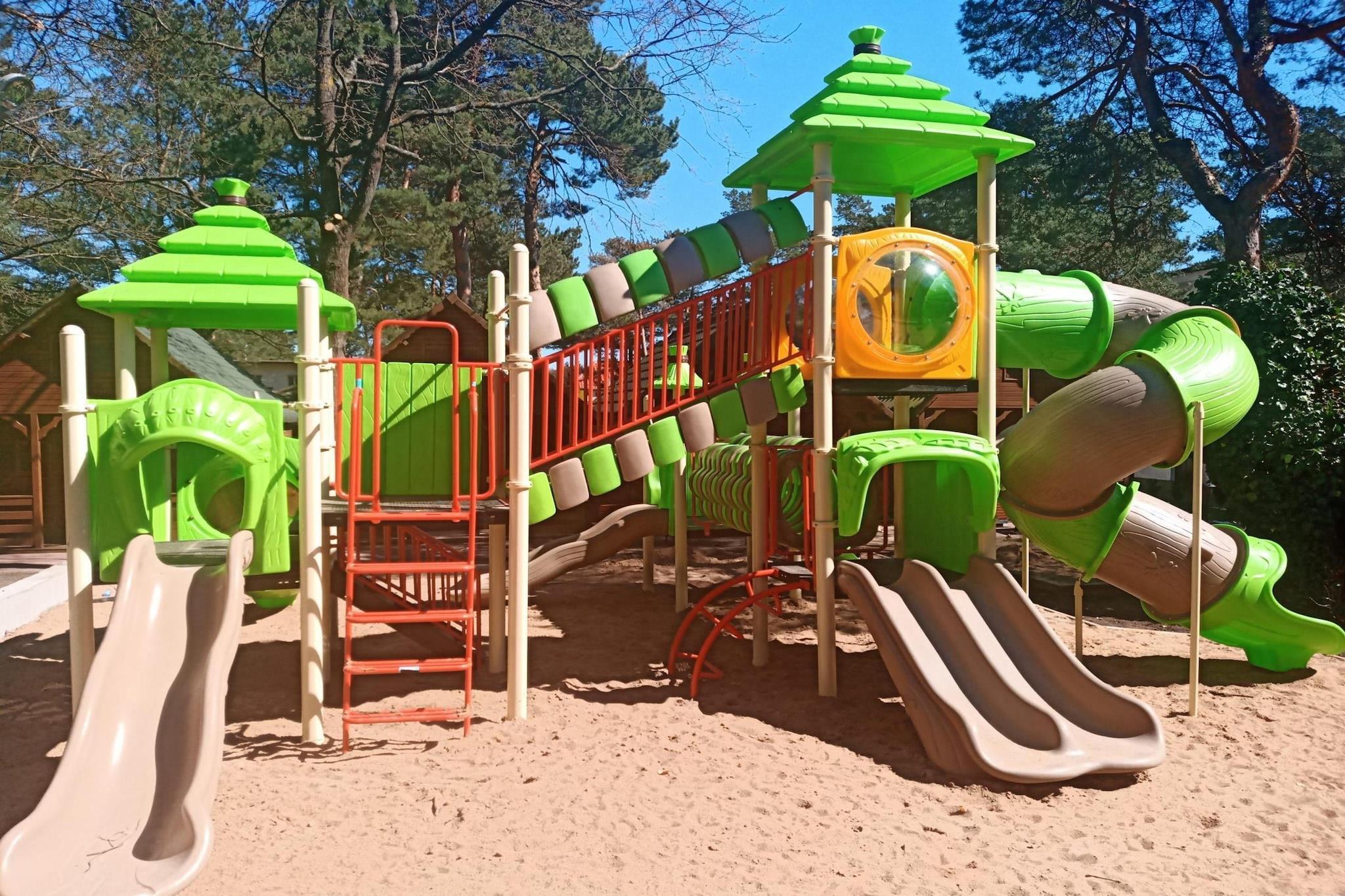 Parterre: (offene Küche(Kochplatte(1 Kochplatte, elektrisch), Wasserkocher, Mikrowelle, Kühl-/Gefrierkombination), Wohn/Esszimmer(Doppelschlafcouch, TV(Flatscreen)), Badezimmer(Dusche, Waschbecken, Toilette)) Dachgeschoss: (Galerieschlafzimmer(Einzelbett, Einzelbett)) Rezeption, Internet, Parkplatz, Restaurant, Bar, Indoor Spielraum, Spielplatz, Liegewiese, Babybadewanne, Waschmaschine(Gemeinschaftliche Nutzung mit anderen Gästen, gegen Gebühr), Heizung(elektrisch), Terrasse, Garten(Gemeinschaftliche Nutzung mit anderen Gästen, umzäunt), Gartenmöbel, Liegen, Trampolin, Sandkasten(Gemeinschaftliche Nutzung mit anderen Gästen), Rutsche(Gemeinschaftliche Nutzung mit anderen Gästen), Hochstuhl, Gartenhaus, Schaukel, Babybett (kostenpflichtig)