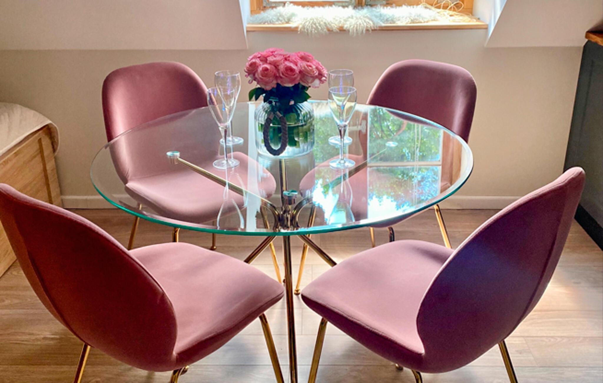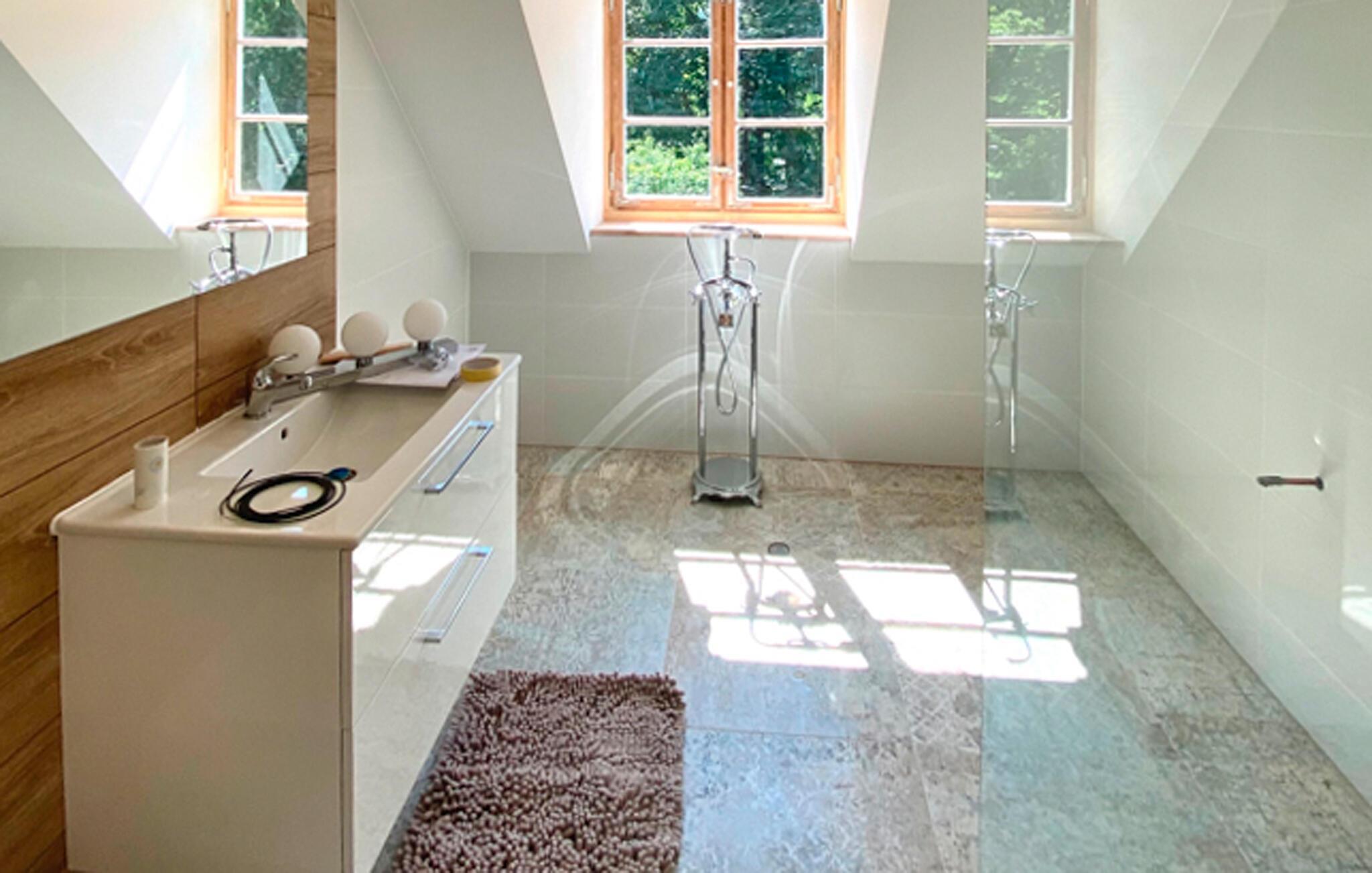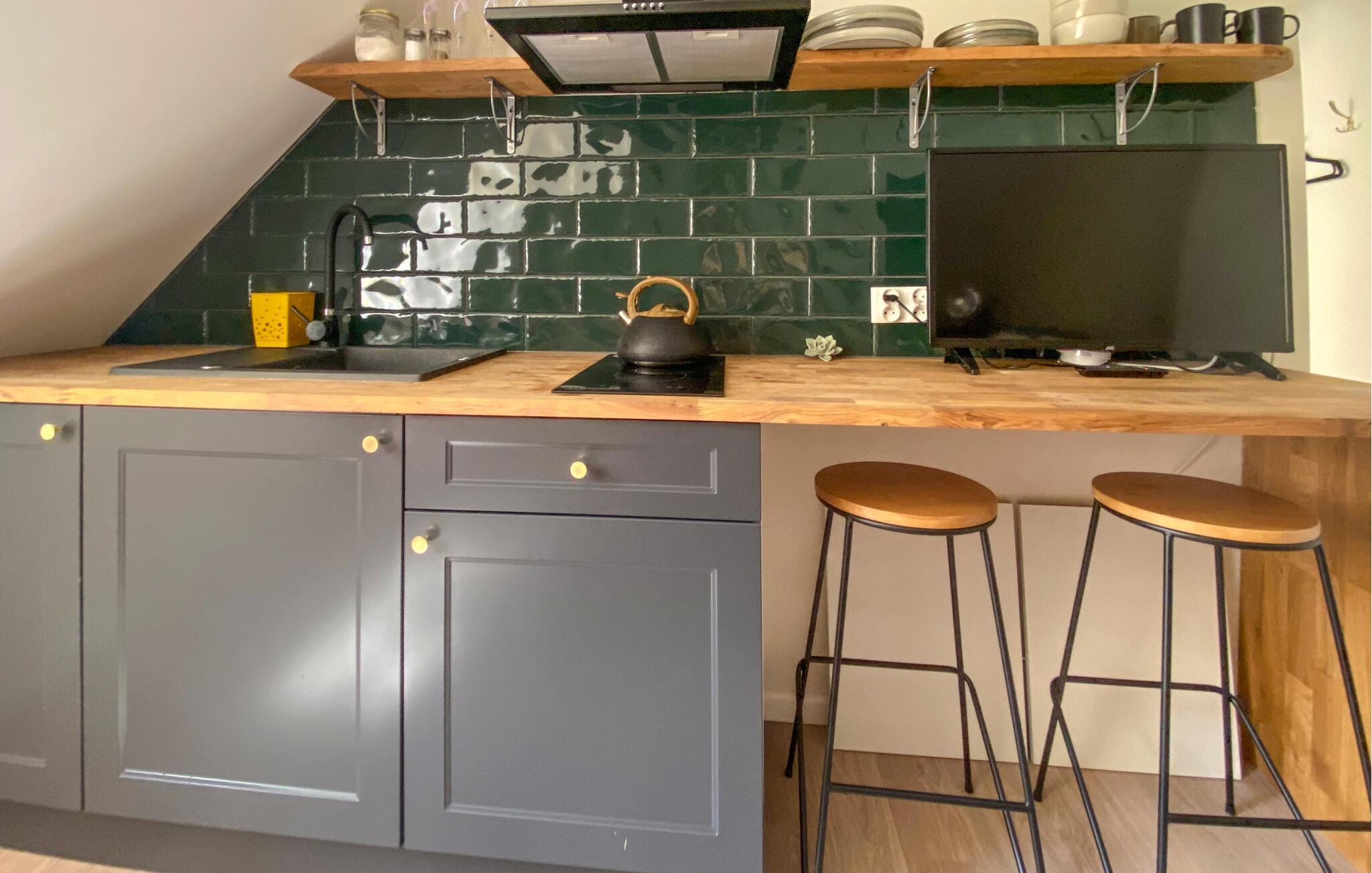 Ihre charmante Ferienwohnung eignet sich ideal für Paare oder kleine Familien, die Ruhe und Natur suchen. Genießen Sie den besonderen Charakter des Hauses, das von üppigem Grün und alten Bäumen umgeben ist. Entfliehen Sie dem Alltag und lassen Sie sich vom märchenhaften Ambiente dieses Ortes verzaubern. Im Inneren erwartet Sie eine stilvoll gestaltete Unterkunft mit viel Liebe zum Detail. Entspannen Sie auf dem gemütlichen Sofa oder genießen Sie gemeinsame Mahlzeiten am runden Esstisch mit eleganten Stühlen. Die offene Küche ist nicht nur funktional, sondern auch ein optisches Highlight.