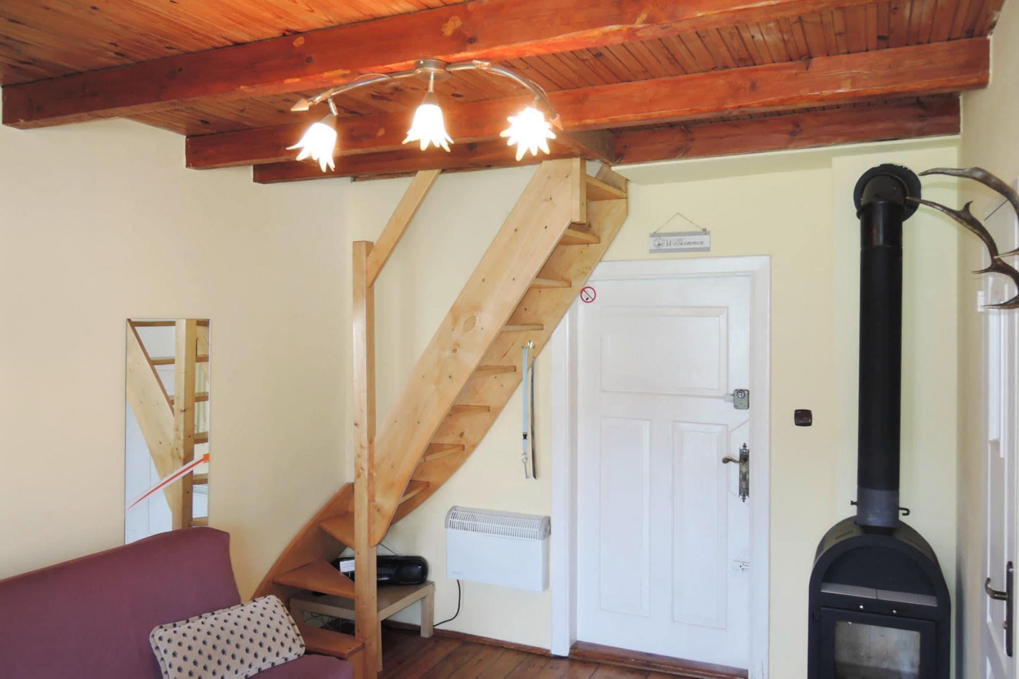 In der 1. Etage: (offene Küche(Sitzecke, Wasserkocher, Kochendwasserhahn, Toaster, Kochherd, Dunstabzugshaube, Espressomaschine, Mikrowelle, Kühl-/Gefrierkombination), Wohn-/Schlafzimmer(TV(Satellit, Deutsch Fernsehsender), Esstisch, Sitzecke), Schlafzimmer(über steile Treppe)(Einzelbett, Einzelbett, Doppelbett), Badezimmer(Dusche, Waschbecken, Toilette)) Internet, Balkon, Gartenmöbel, Parkplatz