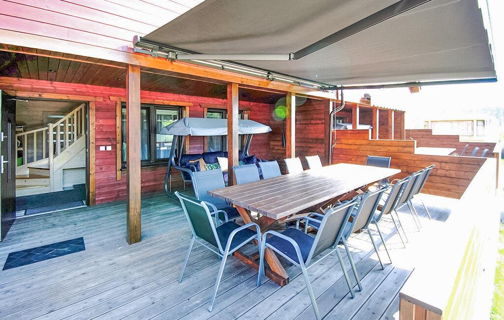 Genießen Sie die sonnengeschützte Terrasse dieses geräumigen Holzhauses – perfekt für gemeinsame Familienmomente im Freien!
