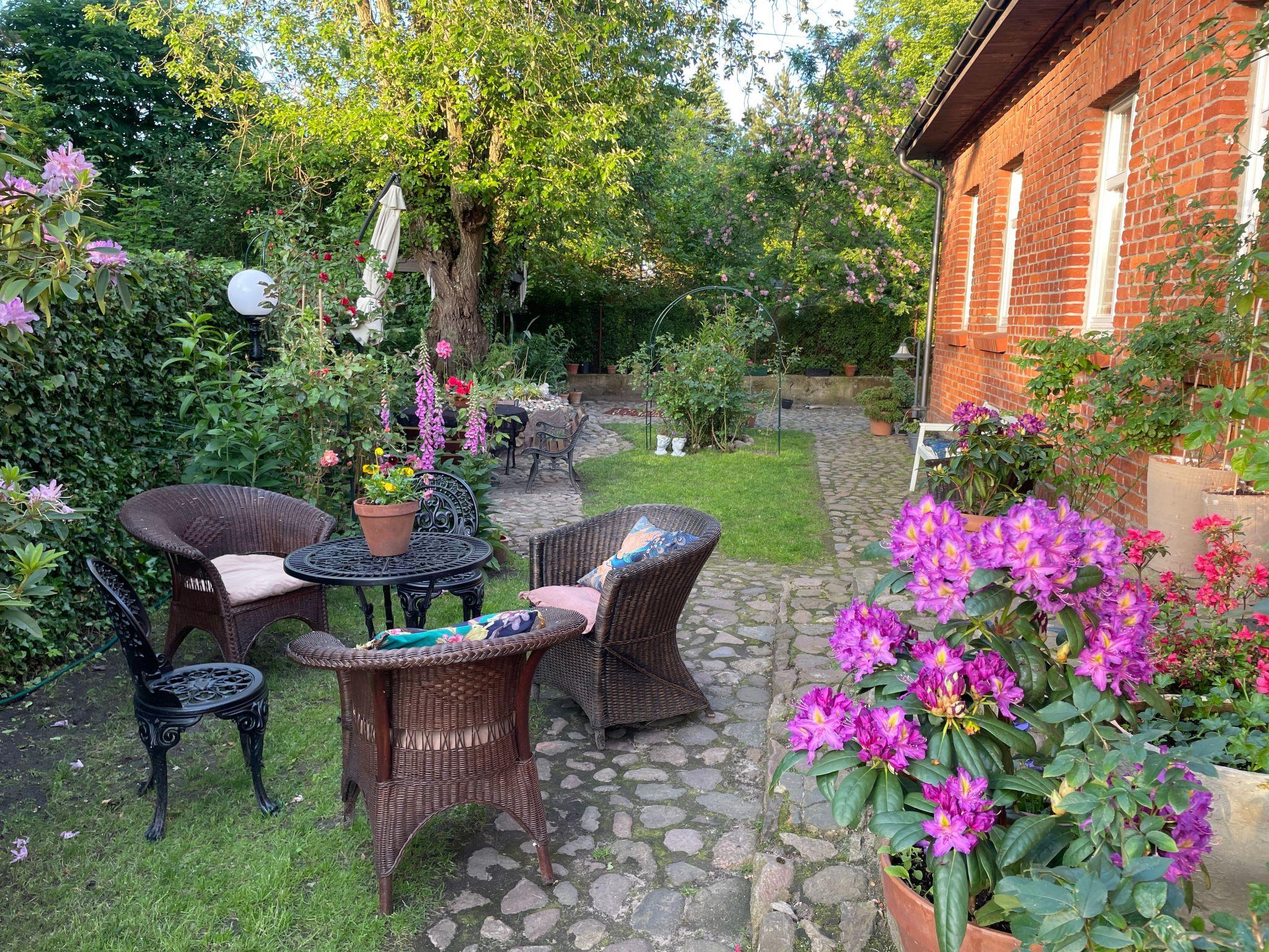 Zum Haus gehört ein kleiner Garten mit einer schönen Sitzecke, einer Schaukel und einem Grillplatz. Für die Kinder gibt es einen schön angelegten Spielplatz mit Sand, direkt neben dem Haus. Die Eltern können die Kinder von den Fenstern des Hauses aus sehen.