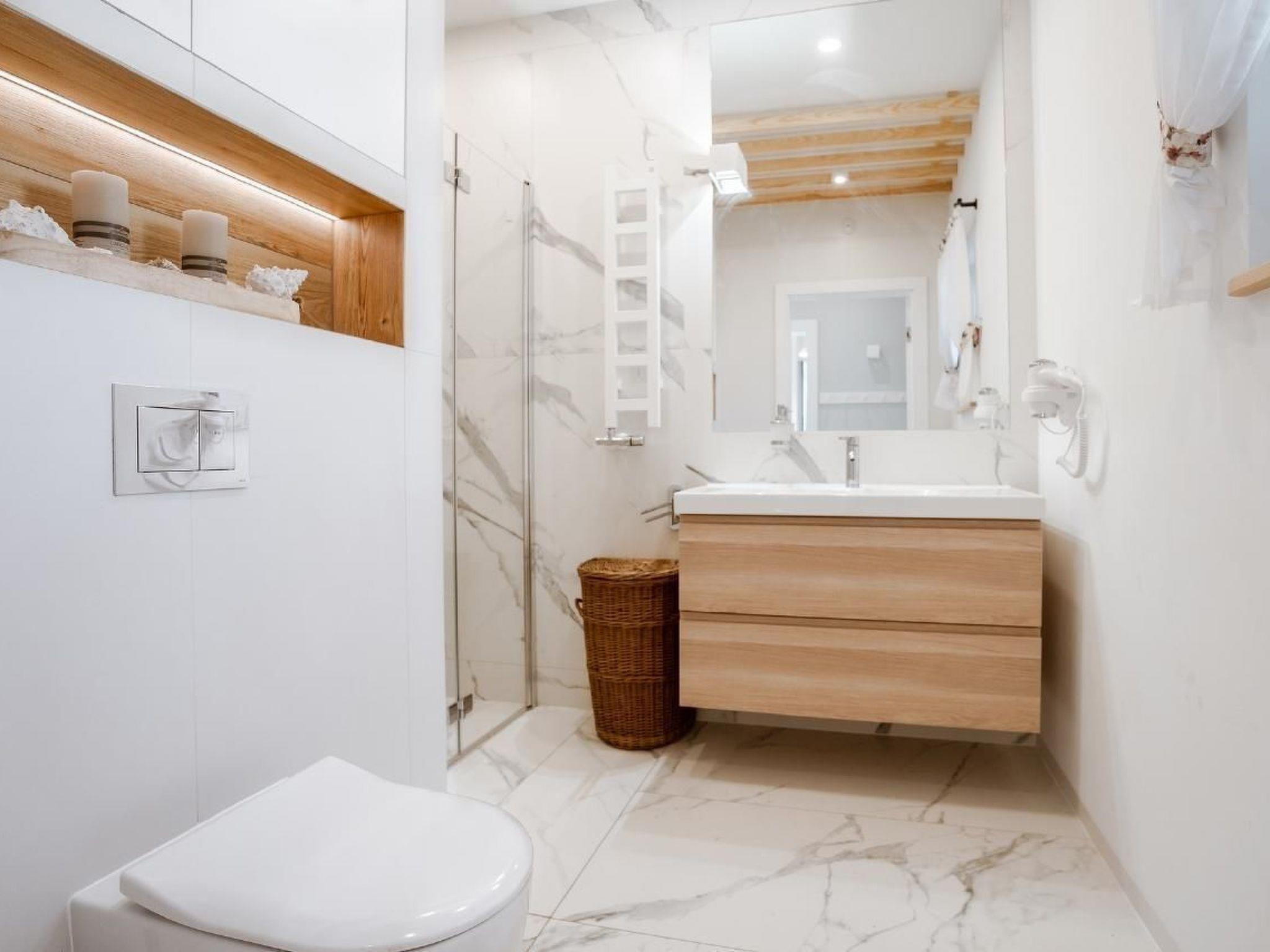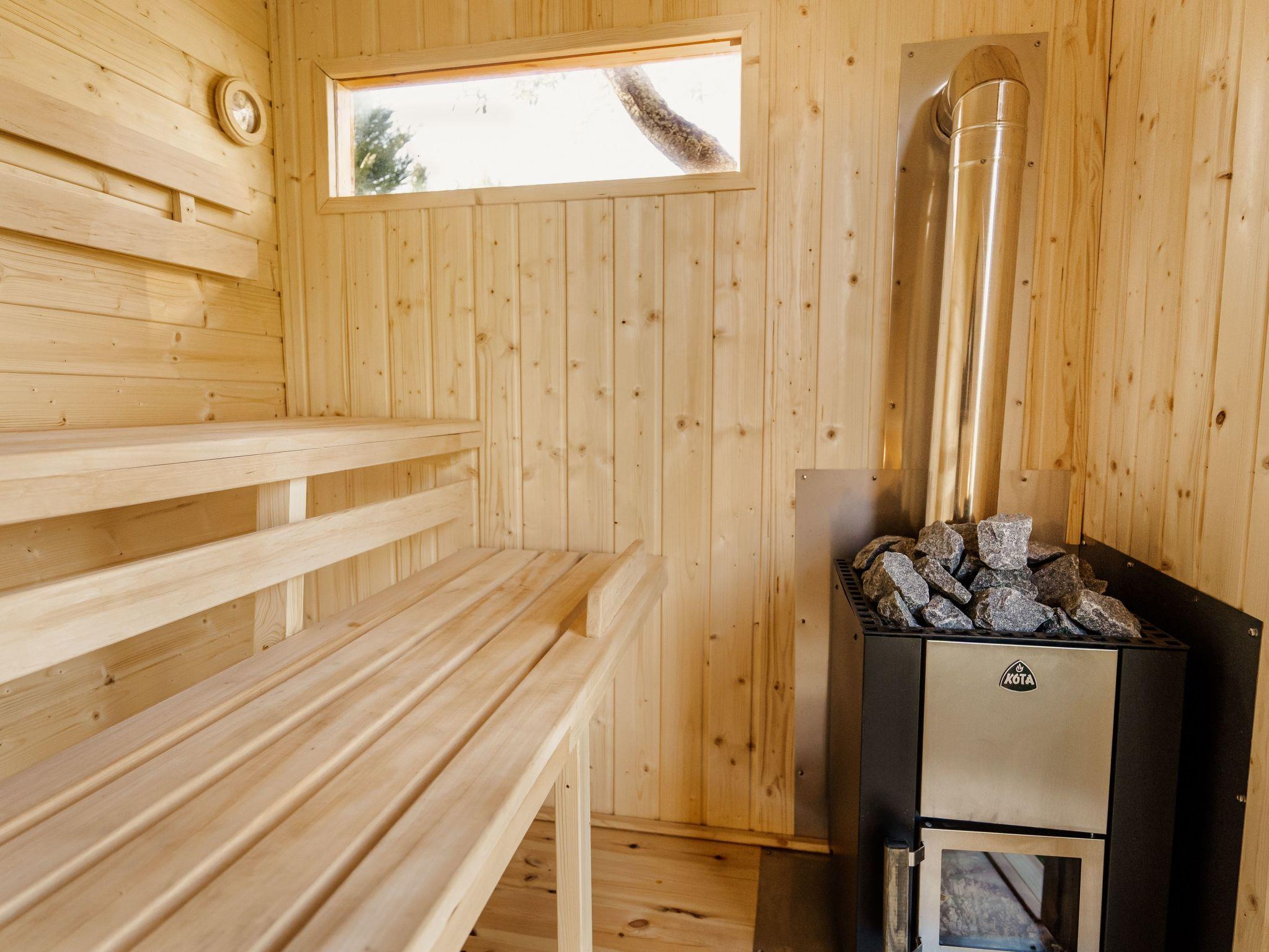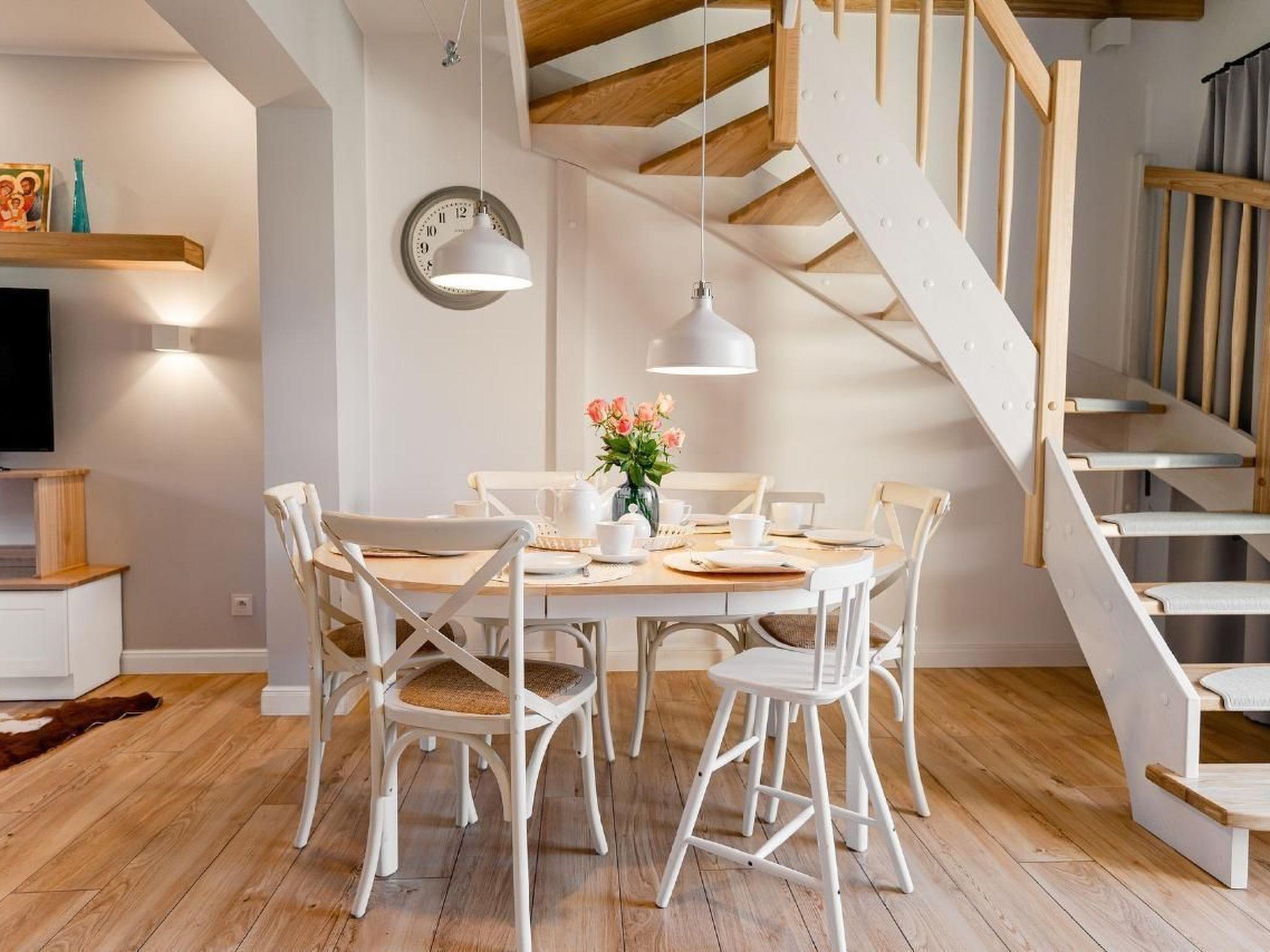 Im Erdgeschoss des Hauses befindet sich eine voll ausgestattete Küche. Sie können hier ein exquisites Abendessen zubereiten, einen Kuchen backen oder einen schnellen Snack in einer Mikrowelle zubereiten. Im Wohnzimmer stehen unseren Gästen ein bequemes Sofa, ein Fernseher und ein stilvoller Kamin zur Verfügung. Bei schlechtem Wetter lädt das offene Esszimmer in Kombination mit dem Wohnbereich dazu ein, bei Gesellschaftsspielen Zeit miteinander zu verbringen oder sich bei einem guten Glas Wein zu unterhalten. Balkonschiebetüren ermöglichen im Sommer den direkten Zugang zur Terrasse, auf der Sie Ihre Mahlzeiten an einem großen Tisch mit Holzbänken genießen können. Das Erdgeschoss verfügt außerdem über ein geräumiges Badezimmer mit Waschbecken, Toilette und barrierefreier Dusche sowie eine weitere separate Toilette mit Waschgelegenheit.