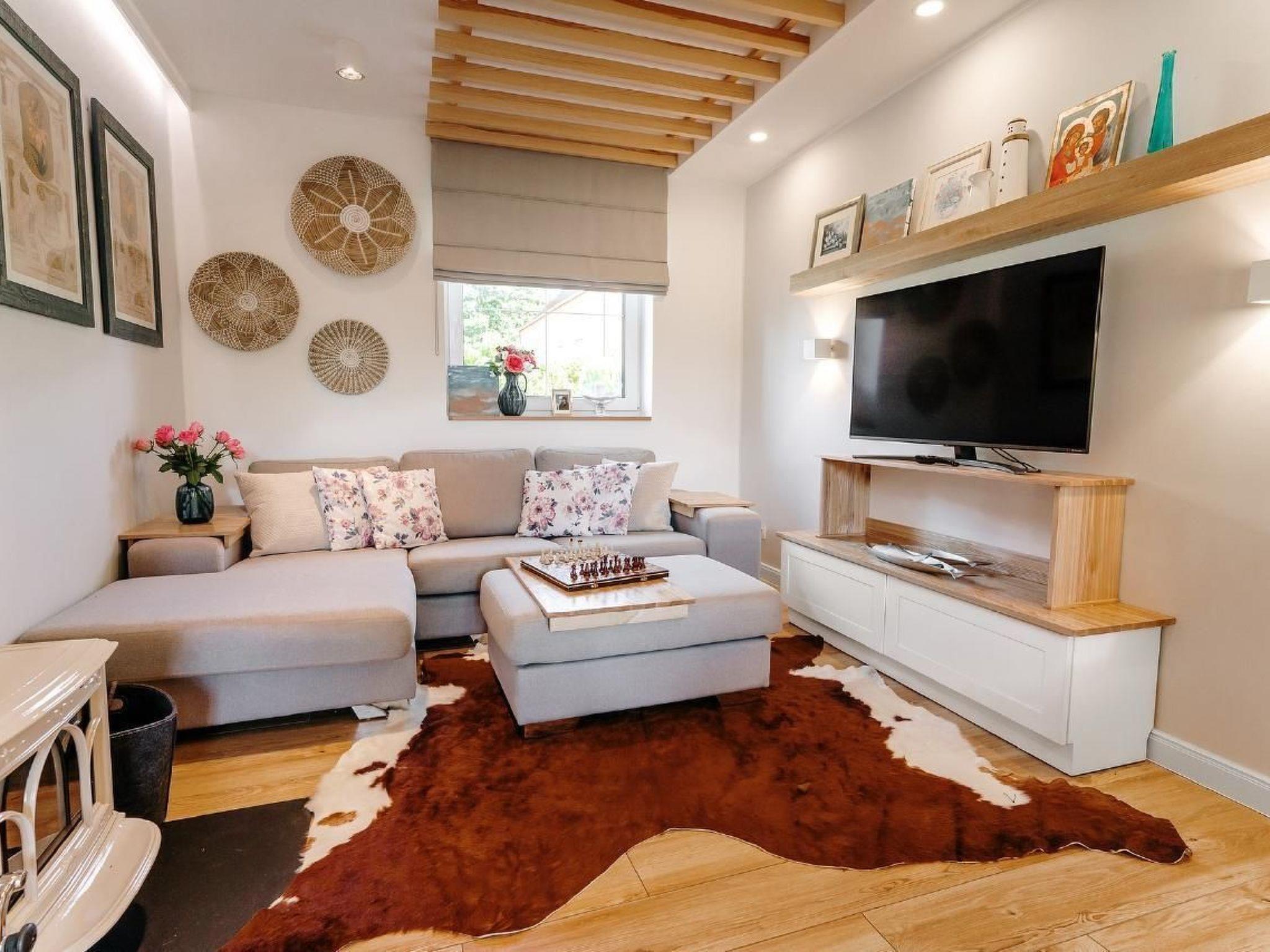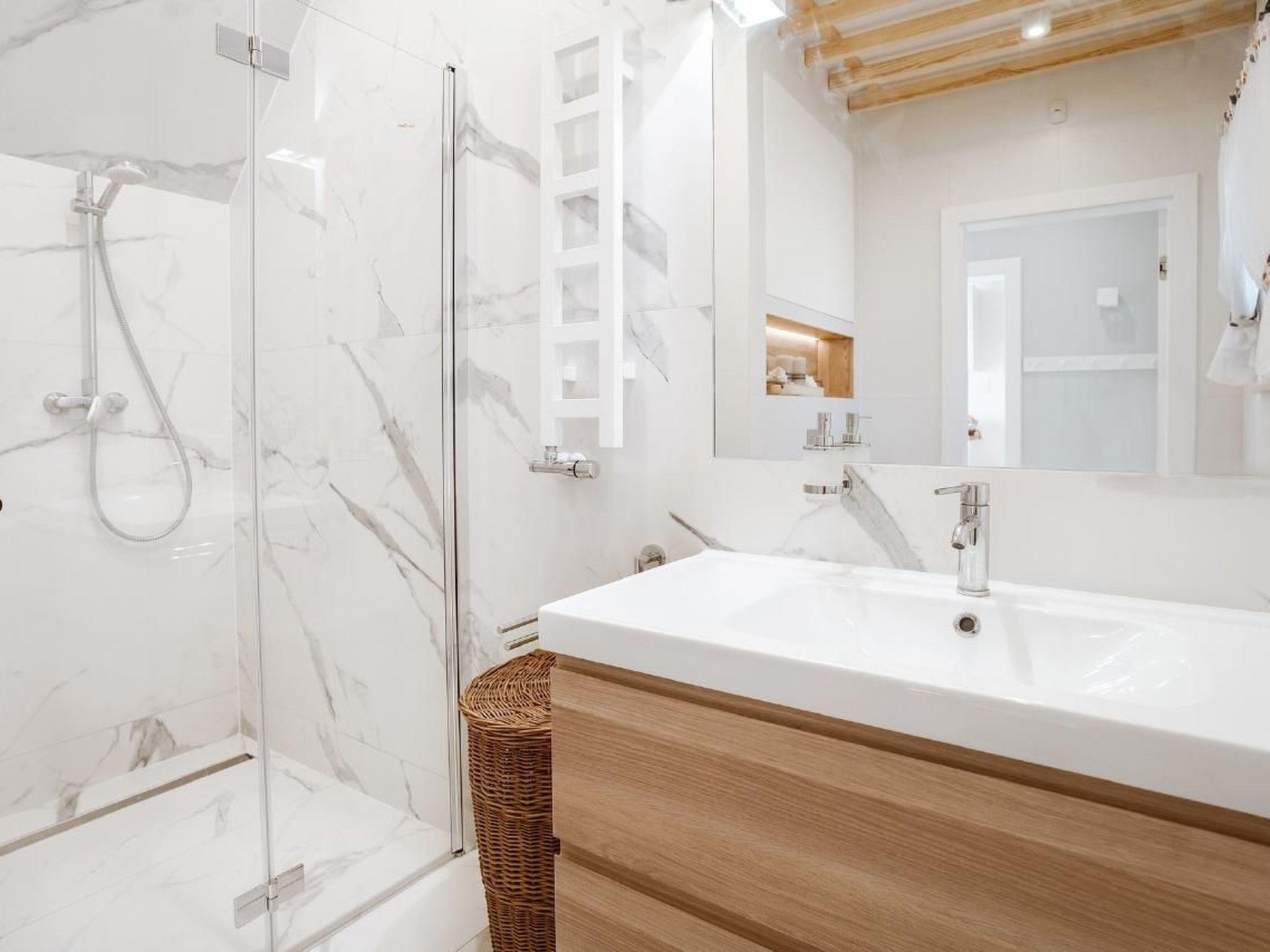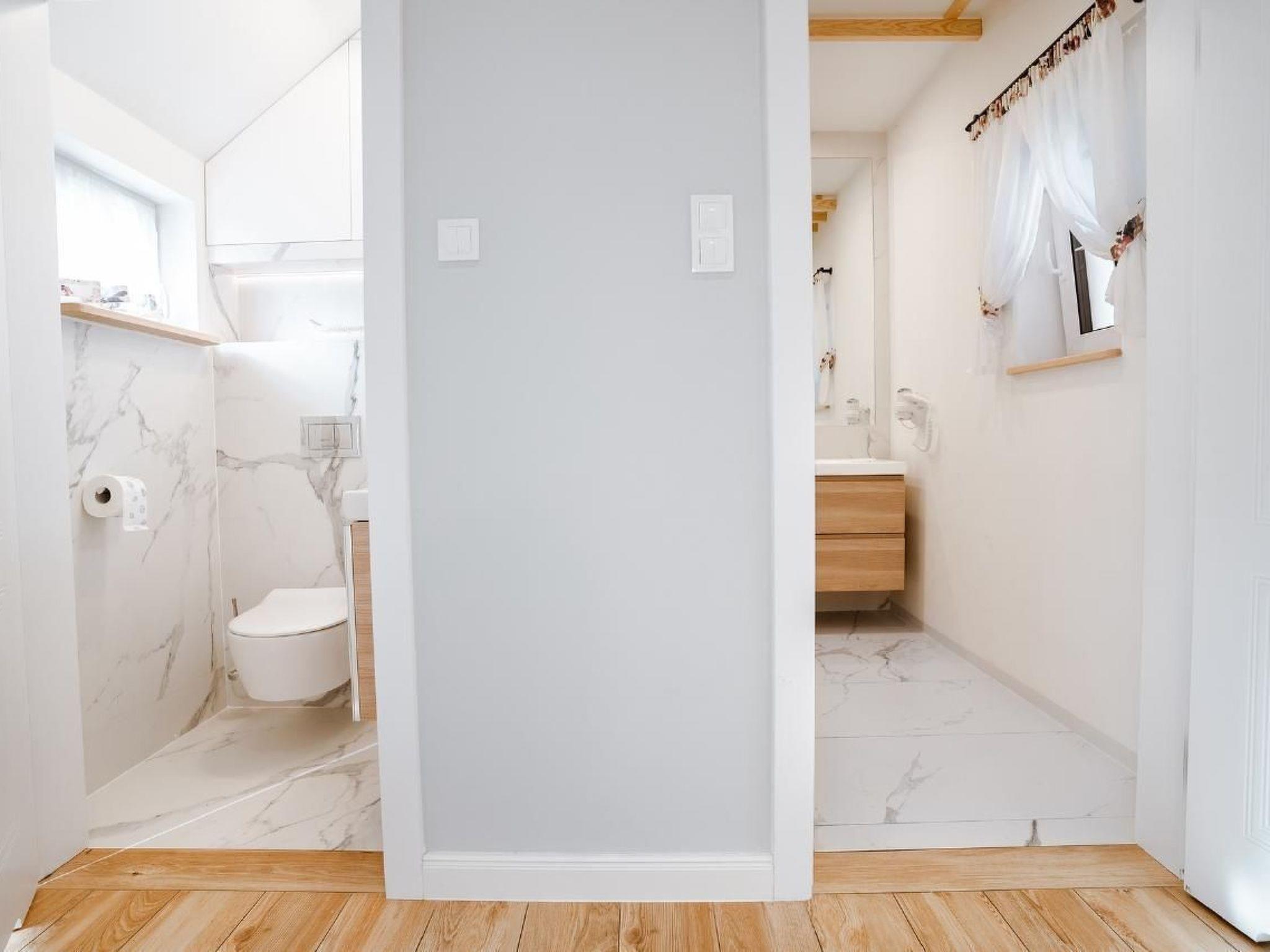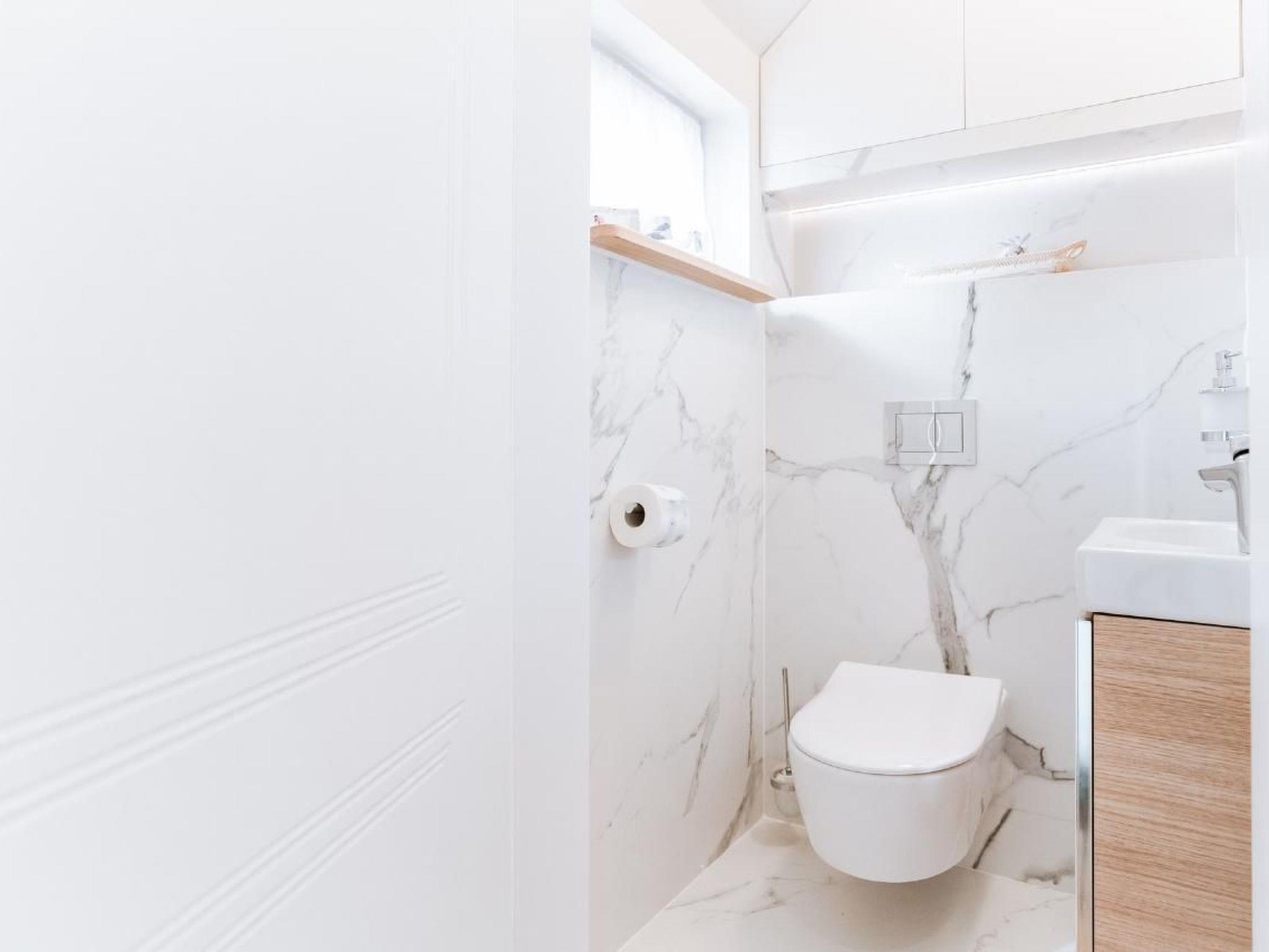Im Erdgeschoss des Hauses befindet sich eine voll ausgestattete Küche. Sie können hier ein exquisites Abendessen zubereiten, einen Kuchen backen oder einen schnellen Snack in einer Mikrowelle zubereiten. Im Wohnzimmer stehen unseren Gästen ein bequemes Sofa, ein Fernseher und ein stilvoller Kamin zur Verfügung. Bei schlechtem Wetter lädt das offene Esszimmer in Kombination mit dem Wohnbereich dazu ein, bei Gesellschaftsspielen Zeit miteinander zu verbringen oder sich bei einem guten Glas Wein zu unterhalten. Balkonschiebetüren ermöglichen im Sommer den direkten Zugang zur Terrasse, auf der Sie Ihre Mahlzeiten an einem großen Tisch mit Holzbänken genießen können. Das Erdgeschoss verfügt außerdem über ein geräumiges Badezimmer mit Waschbecken, Toilette und barrierefreier Dusche sowie eine weitere separate Toilette mit Waschgelegenheit.