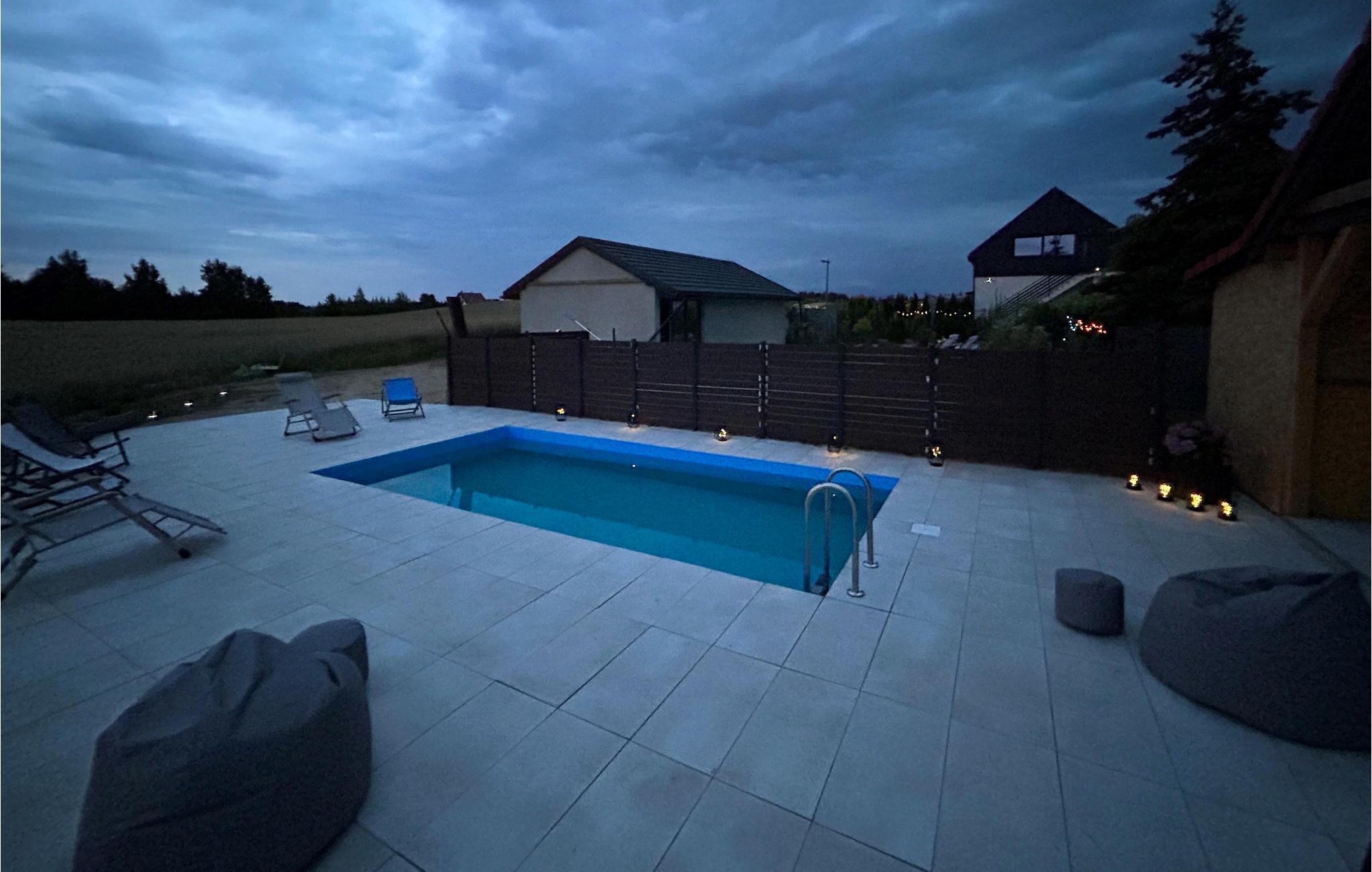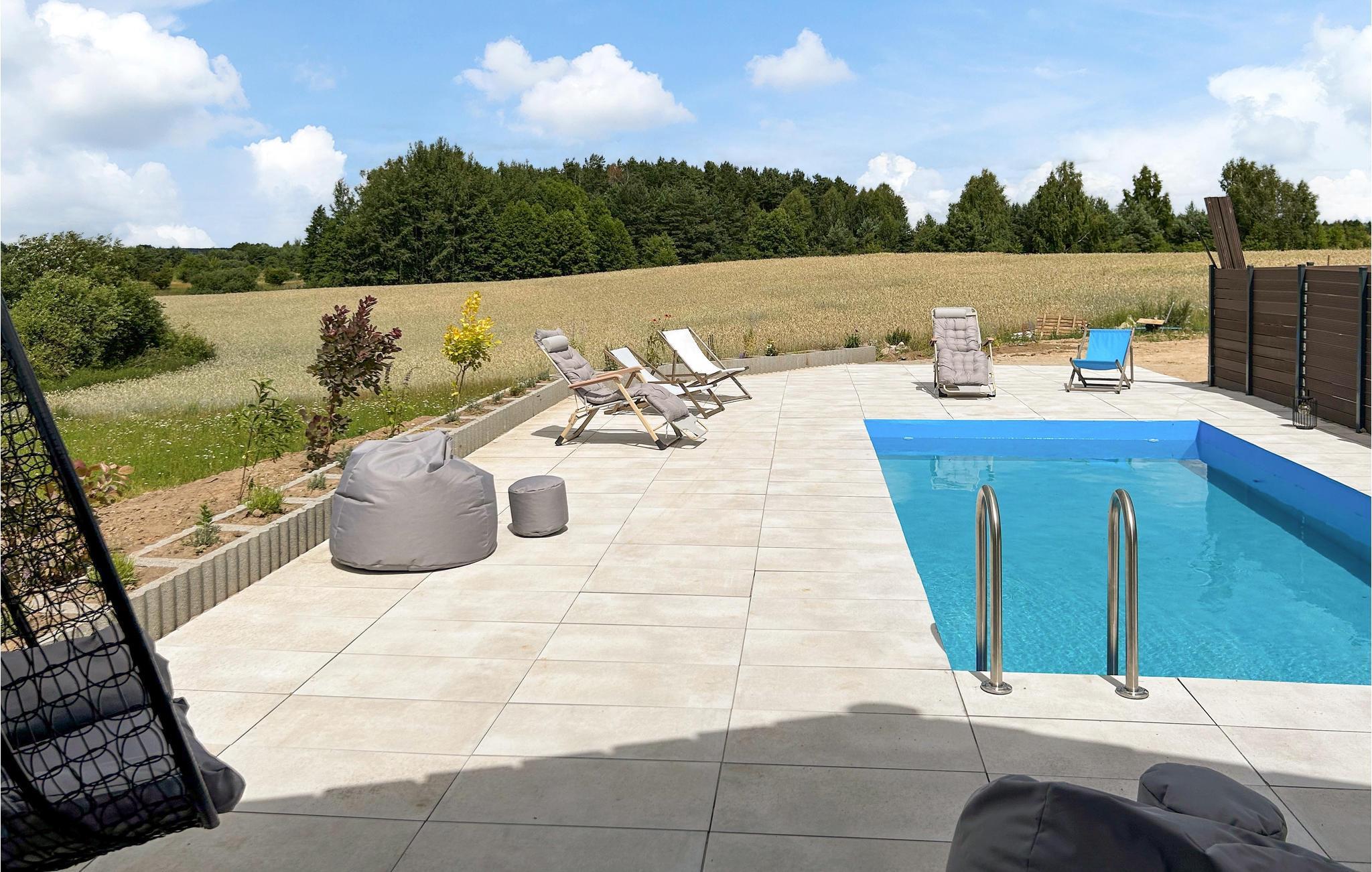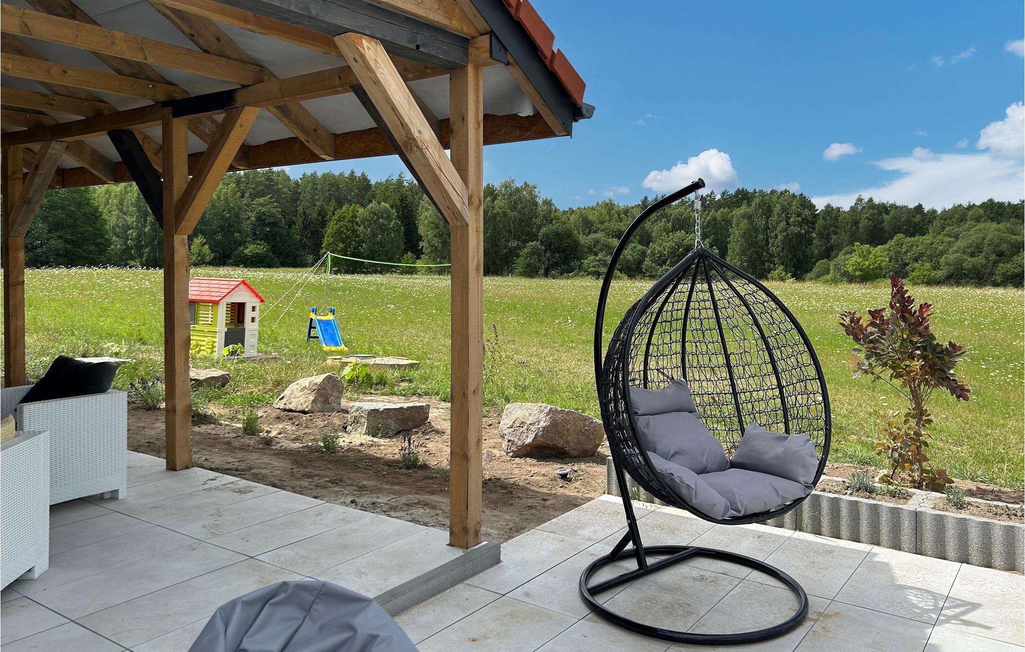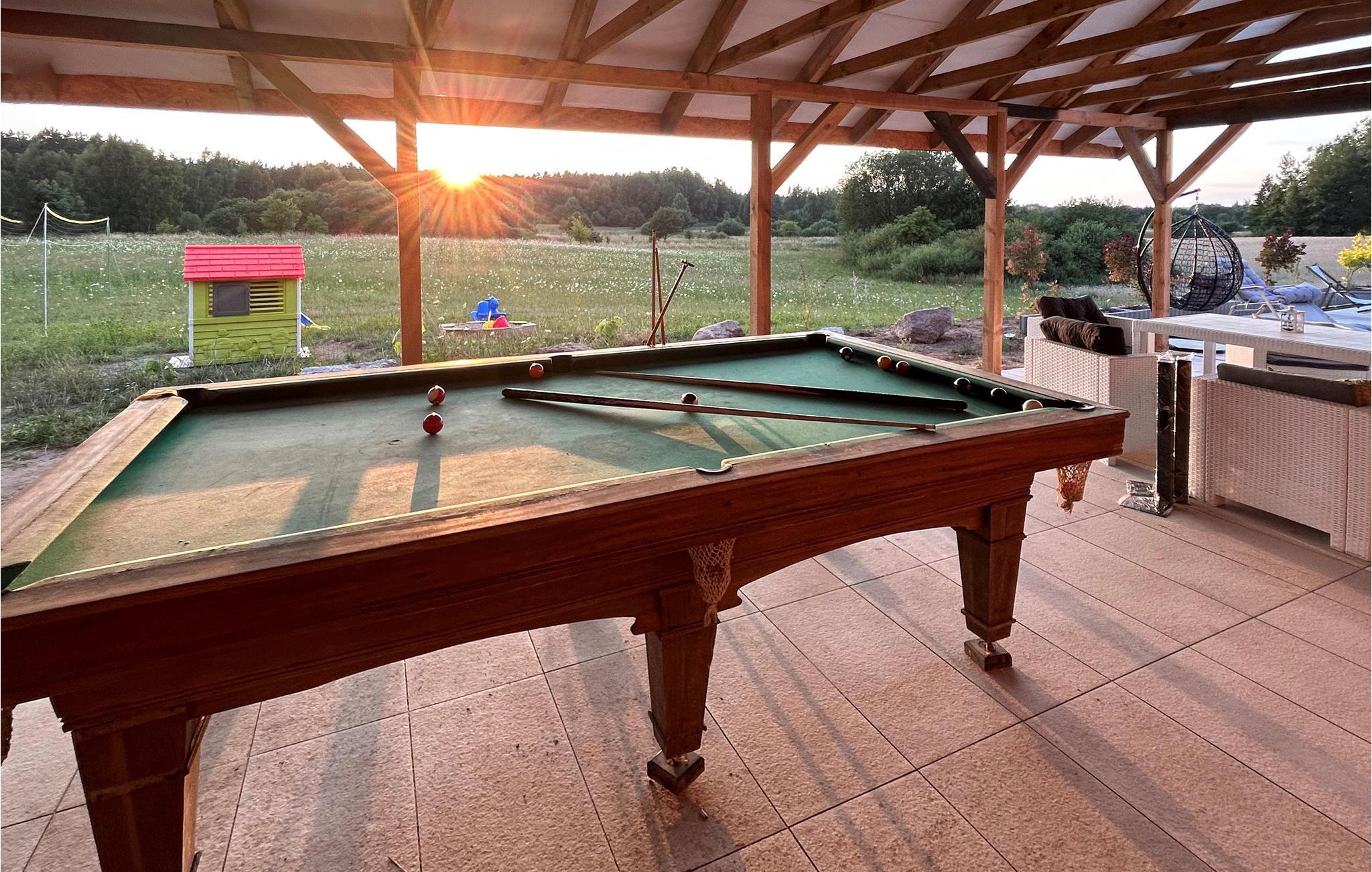 In ländlicher Umgebung nahe dem See und in relativ kurzer Entfernung zur Stadt Mikolajki empfängt Sie dieses Ferienhaus auf zwei Ebenen. Das moderne Interieur und die warme Farbenpalette schaffen eine angenehme Atmosphäre, in der Sie sich wohlfühlen werden. Zaubern Sie gemeinsam in der Küche und genießen Sie eine freudvolle Familienmahlzeit. Draußen gibt es viele lauschige Ecken zum Verweilen. Wer fordert wen beim Billard auf der Terrasse heraus? Niemand, ob jung oder alt, wird sich hier langweilen! Sehen Sie den Kindern beim Spielen zu, wie sie fröhlich buddeln, Badminton spielen oder im gemeinsamen Wellnesspool tauchen, während Sie sich sonnen und ein spannendes Buch im Hängesessel lesen. An heißen Tagen können Sie auf der offenen Terrasse die Markise ausfahren. Spüren Sie die Ruhe und lassen Sie in der Hängematte Körper und Seele baumeln.