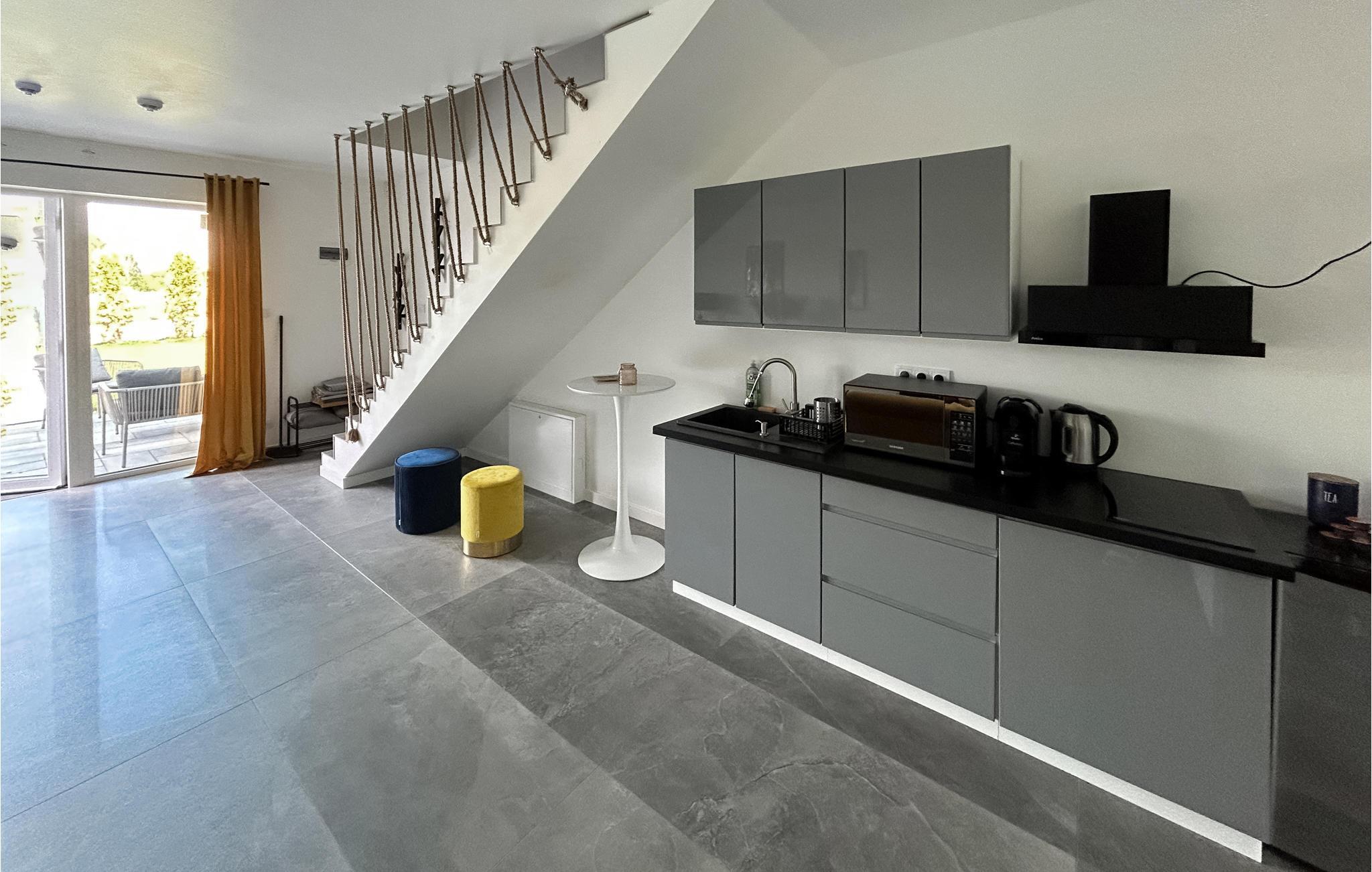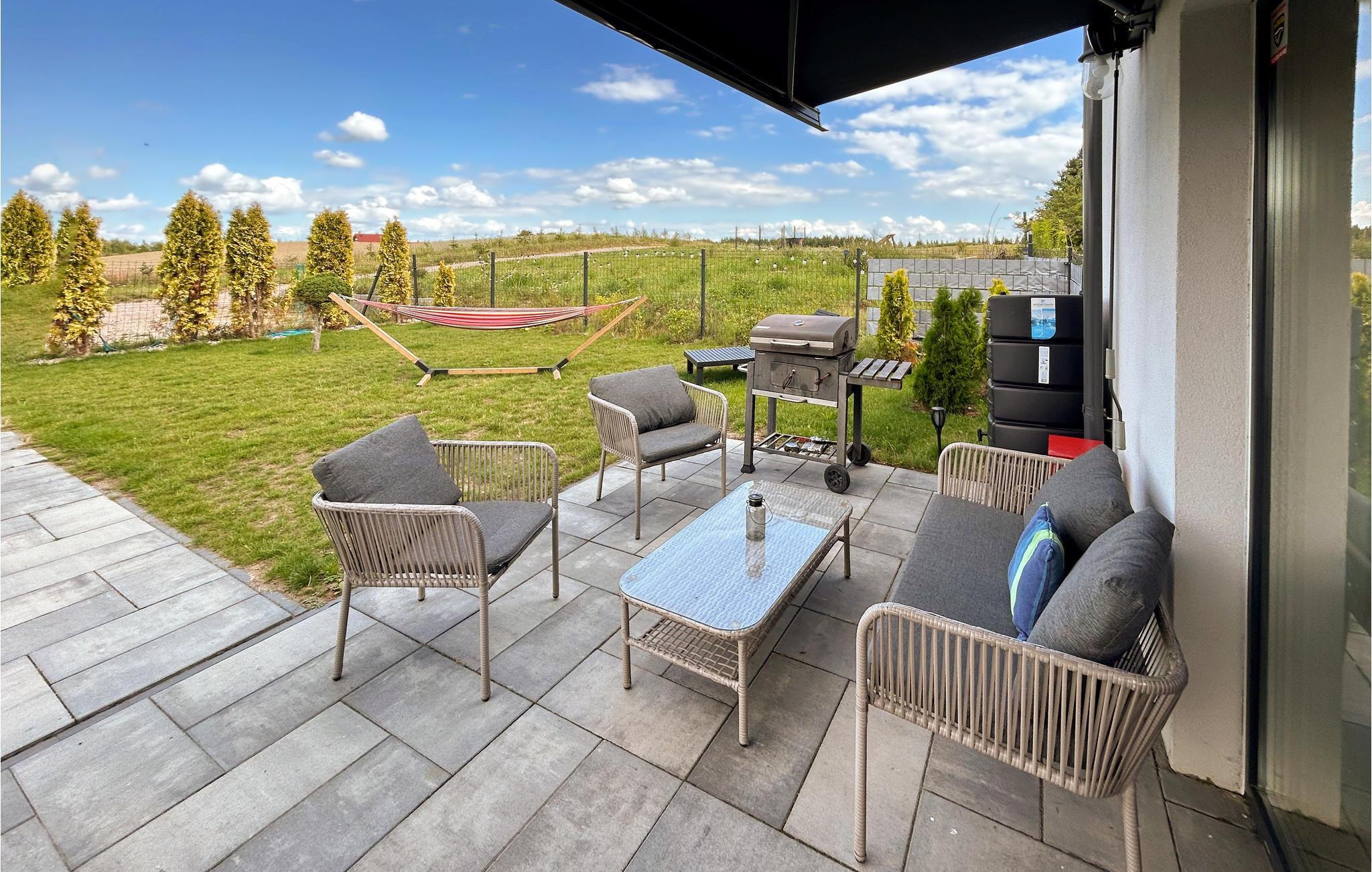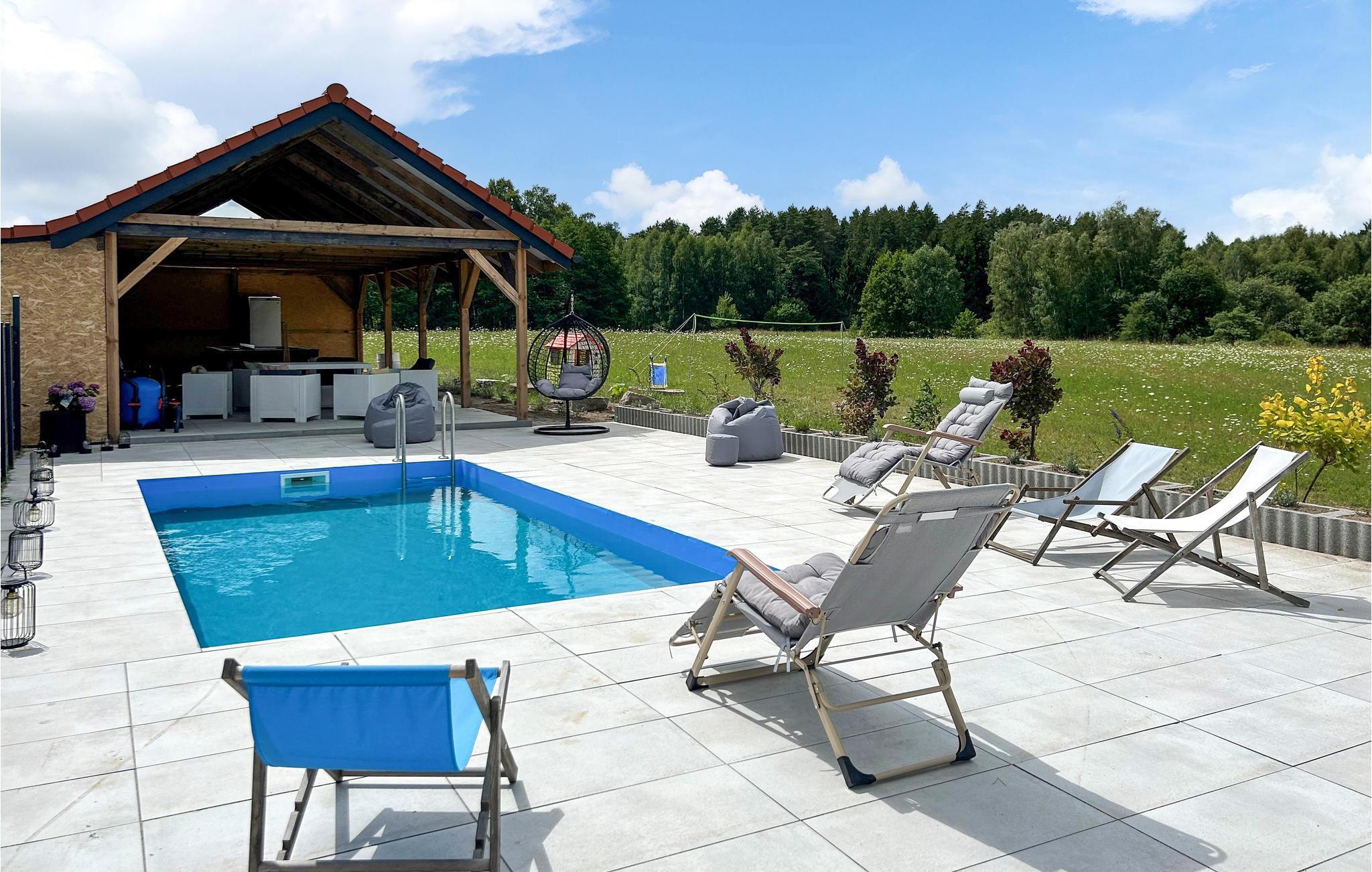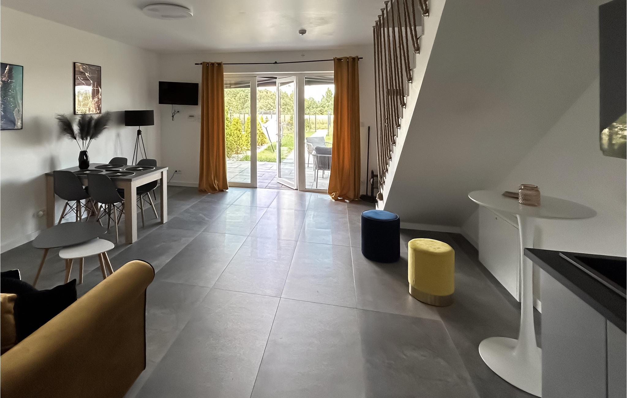 In ländlicher Umgebung nahe dem See und in relativ kurzer Entfernung zur Stadt Mikolajki empfängt Sie dieses Ferienhaus auf zwei Ebenen. Das moderne Interieur und die warme Farbenpalette schaffen eine angenehme Atmosphäre, in der Sie sich wohlfühlen werden. Zaubern Sie gemeinsam in der Küche und genießen Sie eine freudvolle Familienmahlzeit. Draußen gibt es viele lauschige Ecken zum Verweilen. Wer fordert wen beim Billard auf der Terrasse heraus? Niemand, ob jung oder alt, wird sich hier langweilen! Sehen Sie den Kindern beim Spielen zu, wie sie fröhlich buddeln, Badminton spielen oder im gemeinsamen Wellnesspool tauchen, während Sie sich sonnen und ein spannendes Buch im Hängesessel lesen. An heißen Tagen können Sie auf der offenen Terrasse die Markise ausfahren. Spüren Sie die Ruhe und lassen Sie in der Hängematte Körper und Seele baumeln.