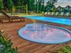 Im Außenbereich genießen Sie ein weitläufiges, liebevoll gestaltetes Areal. Lassen Sie sich zu einer Partie Schach an einem einzigartigen Naturstein-Tisch herausfordern oder verweilen Sie entspannt auf der möblierten Terrasse. Schwimmen Sie im privaten Außenpool oder relaxen Sie im Whirlpool unter freiem Himmel. Eine Gemeinschaftssauna rundet das Wellnessangebot ab. Abends treffen Sie sich am idyllischen Lagerfeuerplatz mit rustikalen Baumstamm-Sitzplätzen zu Musik und gemeinsamen Stunden.